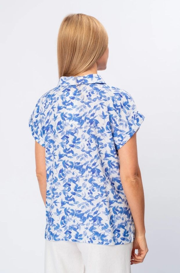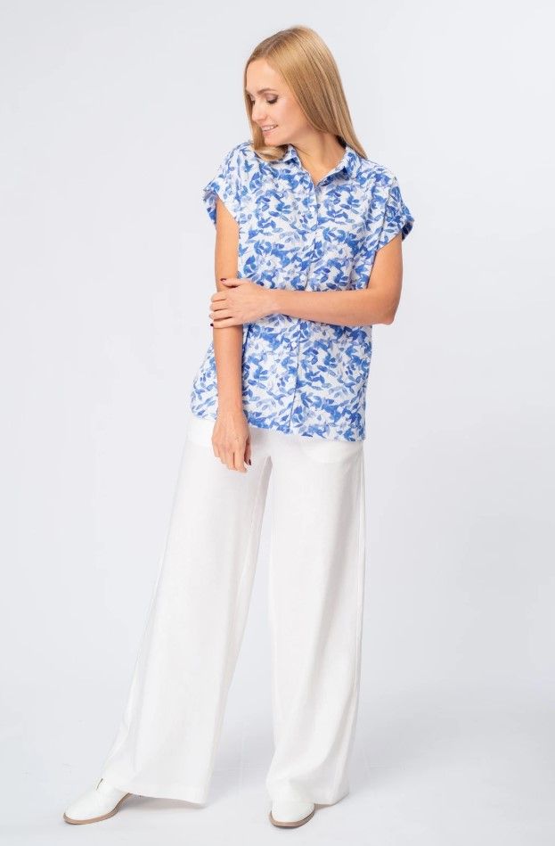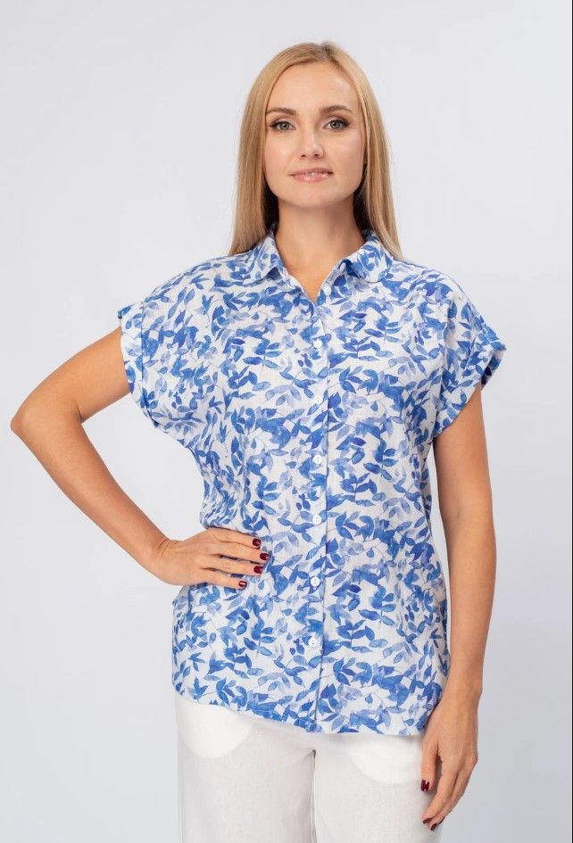 Легкая и воздушная блузка. Изготовлена из высококачественного материала, который приятно ложится на тело и обеспечивает комфорт в течение всего дня. Нежный цветочный принт в сине-белой гамме добавляет образу женственности и романтичности.