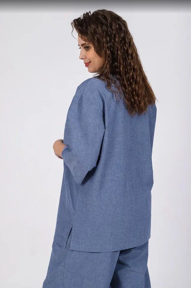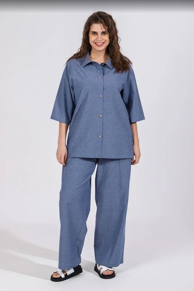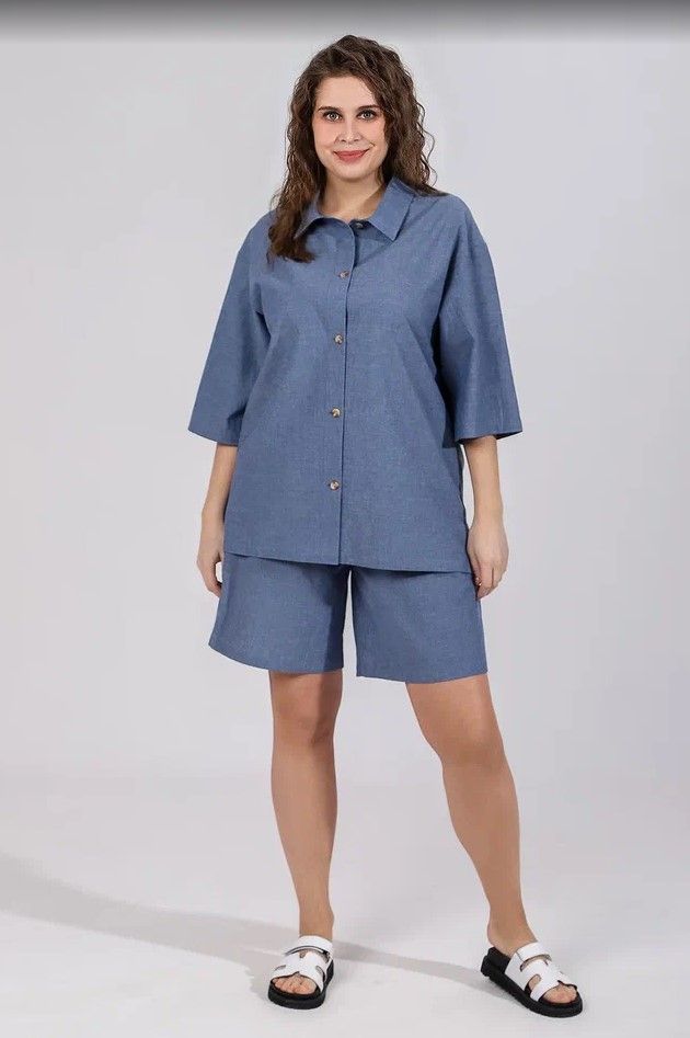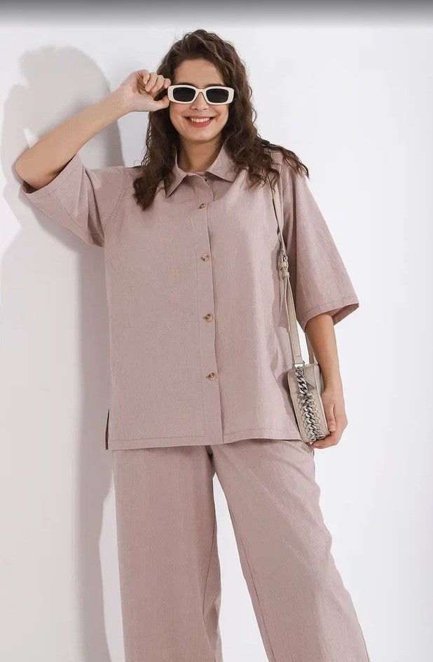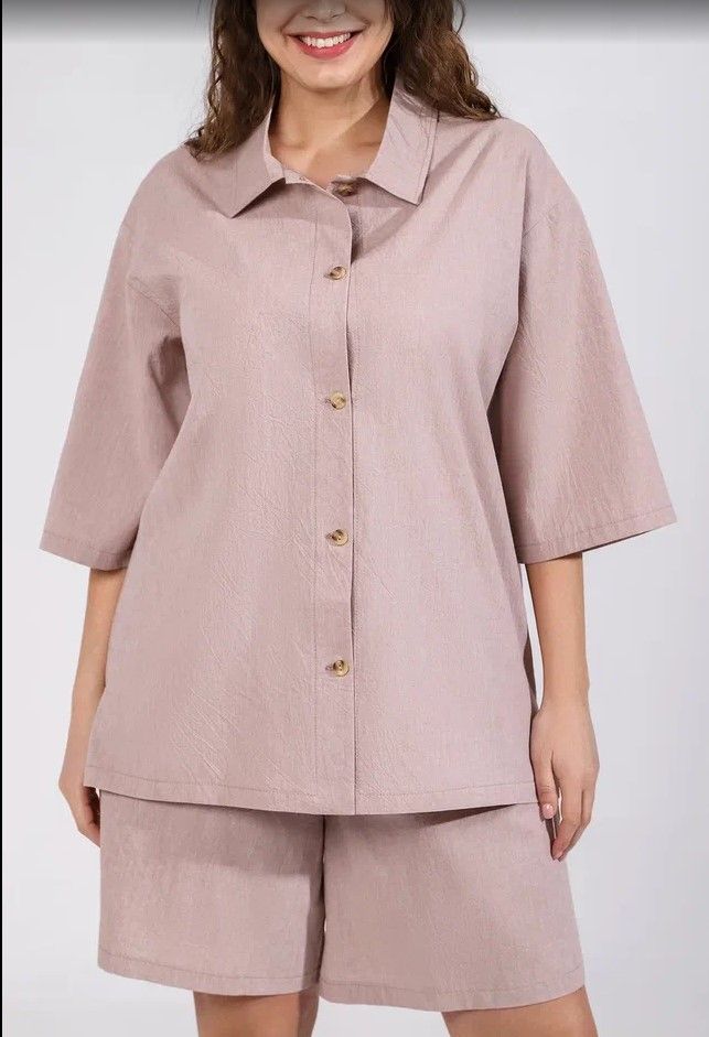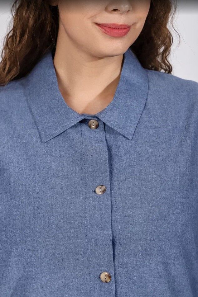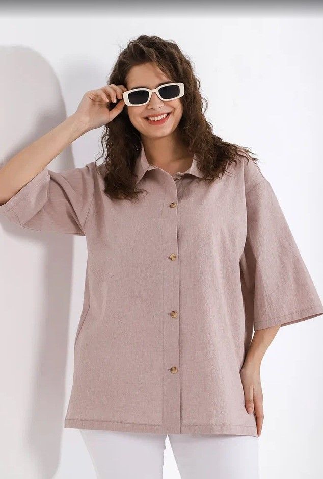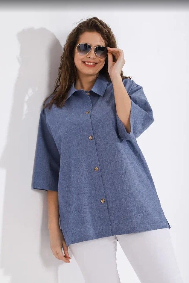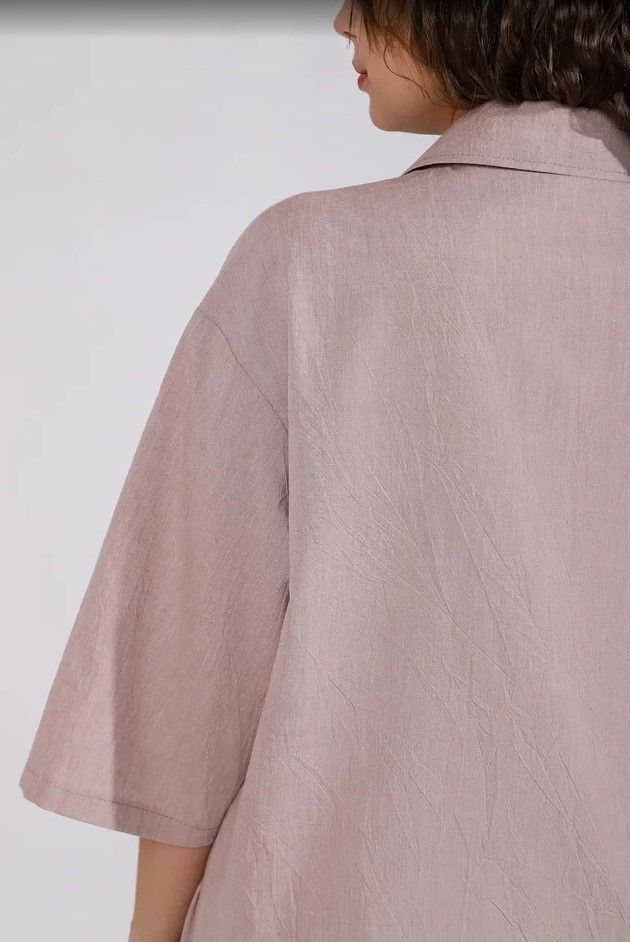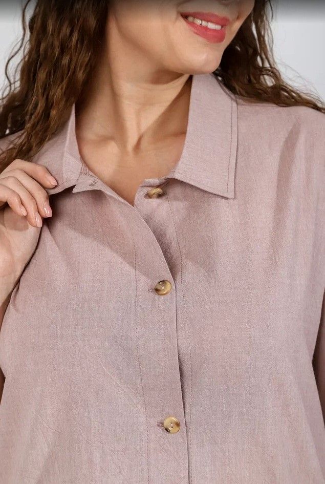 Рубашка женская из тканого гладкокрашеного полотна «вареный хлопок», свободного покроя, с короткими втачными рукавами, стояче-отложным воротником, центральной бортовой застежкой на обметанные петли и пуговицы. По боковым швам выполнены разрезы.