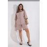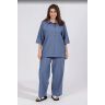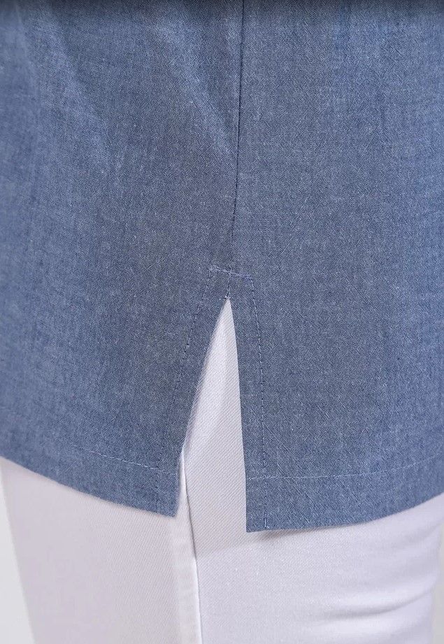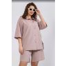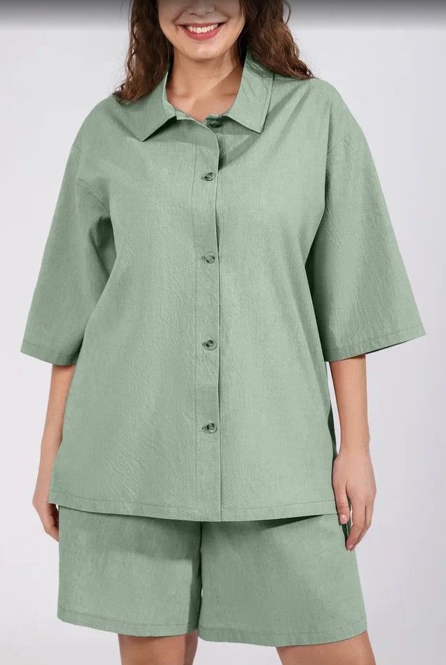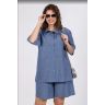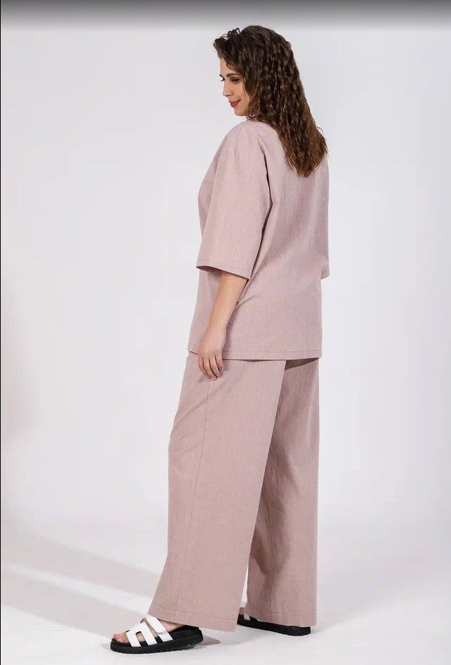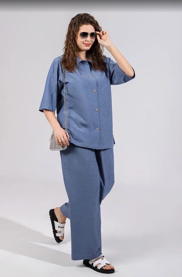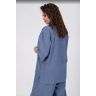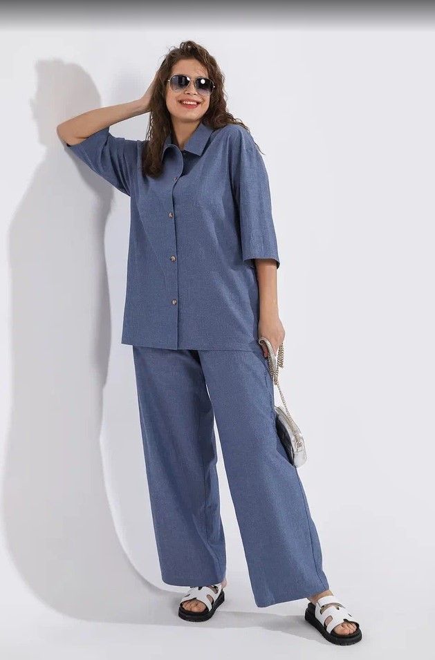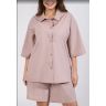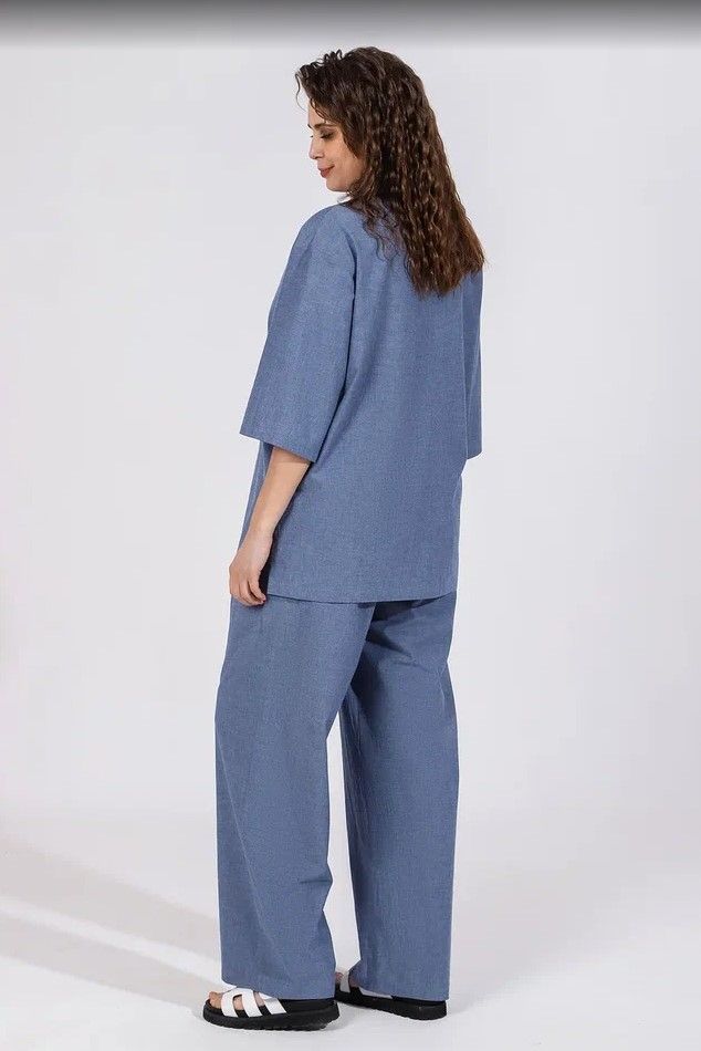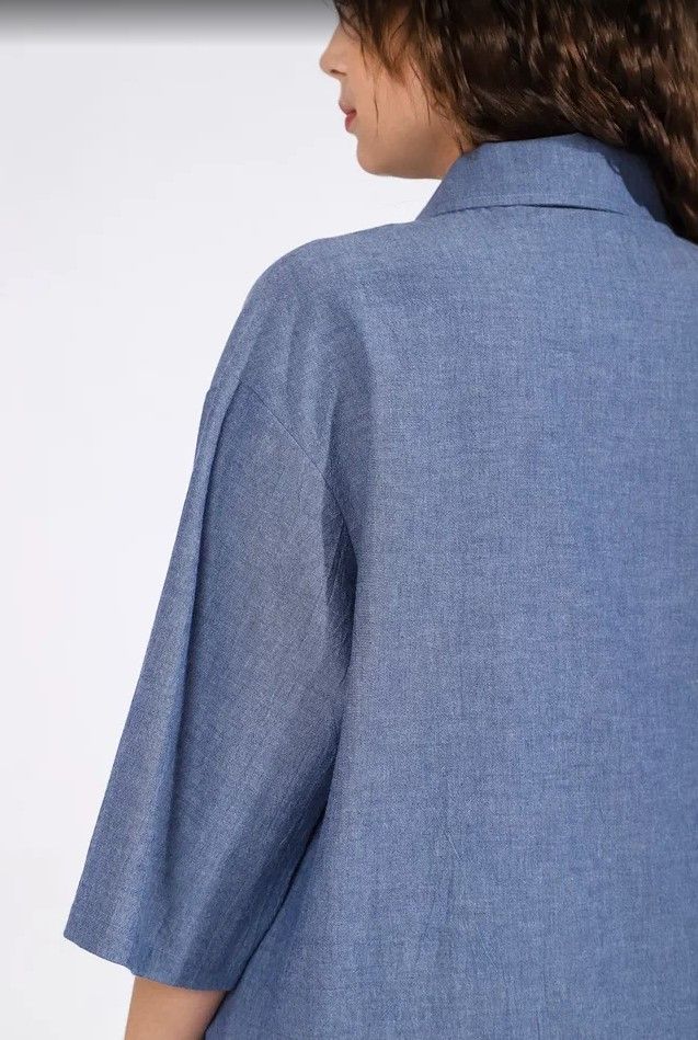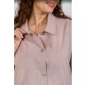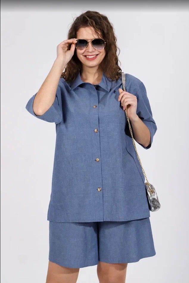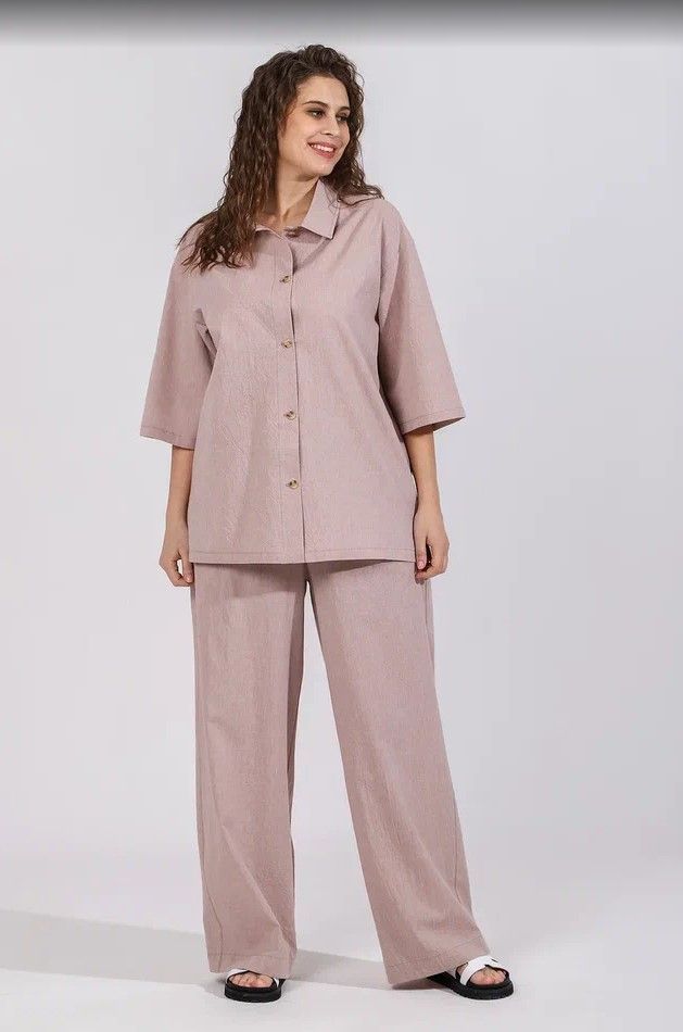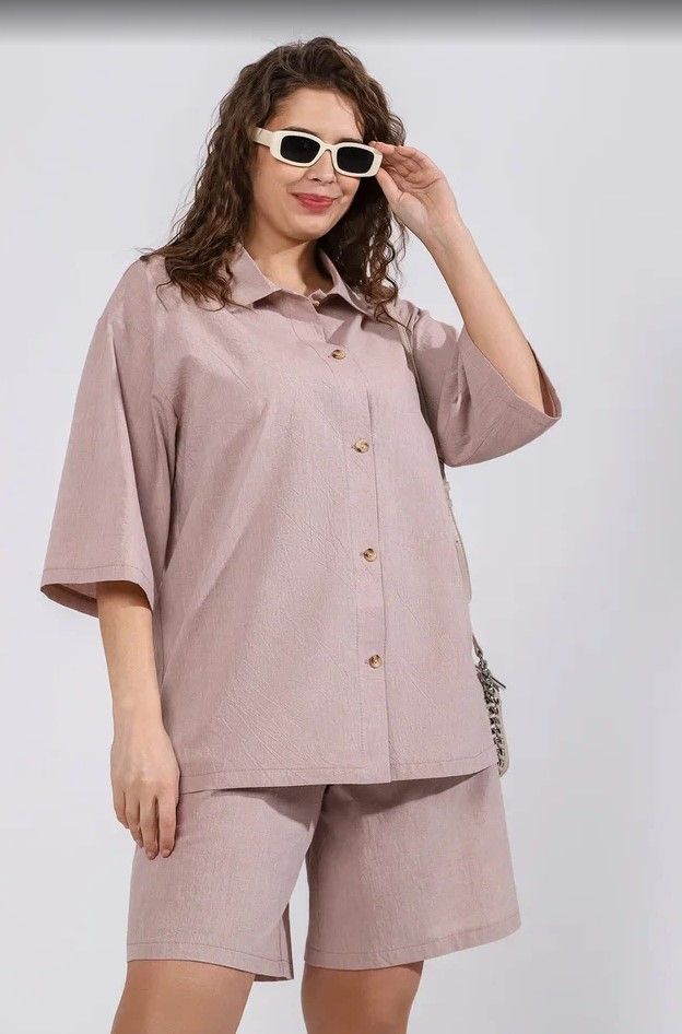 Рубашка женская из тканого гладкокрашеного полотна «вареный хлопок», свободного покроя, с короткими втачными рукавами, стояче-отложным воротником, центральной бортовой застежкой на обметанные петли и пуговицы. По боковым швам выполнены разрезы.