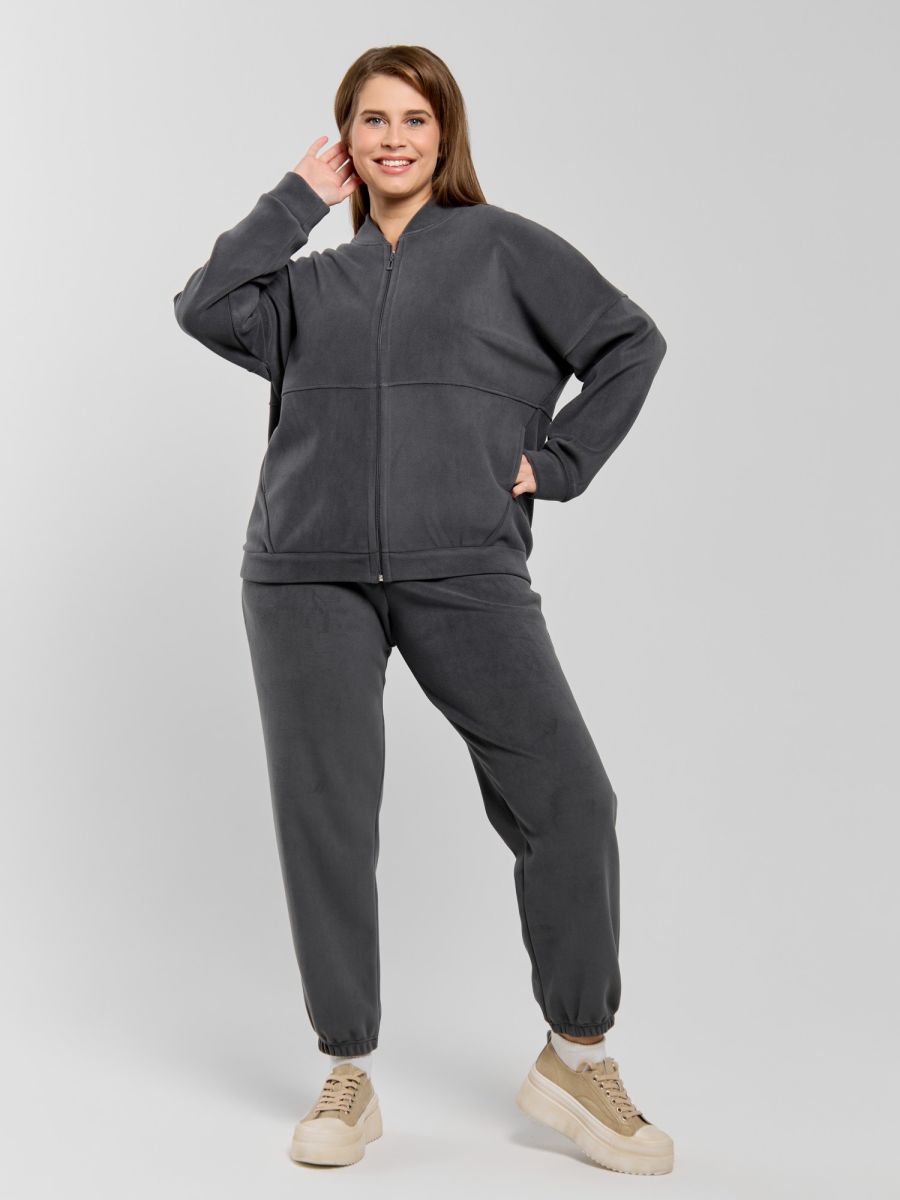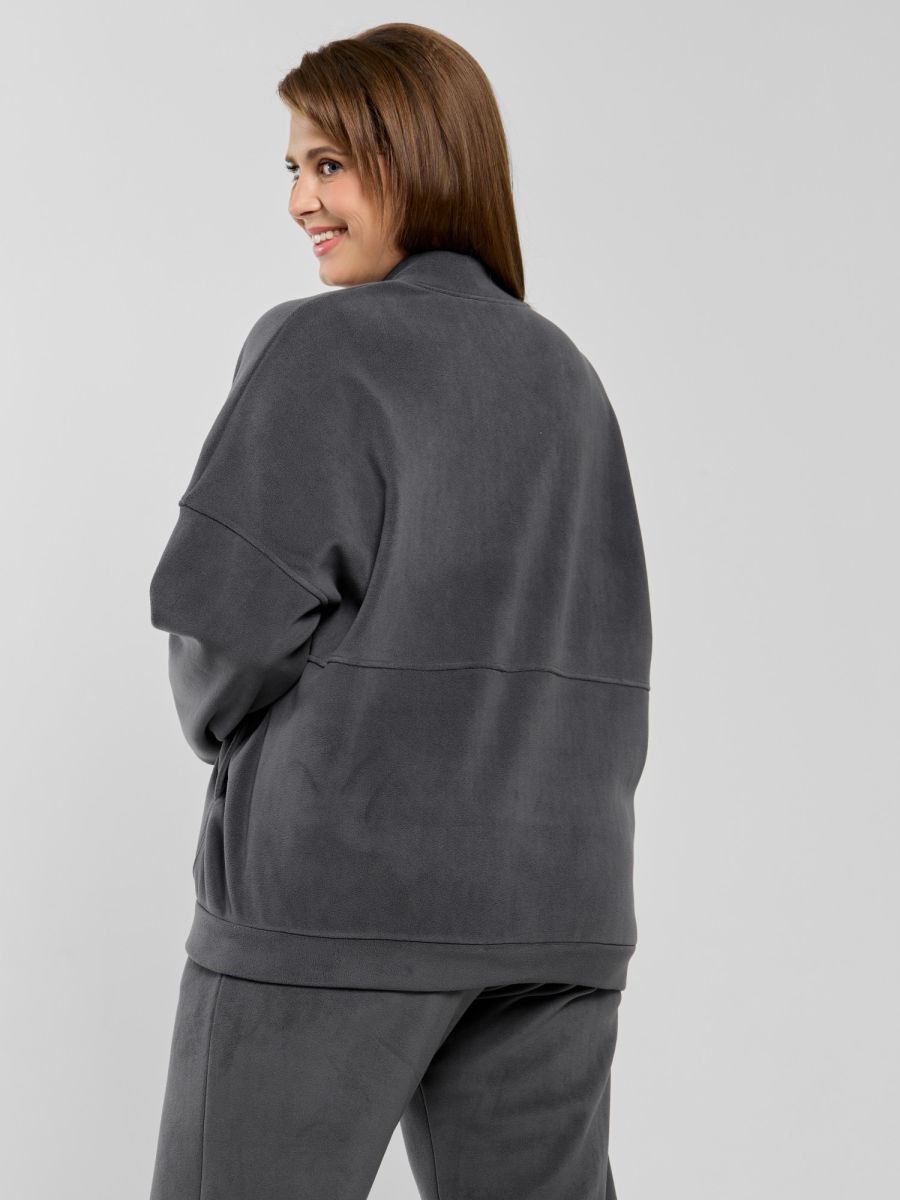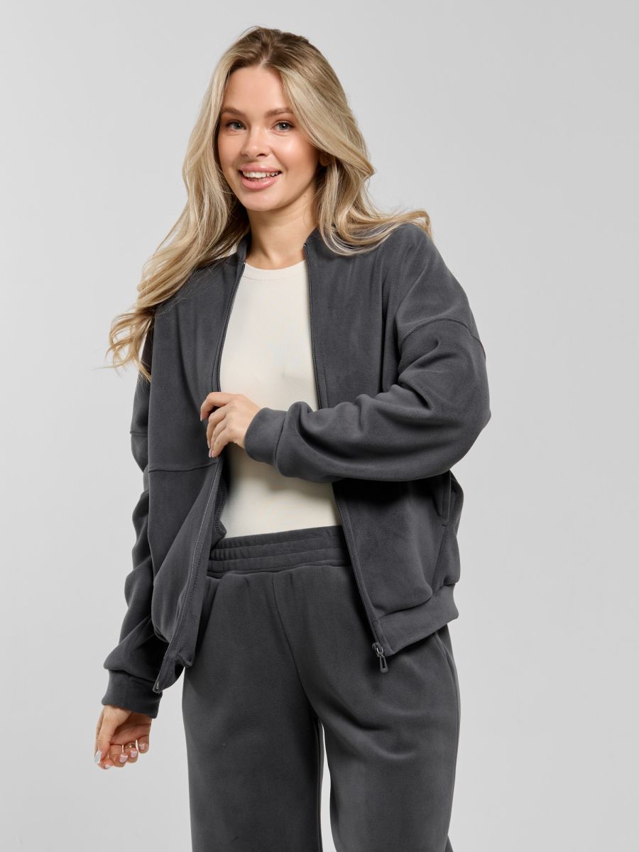 Куртка-бомбер – молодежная из гладкокрашенного трикотажного полотна «дабл-флис» (двухсторонний флис) прямого силуэта, свободная, с длинными втачными рукавами, горловиной овальной формы, обработанной втачной планкой, центральной бортовой застежкой на тесьму «молния». Полочка и спинка состоят из двух деталей, низ изделия с притачным поясом, рукава с притачными манжетами. Пояс, планка горловины, манжеты рукавов выполнены из основного материала.