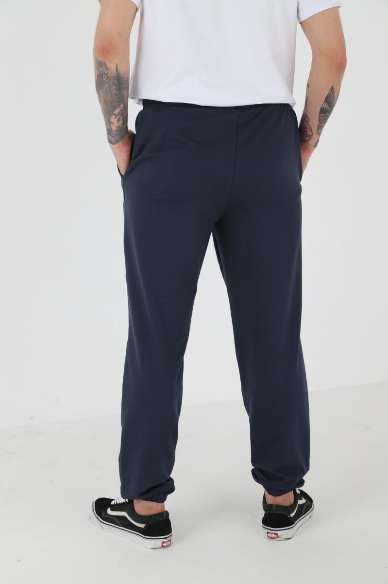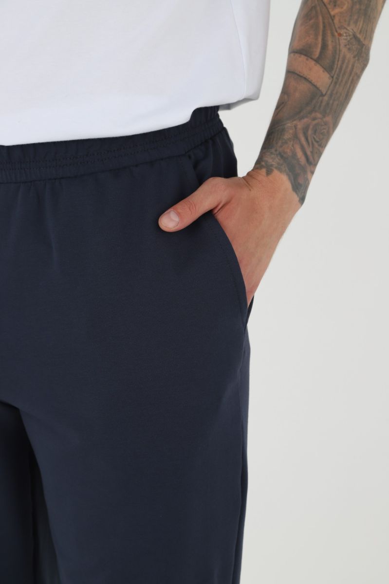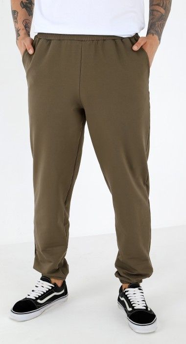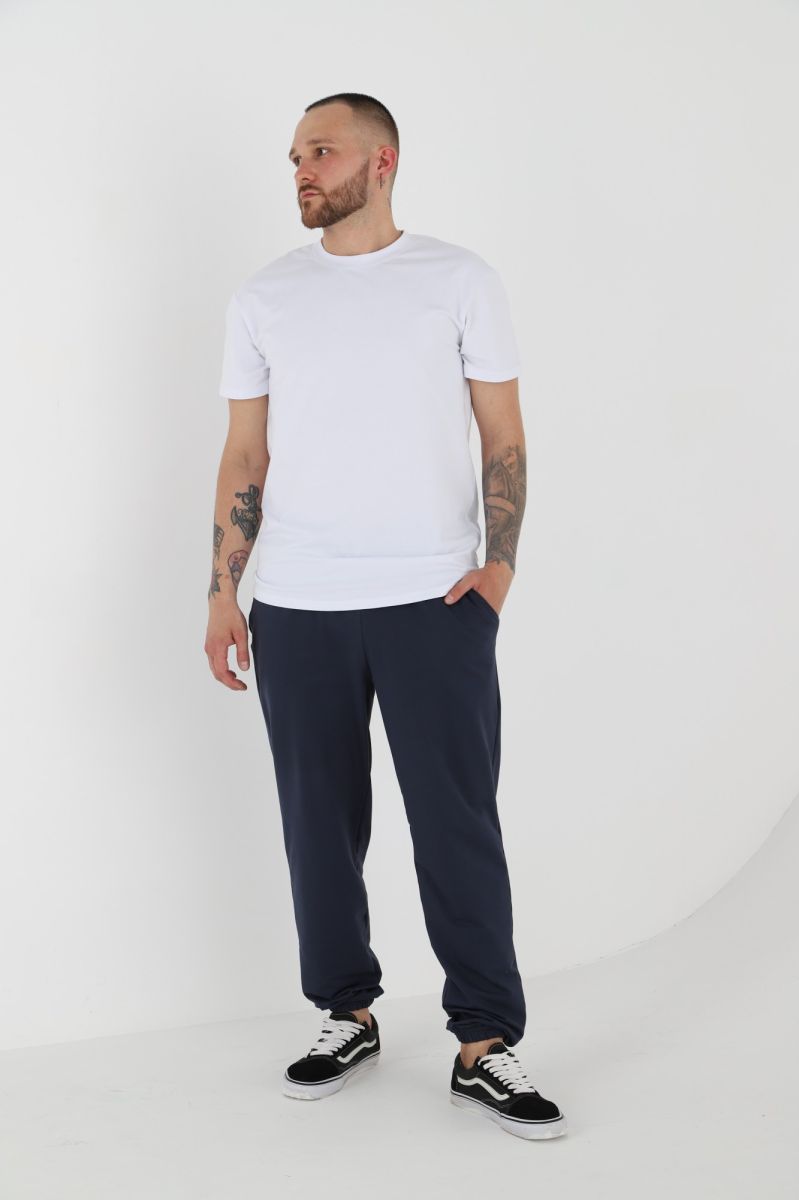 Базовые мужские брюки из футера с лайкрой. Модель с боковыми карманами, на притачном поясе с отстроченной эластичной тесьмой и внутренним шнуром для регулировки плотности посадки на талии. Низ брючин с эластичной тесьмой.
