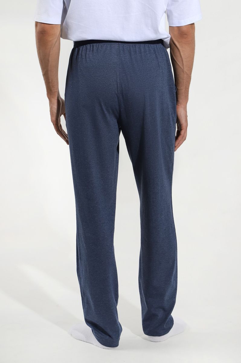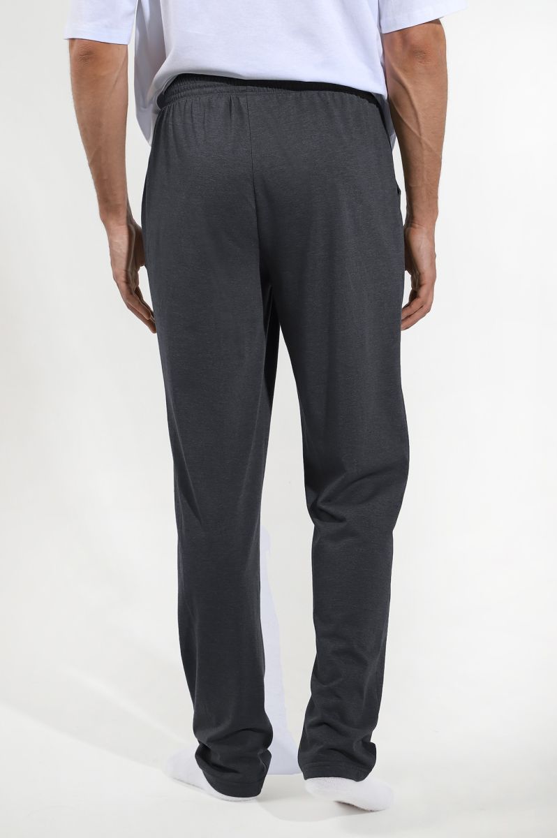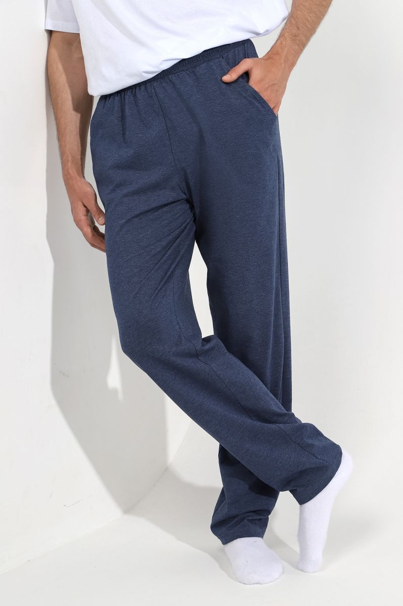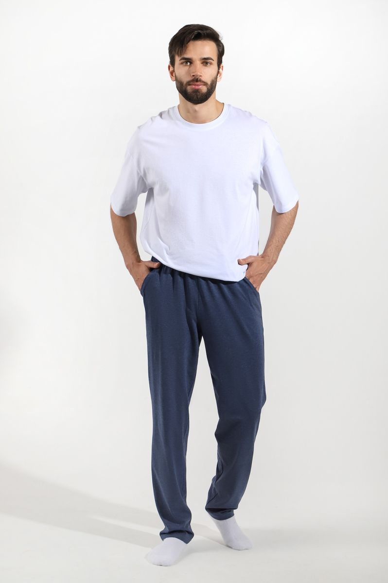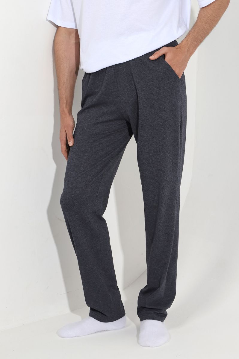 Брюки мужские из меланжированного трикотажного полотна "кулирка", прямого силуэта, с карманами в боковых швах, на притачном поясе с эластичной тесьмой внутри.