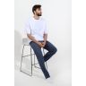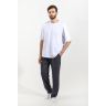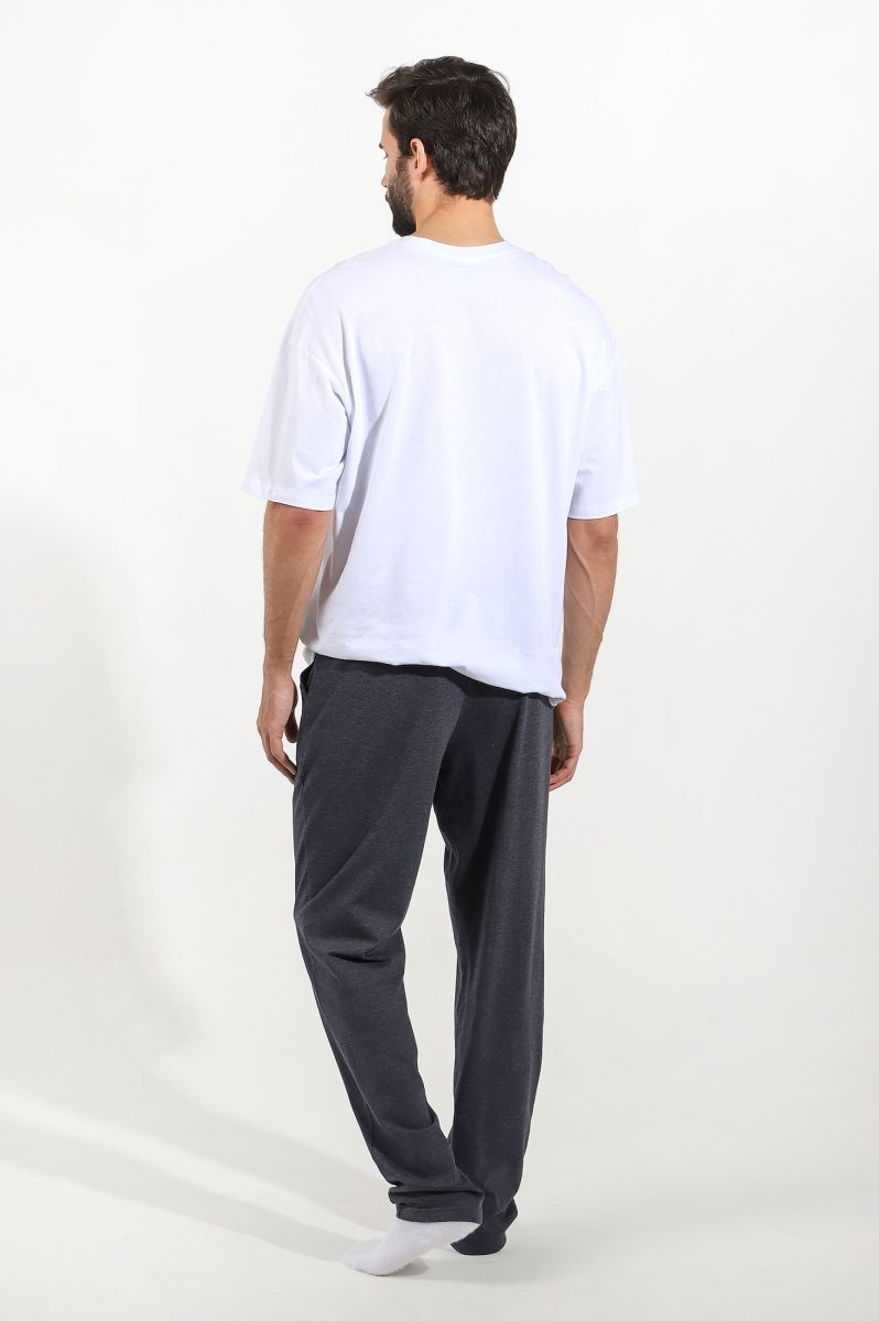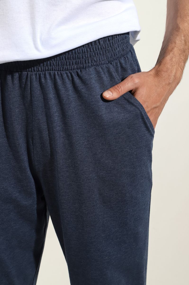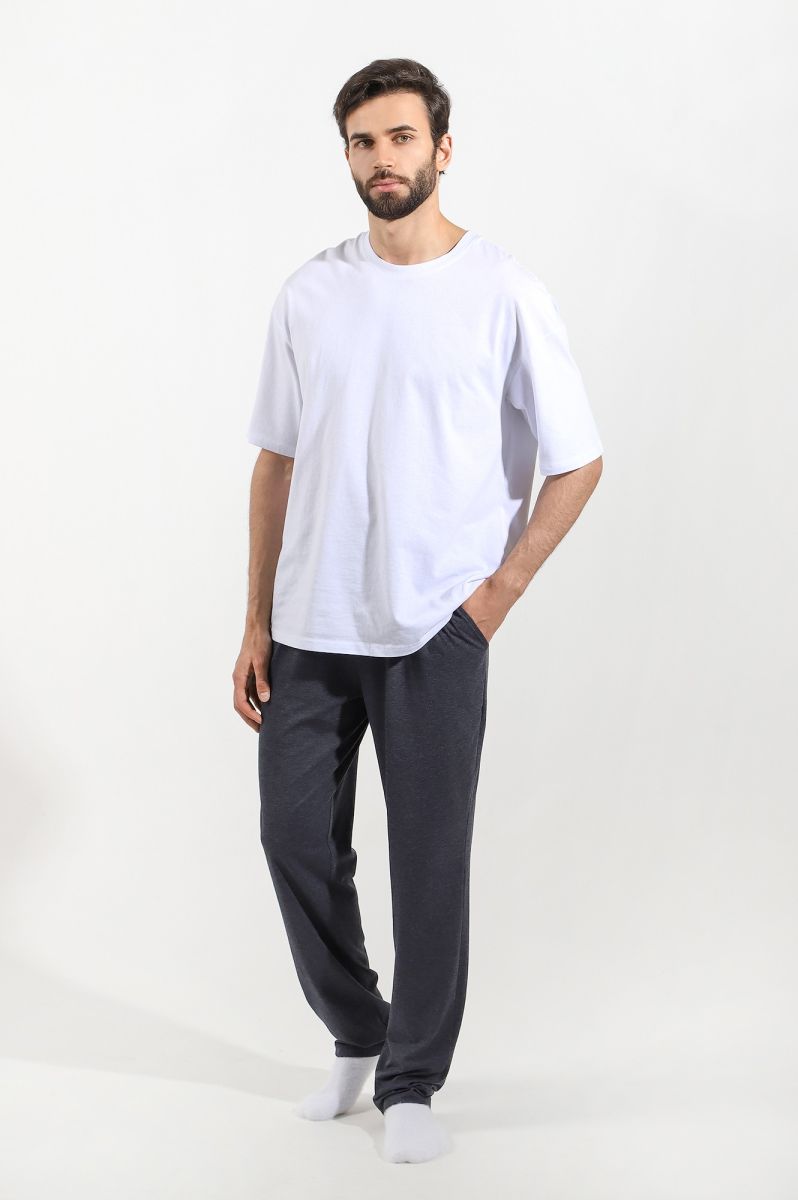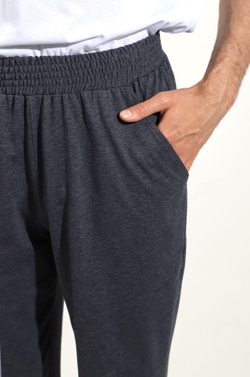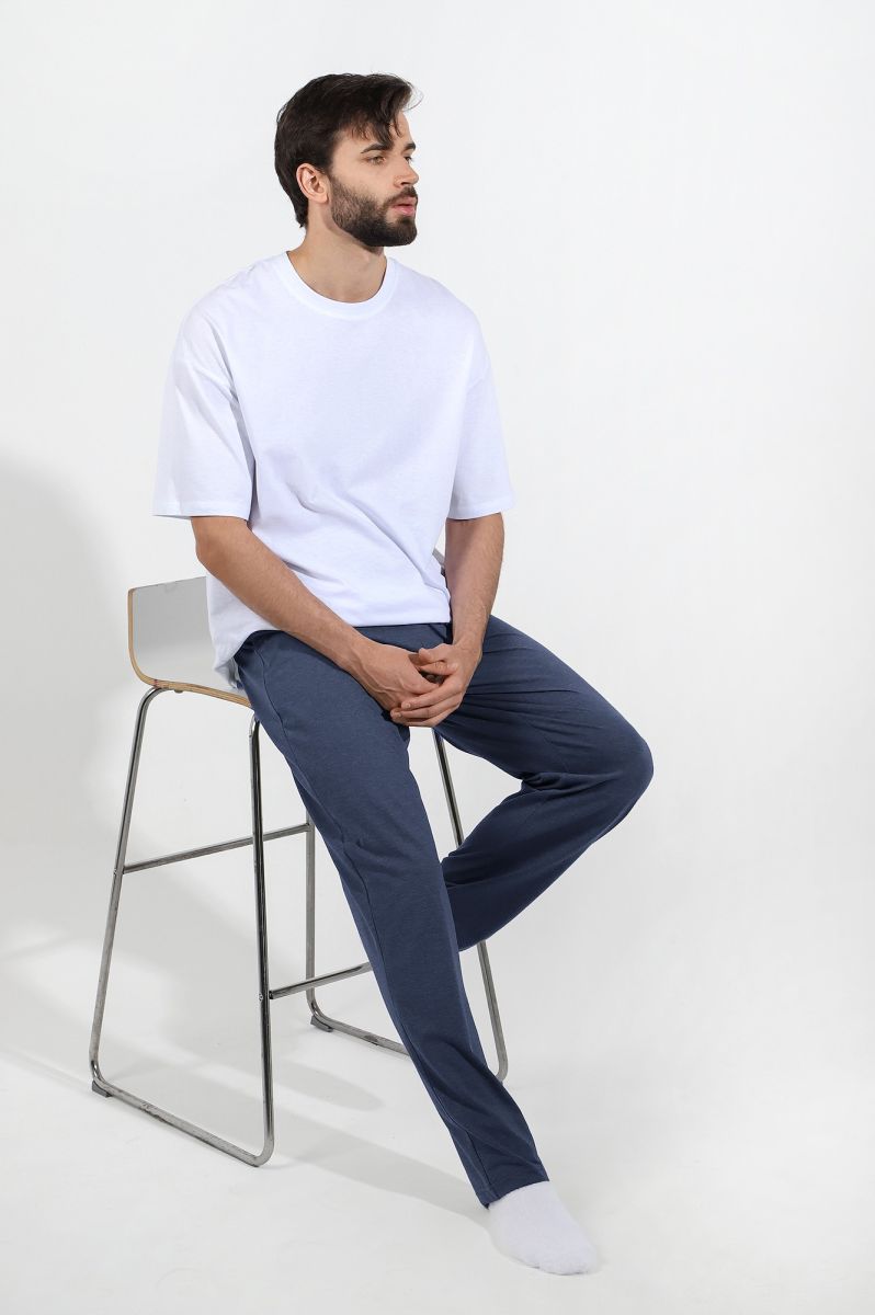 Брюки мужские из меланжированного трикотажного полотна "кулирка", прямого силуэта, с карманами в боковых швах, на притачном поясе с эластичной тесьмой внутри.