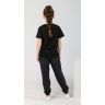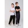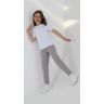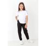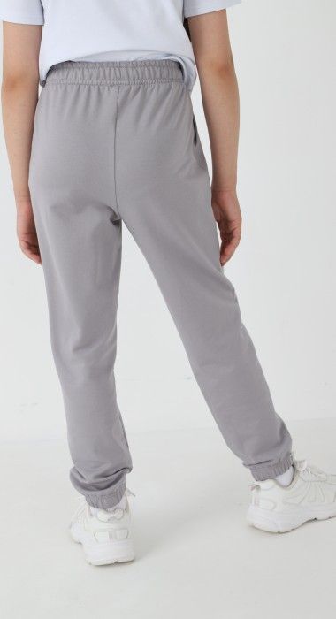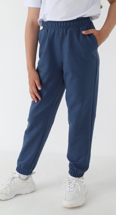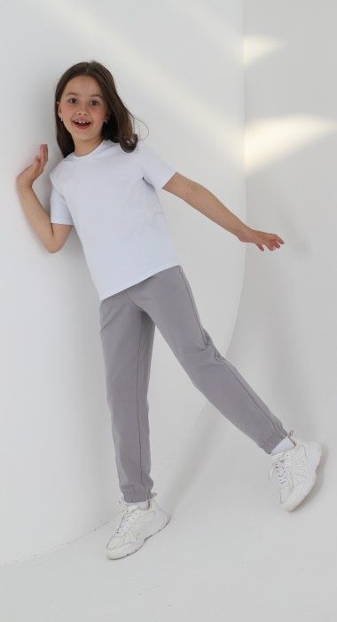 Базовые брюки из футера с лайкрой для девочки. Модель с боковыми карманами, на притачном поясе с отстроченной эластичной тесьмой и внутренним шнуром для регулировки плотности посадки на талии. Низ брючин с эластичной тесьмой.