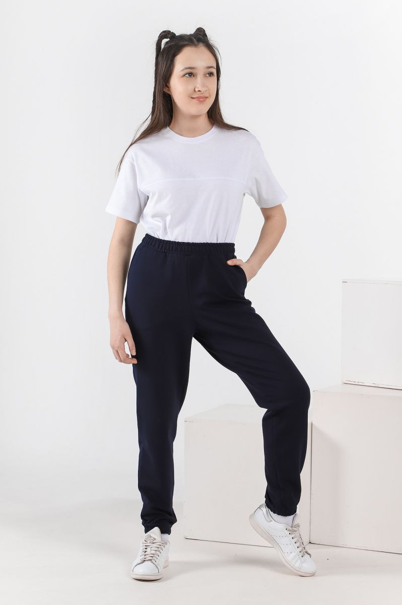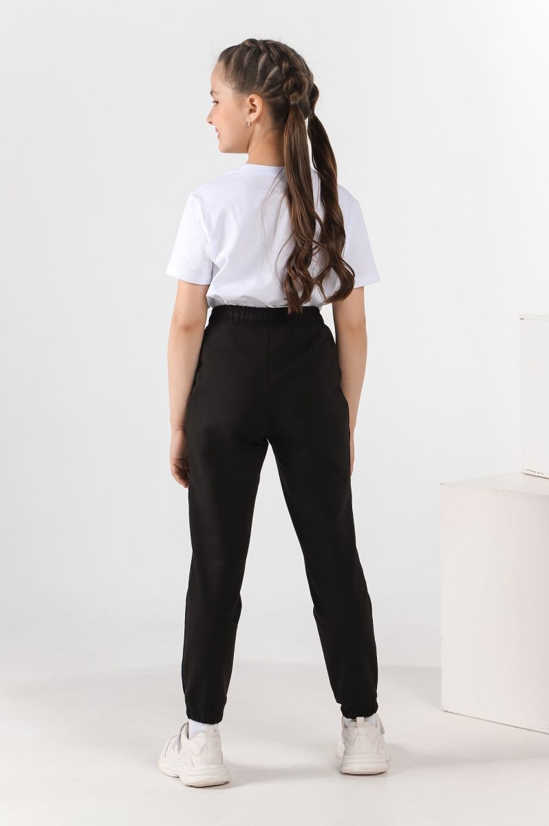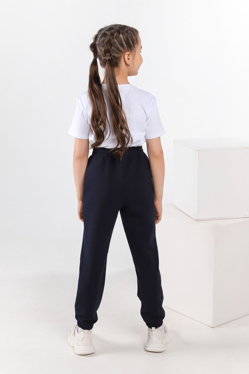 Базовые брюки из футера с лайкрой для девочки. Модель с боковыми карманами, на притачном поясе с отстроченной эластичной тесьмой и внутренним шнуром для регулировки плотности посадки на талии. Низ брючин с эластичной тесьмой.