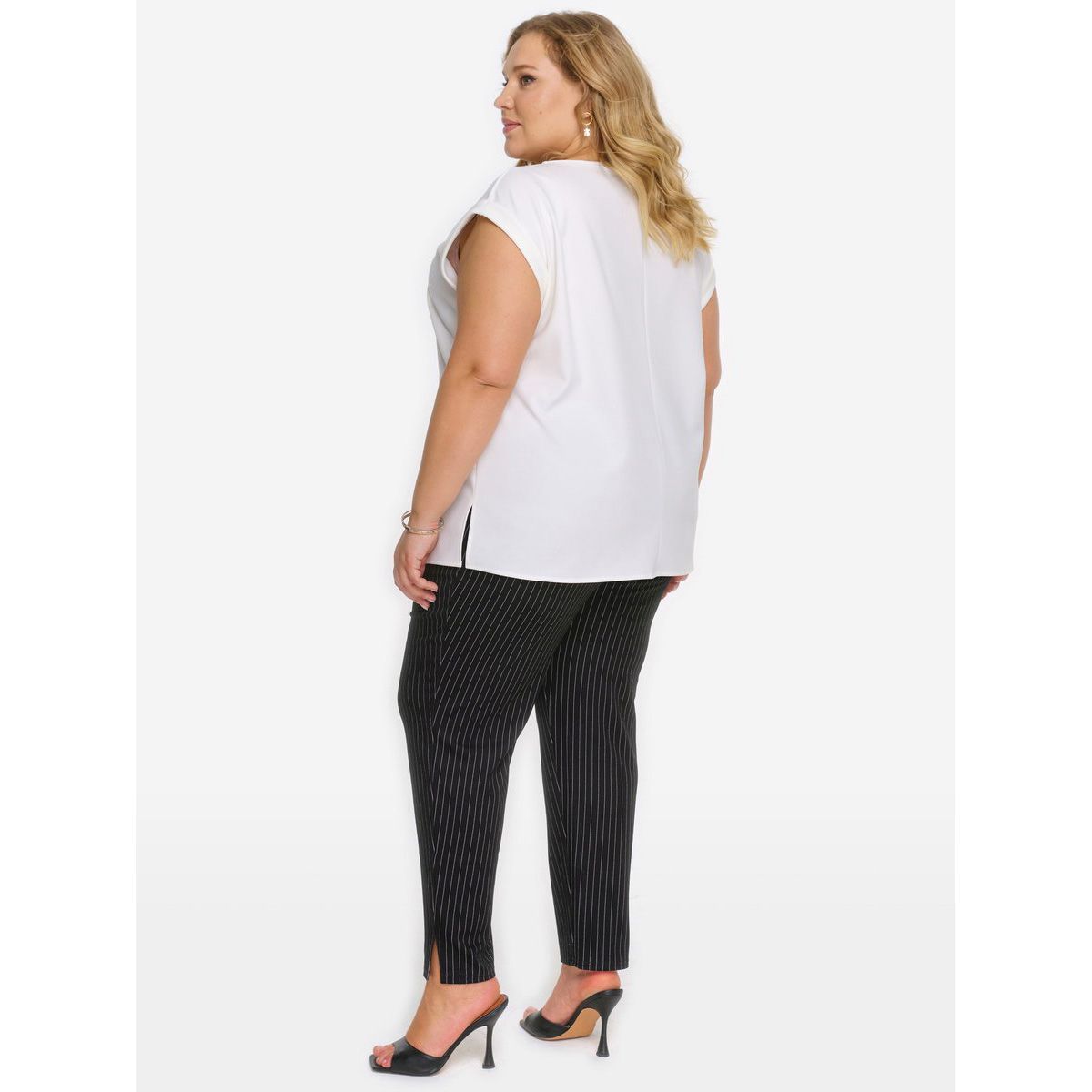 Брюки прямые из джерси. В боковых швах карманы с отрезным бочком. Пояс брюк на резинке, центральная часть переда пояса гладкая.