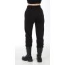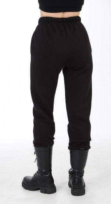 Брюки из трикотажного меланжированного полотна «футер-трехнитка», длинные, с карманами в боковых швах и эластичной тесьмой по талии. Передние половины – из трех частей каждая. Нижние срезы обработаны подгибкой с эластичной тесьмой. В подгибку верхнего среза через две обметанные петли для регулирования степени прилегания брюк по талии вставлен шнур, завязывающийся спереди.