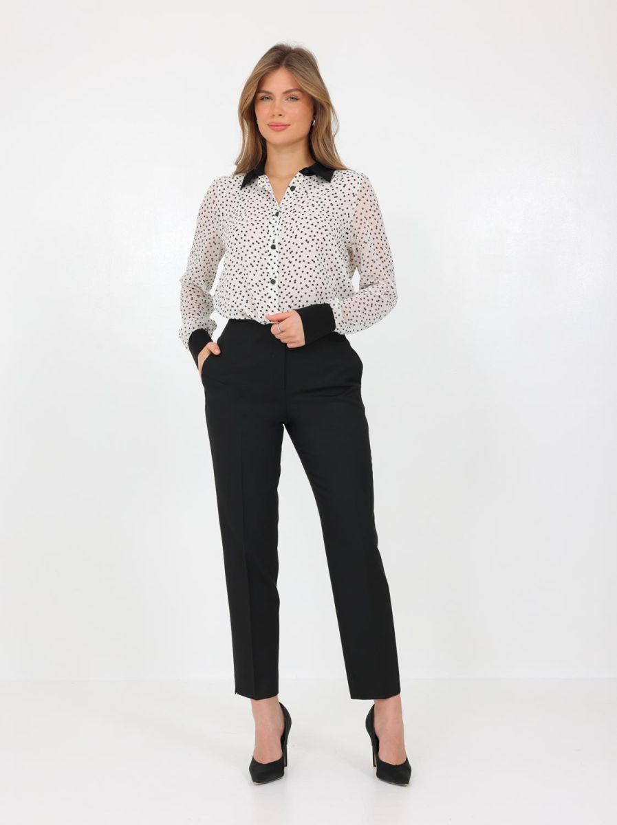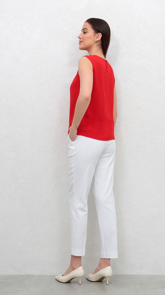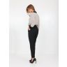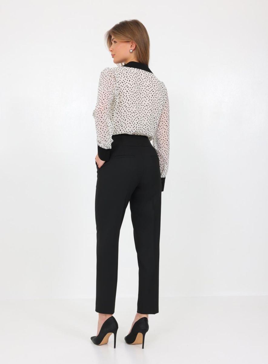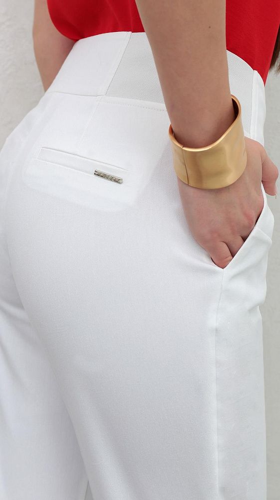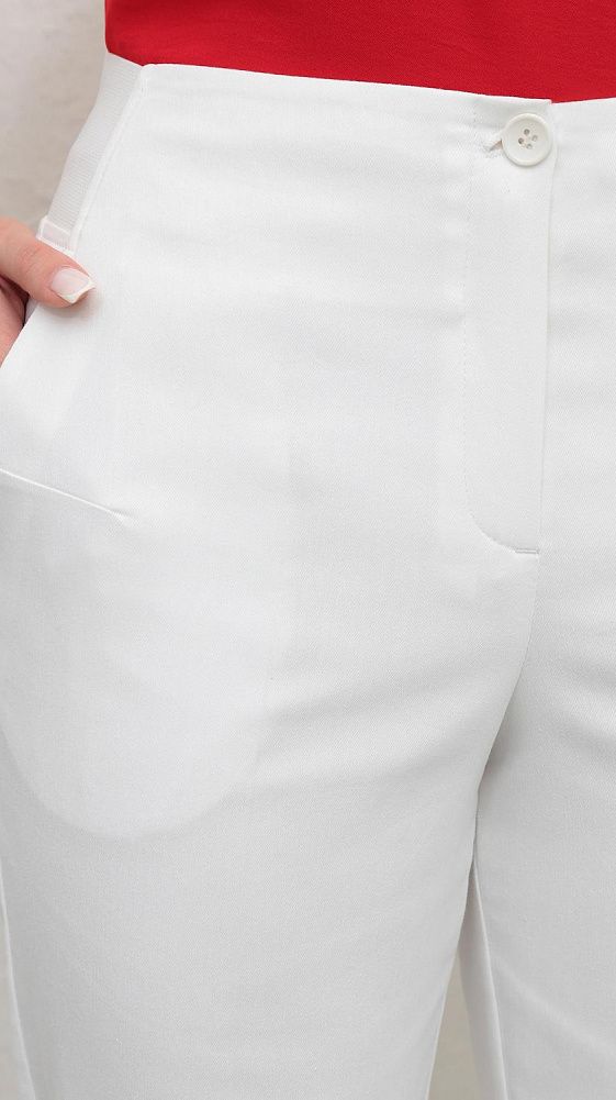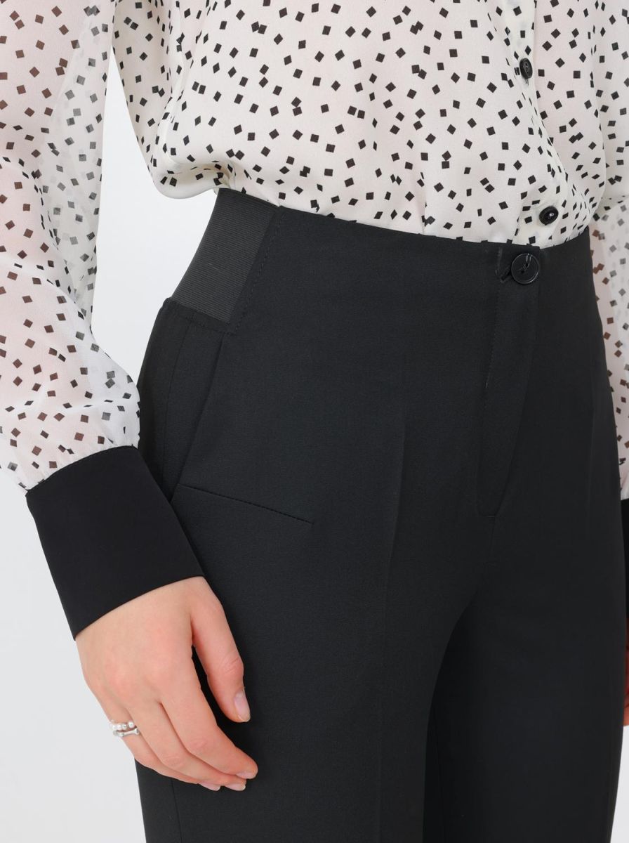 Брюки средней посадки, с функциональными карманами спереди. Застежка на молнию и пуговицу. Пояс частично из резинки. Внизу боковых швах разрезы.