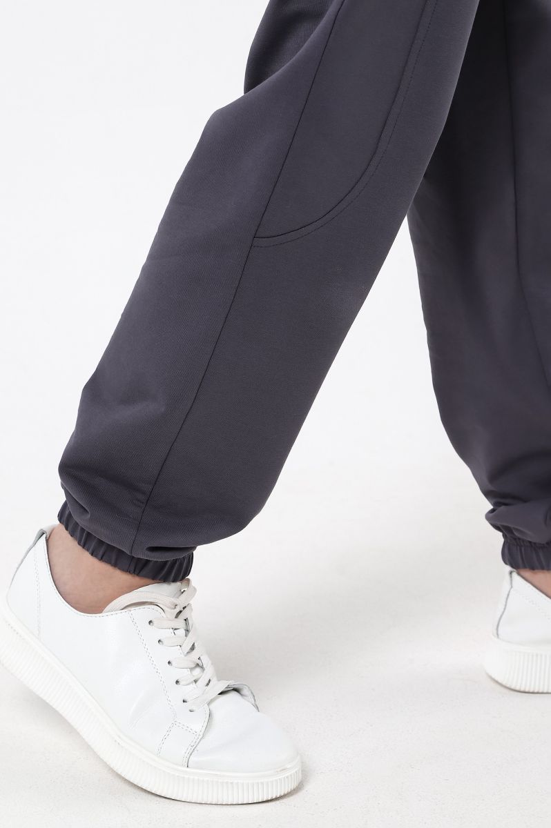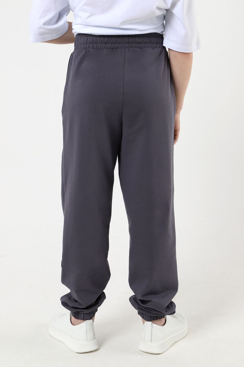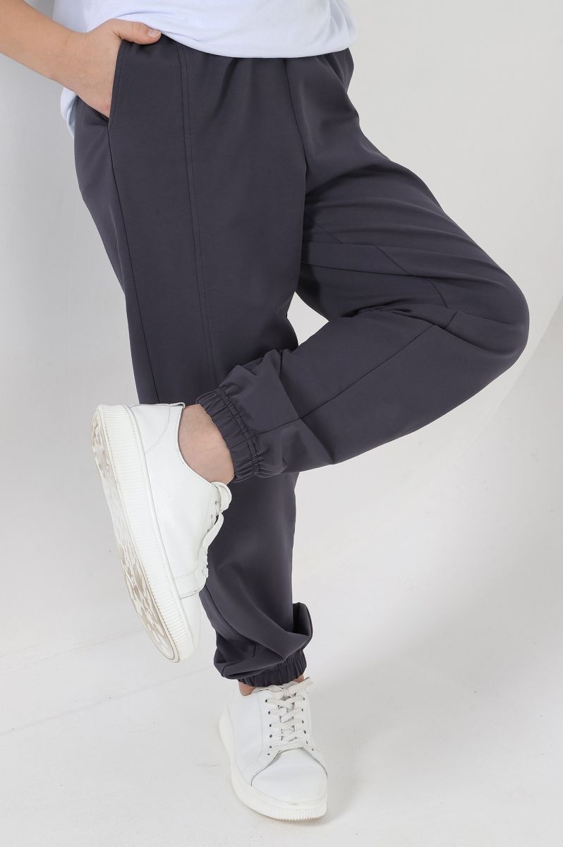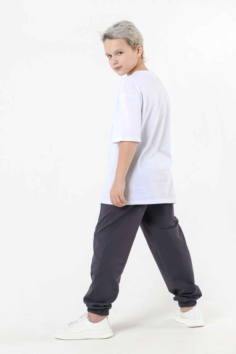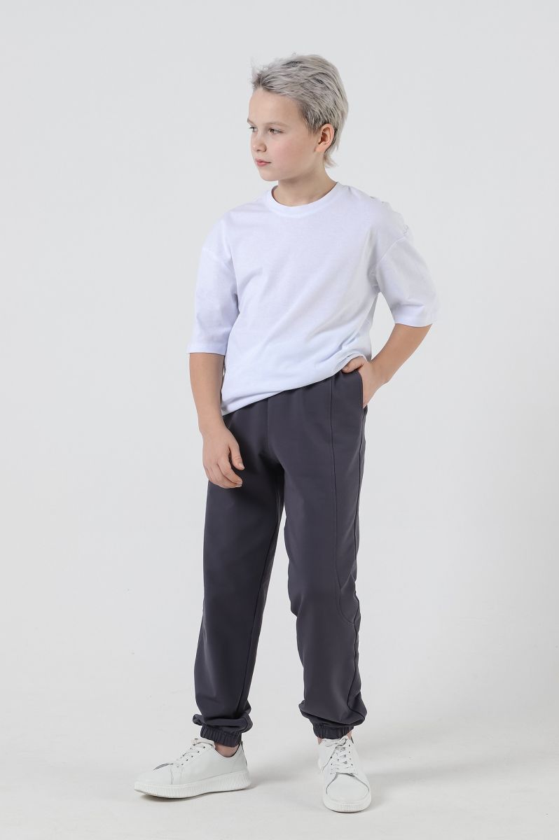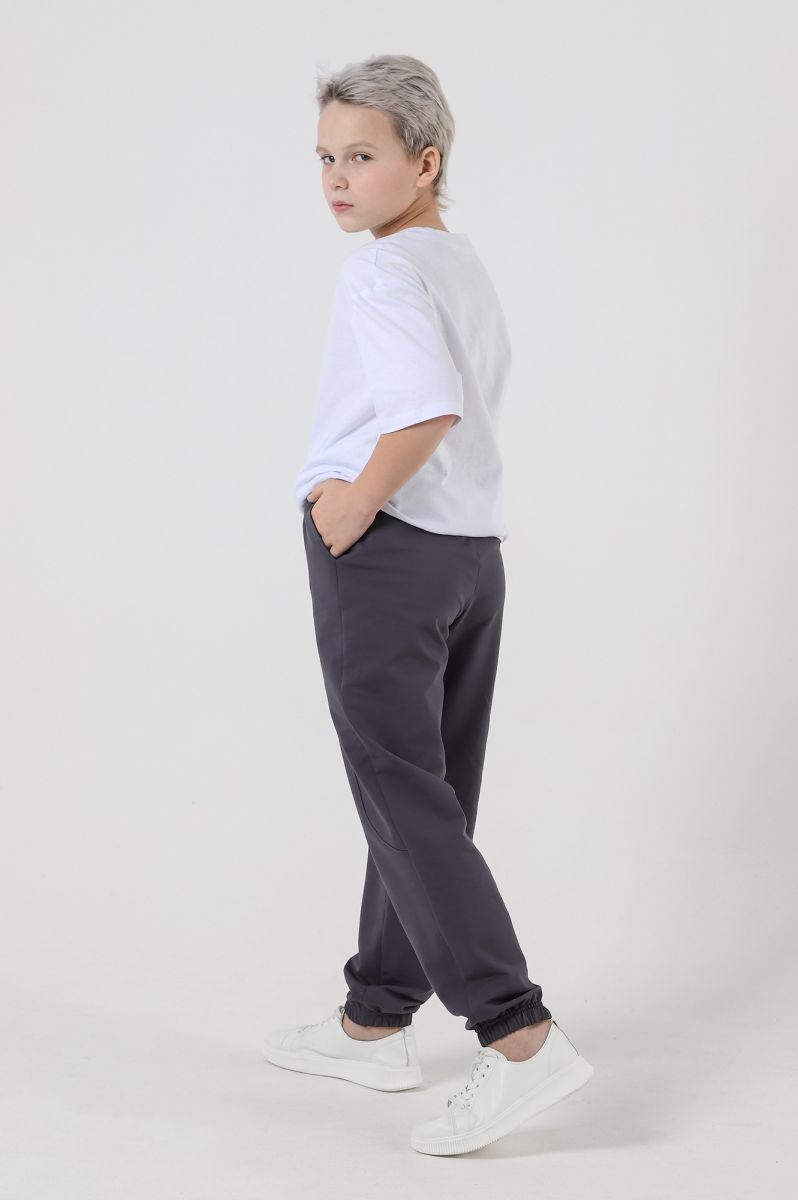 Брюки для мальчика изгладкокрашеного полотна "футер-двухнитка", на притачном поясе с эластичной тесьмой внутри и карманами в боковых швах. Средние половинки - из двух частей каждая, с отделочными строчками по швам стачивания. Нижние срезы обработаны подгибкой сэластичной тесьмой.
