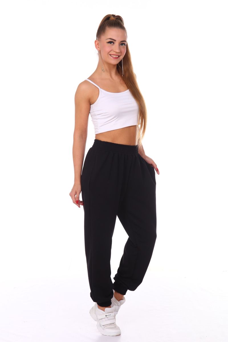Брюки свободного покроя в стиле "over size" с карманами в боковых швах. Верх брюк с эластичной тесьмой, низ с манжетами. Пояс и манжеты прострочены на поясной машине