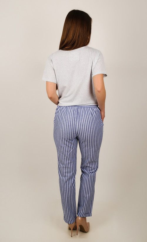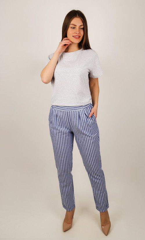 Зауженные брюки на резинке. Имеются боковые карманы. Особенности: манжеты по низу; складки в передней части.