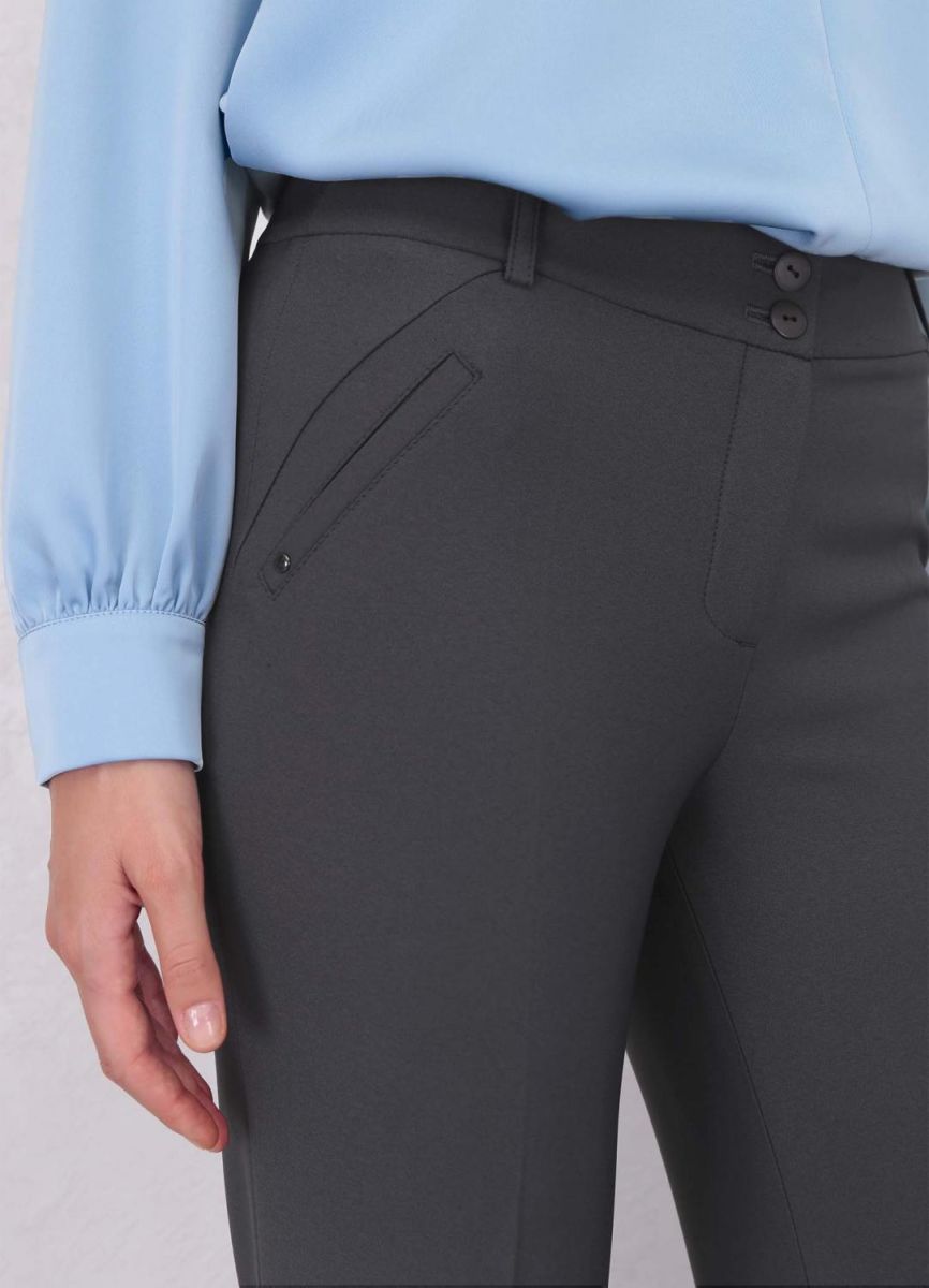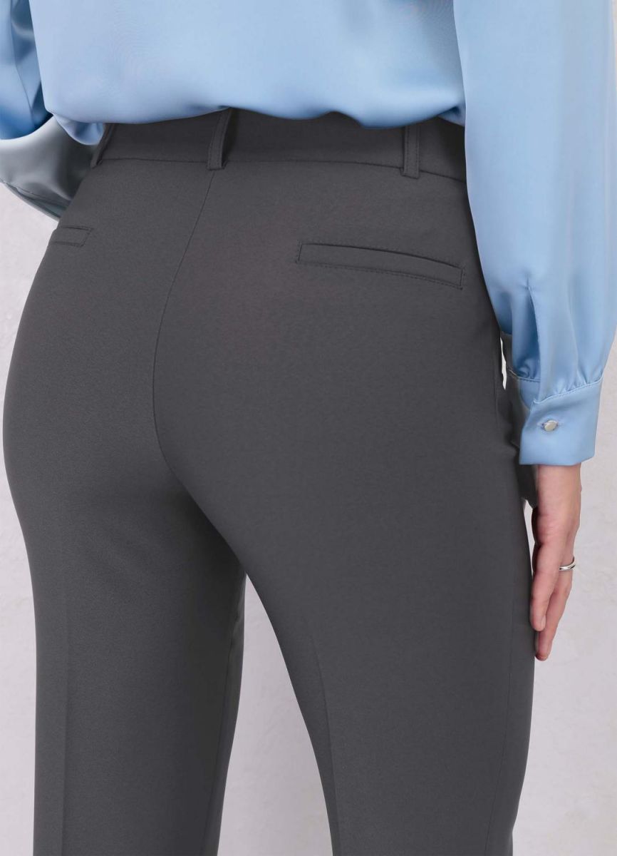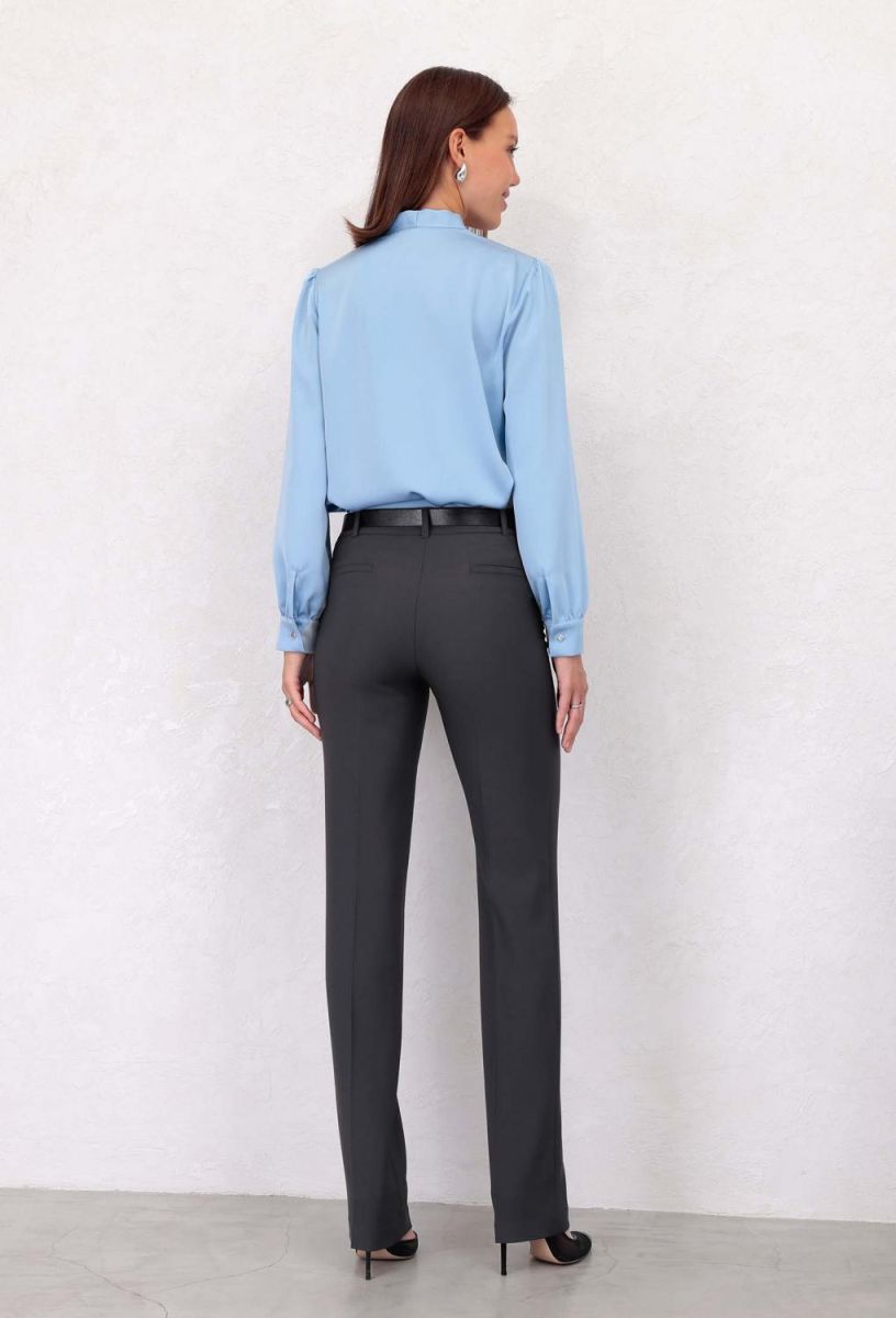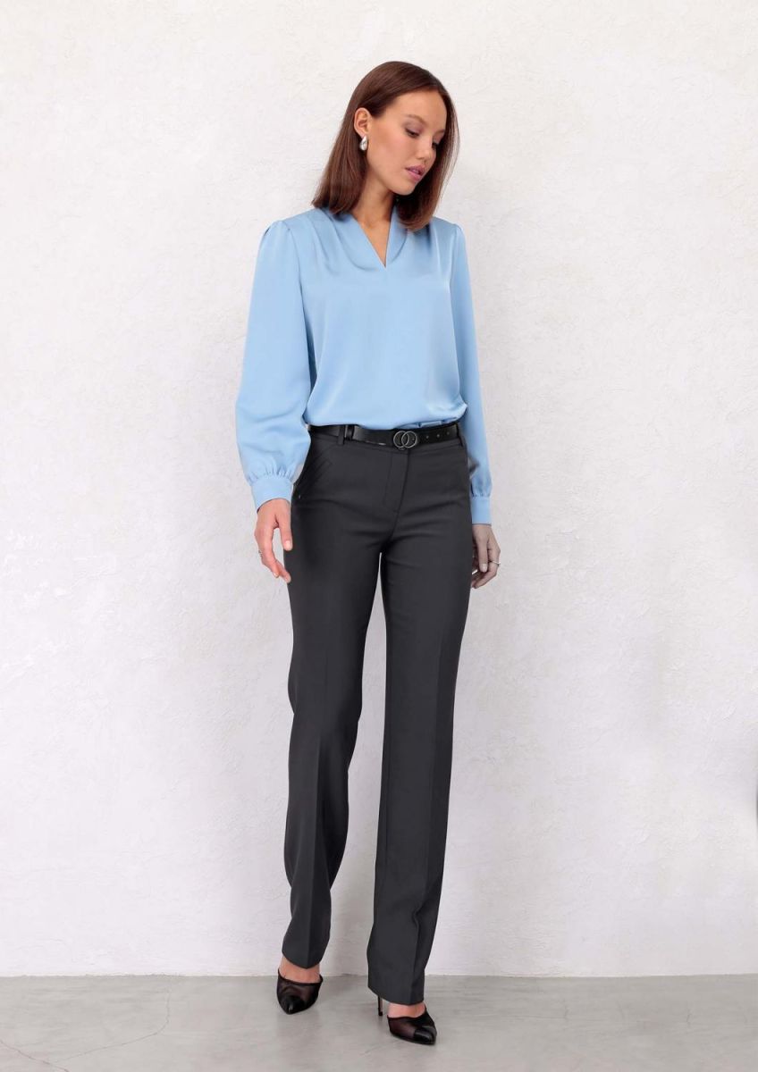 Классические, молодежные брюки, прямого кроя, полной длины. По бокам имитация карманов. Талия дополнена узким поясом, со шлевками для ремня. Застежка на молнию и на две пуговицы.