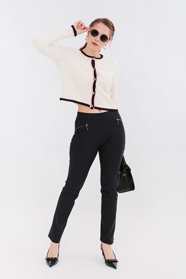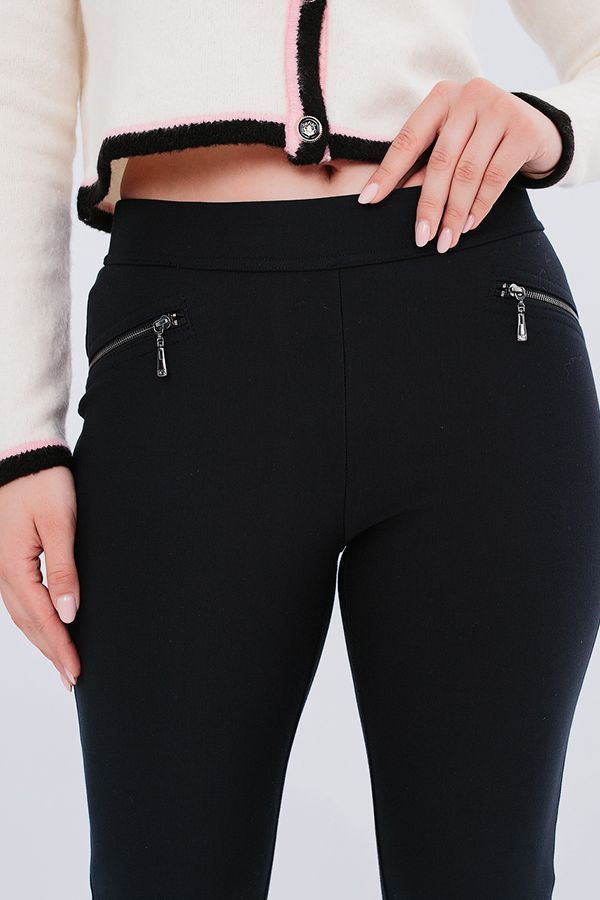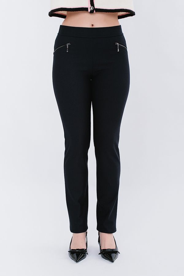Модель без застежки на трикотажном поясе (в поясе резина 3,0 см), спереди имитация прорезных карманов на молнии, сзади кокетка.