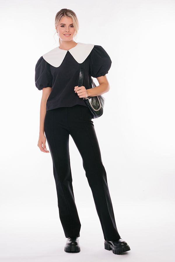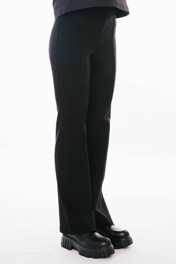 Детали: застажка на молнию и пуговицу, пояс продублирован эластичной лентой. Спереди вертикальный рельеф с отстрочкой, сзади кокетка. Длина по внутреннему шву - 82 см. Ширина низа -23 см.