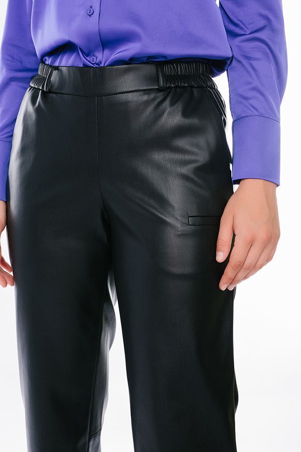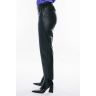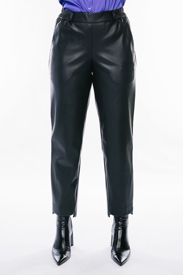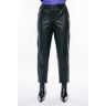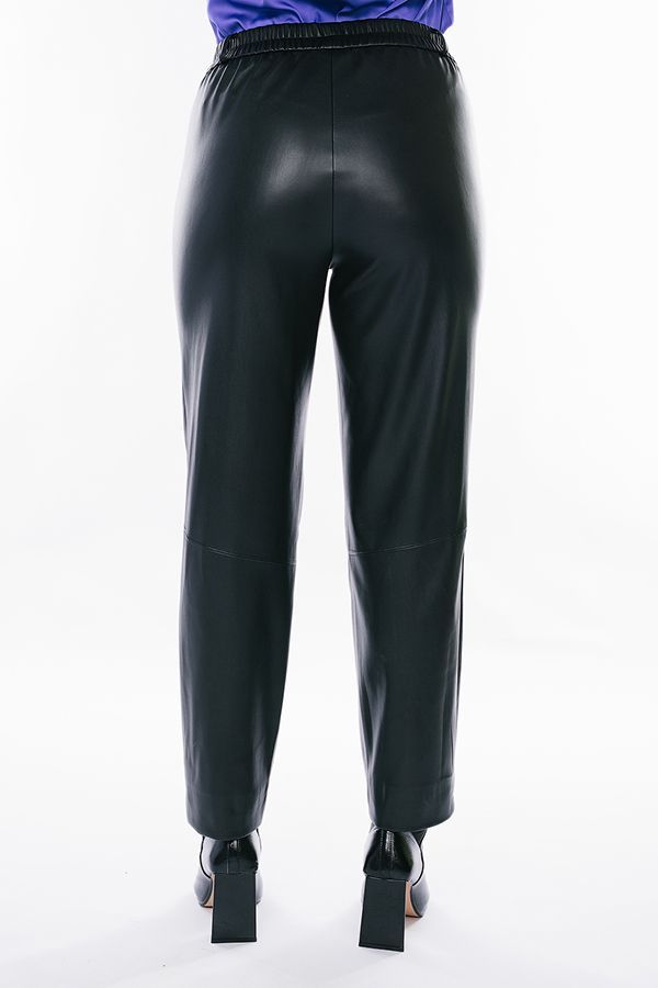 Современная модель брюк из облегченной черной экокожи, свободного силуэта. Особенность модели смещенный боковой шов по передней половинке, плавно переходящий в карман. В поясе резина, на поясе шлевки. По левой передней половинке декоративный элемент ввиде листочки. По задней половинке рез. Низ изделия оформлен небольшой ступенькой с разрезом. Длина по внутреннему шву передней половинки - 69,5 см. Ширина по задней половинке- 71,5 см. Ширина низа - 17,5 см. Числовые параметры соответствуют размеру 46. Размер модели на фото: 44. Параметры модели: 89-62-97. Рост модели на фото: 175 см.