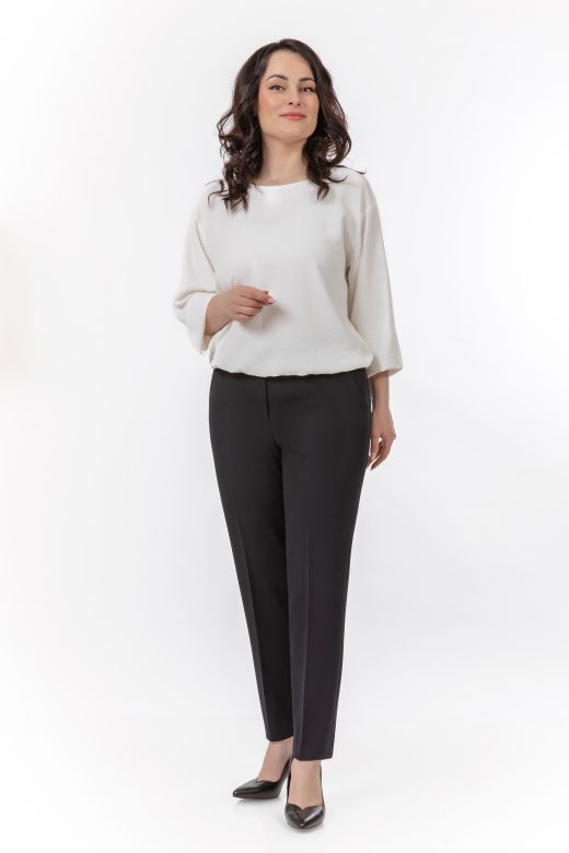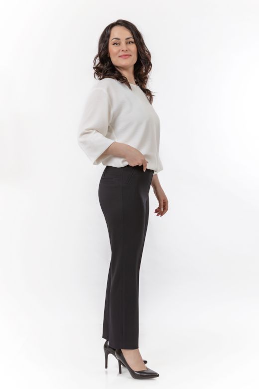 Передние половинки украшены декоративными элементами. На задних половинках имитация кармана "листочка". Пояс с эластичной лентой.