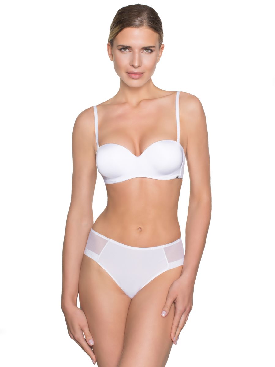 Бюстгальтер анжелика, "фашия" с градуированной чашкой, на косточках. Средний размер пуш-ап. Съемные бретели, широкие резинки на спинке усилены силиконом, что позволяет носить модель без бретелей. Застежка в два ряда на три позиции. Выполнен из микрофибры. Коллекция "Milla" Серия Milla пересекается и взаимозаменяется по цветам с серией Margo.