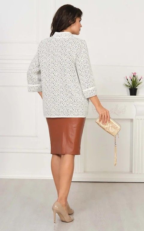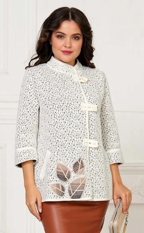 Вязаный женский жакет свободнного силуэта с воротником-стойкой. Рукава втачные длинной 3/4 с отворотом. Жакет застегивается на пуговицы и воздушные петли. Два боковых прорезных кармана с листочкой. Жакет выполнен жаккардовым структурным переплетением. На правой полочке внизу расположена декоративная аппликация