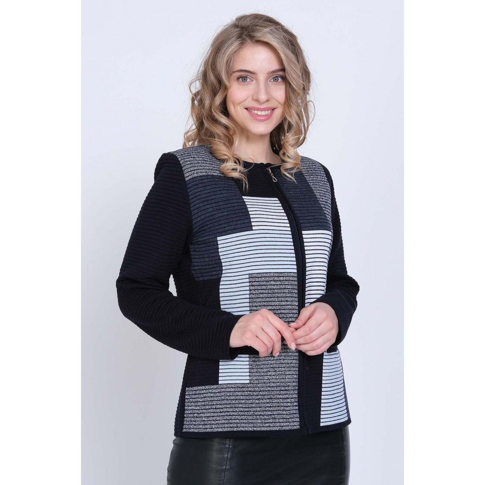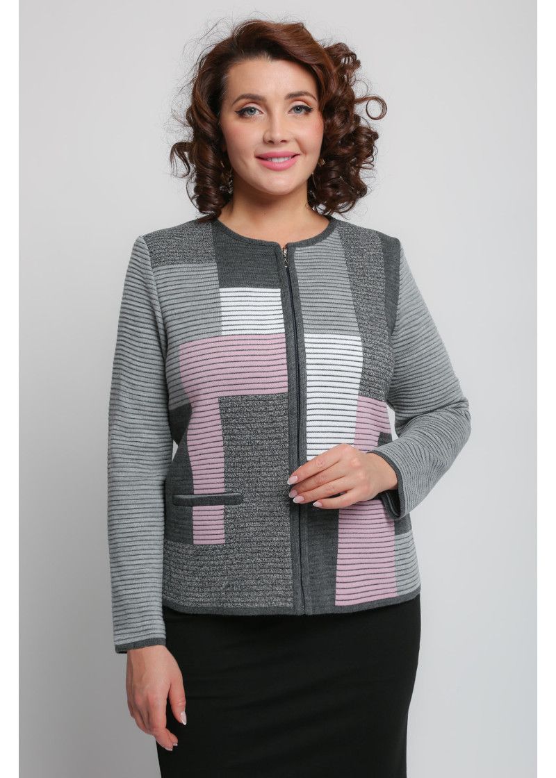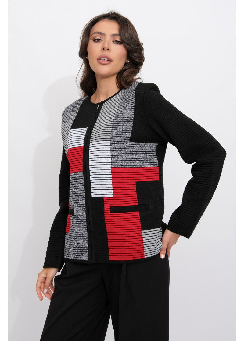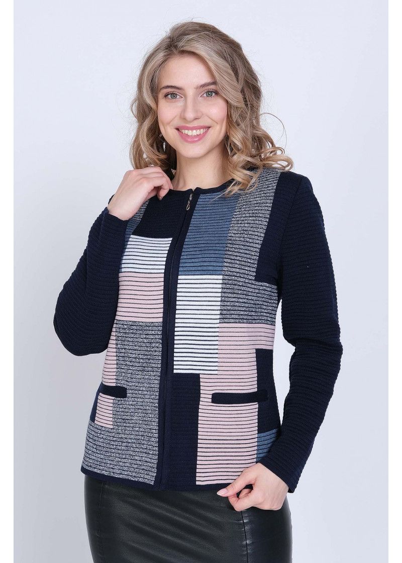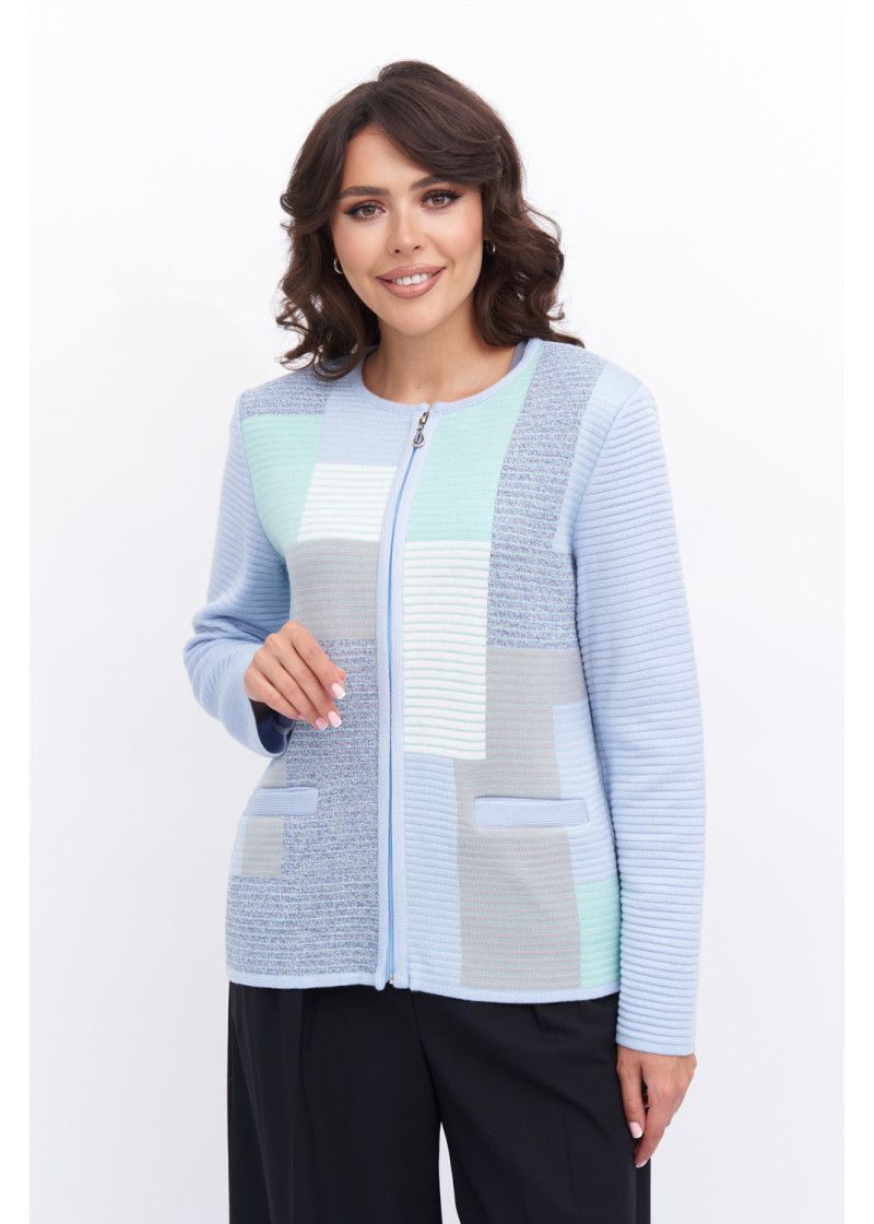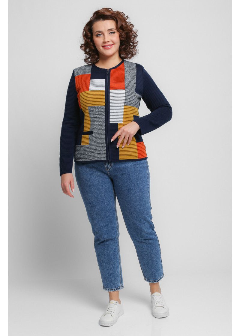 Жакет женский вязаный полуприлегающего силуэта с круглой горловиной. Жакет на молнии по всей длине изделия. По бокам два прорезных кармана. Рукава втачные длинные. Жакет выполнен переплетением образующим валики. Перед вывязан многоцветным геометрическим рисунком. Рукава и спинка однотонные. Горловина, низ рукавов, низ изделия и планка под молнию выполнены контрастным цветом.