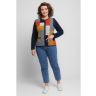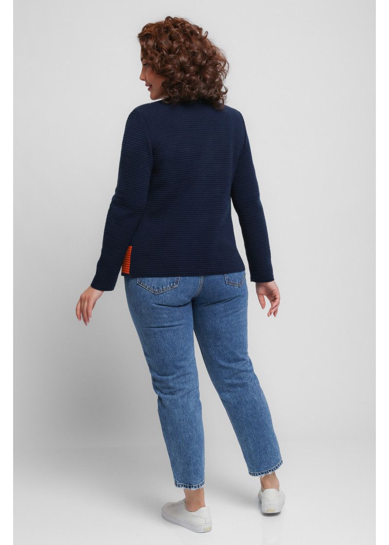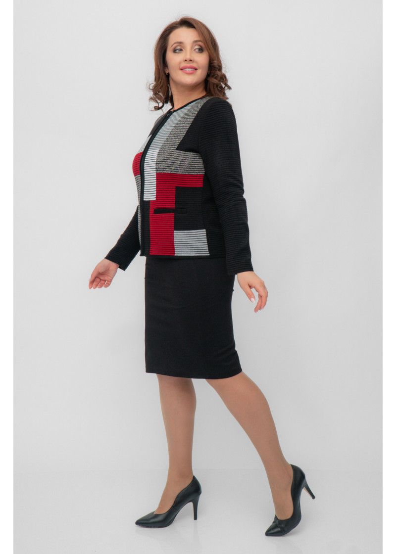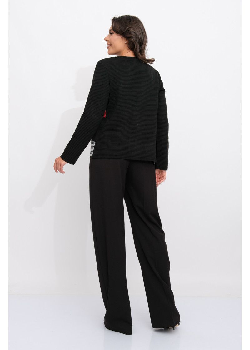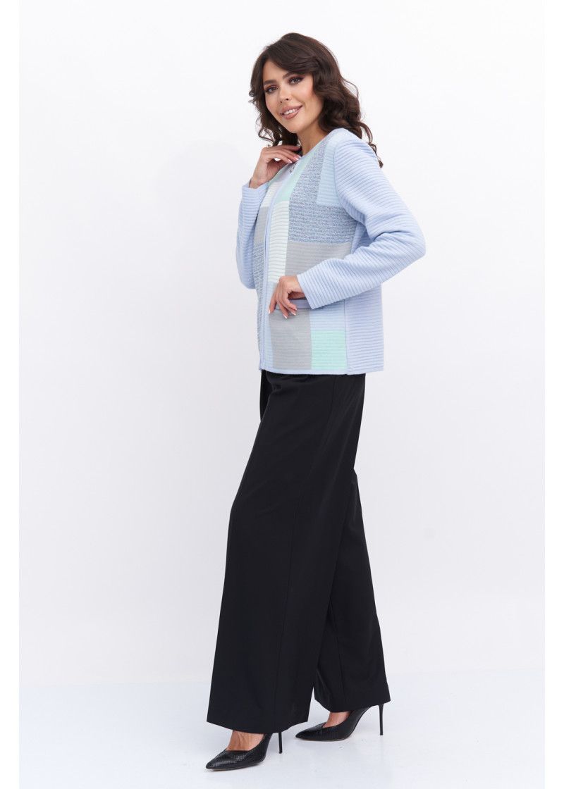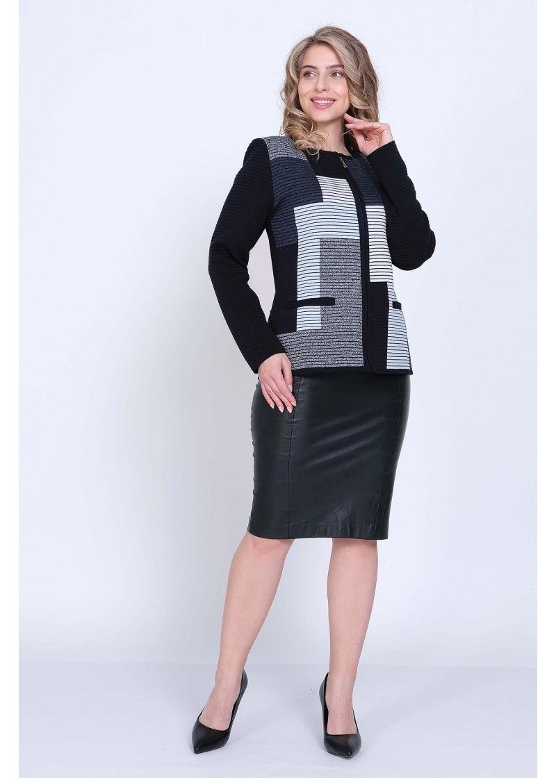 Жакет женский вязаный полуприлегающего силуэта с круглой горловиной. Жакет на молнии по всей длине изделия. По бокам два прорезных кармана. Рукава втачные длинные. Жакет выполнен переплетением образующим валики. Перед вывязан многоцветным геометрическим рисунком. Рукава и спинка однотонные. Горловина, низ рукавов, низ изделия и планка под молнию выполнены контрастным цветом.