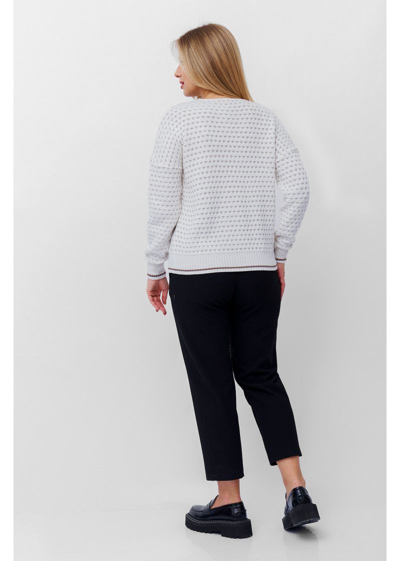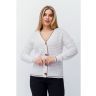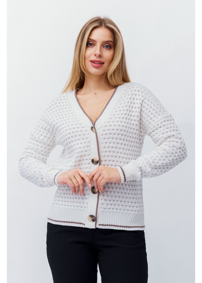 Классический жакетс V-образным вырезом и застегивающийся на пуговицы. Выполнен двухслойным ажурным переплетением. Плечо спущенное, рукава длинные. Низ изделия, низ рукавов и планка выполнены эластичным переплетением с полосой контрастного цвета.