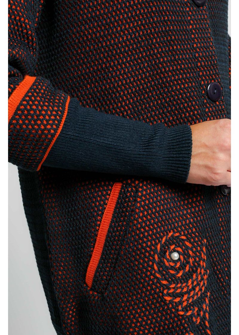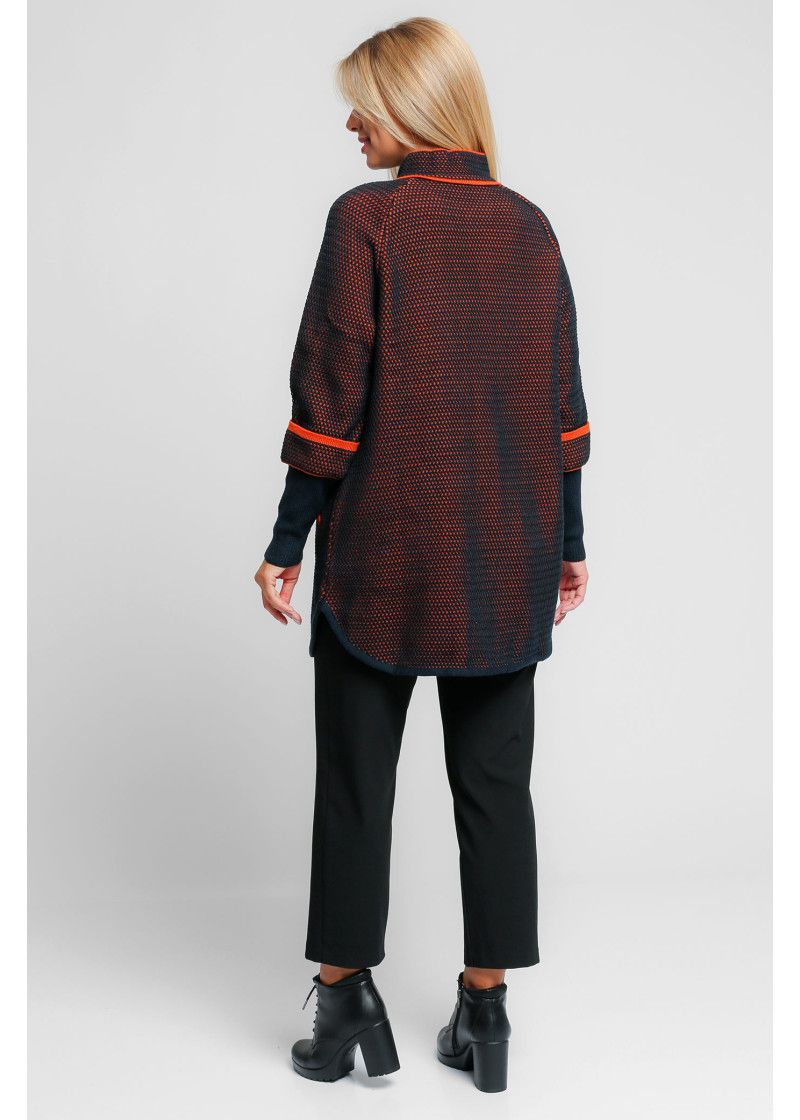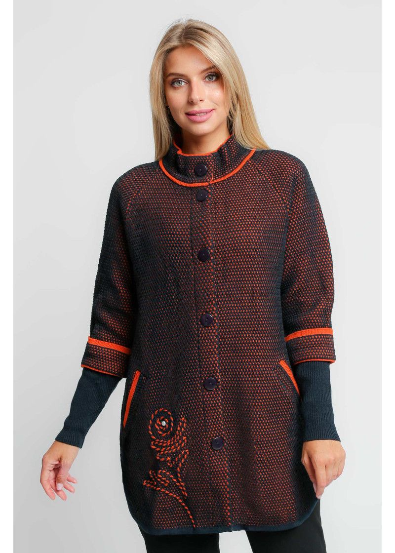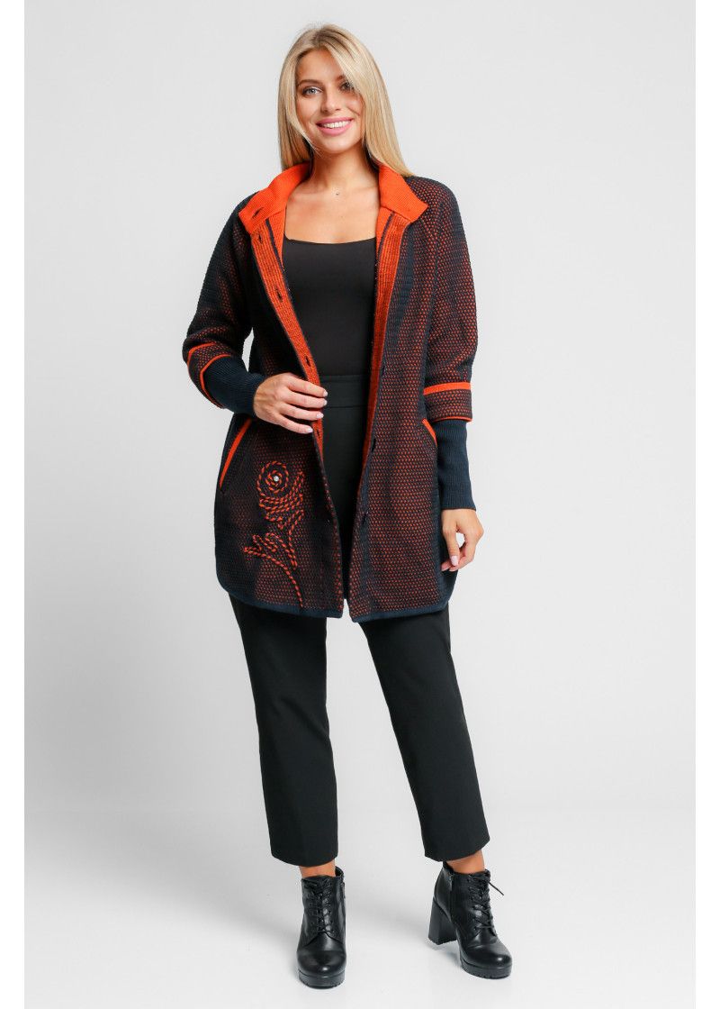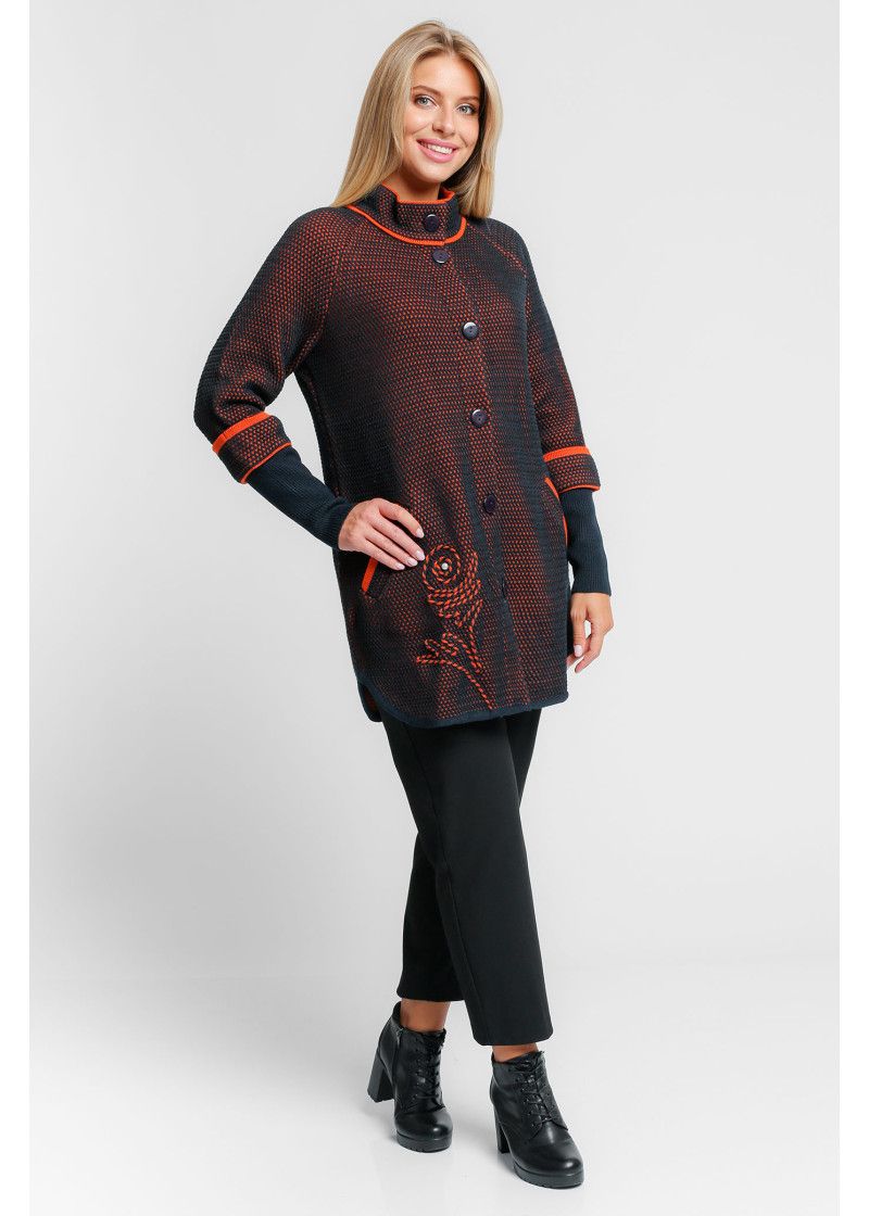 Жакет женский вязаный удлиненный, с воротником стойкой. Рукава реглан длиной 3/4 с отворотом и удлиненной эластичной манжетой. Жакет застегивается на пуговицы. По бокам два прорезных кармана. По низу изделия аппликация выполнена цветным шнурком.