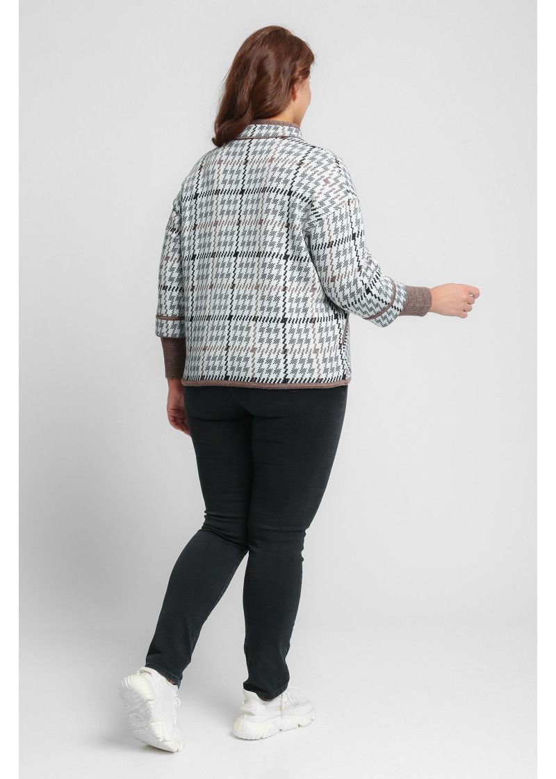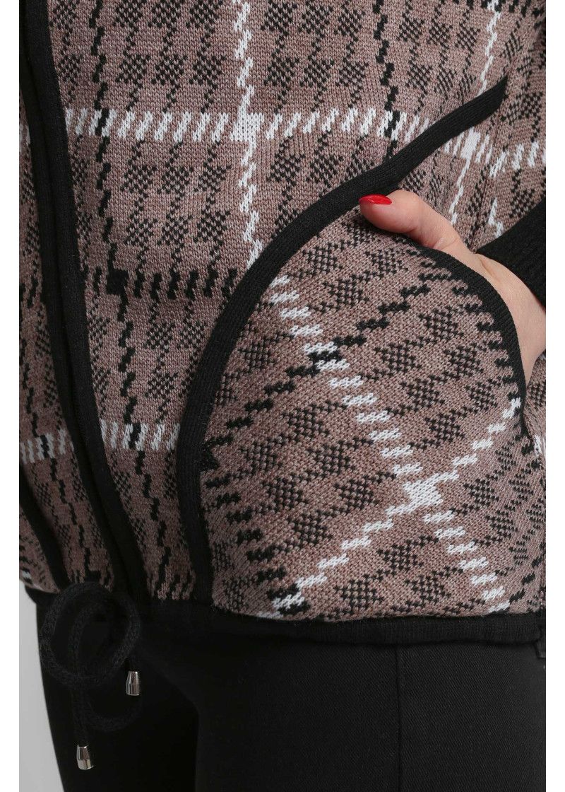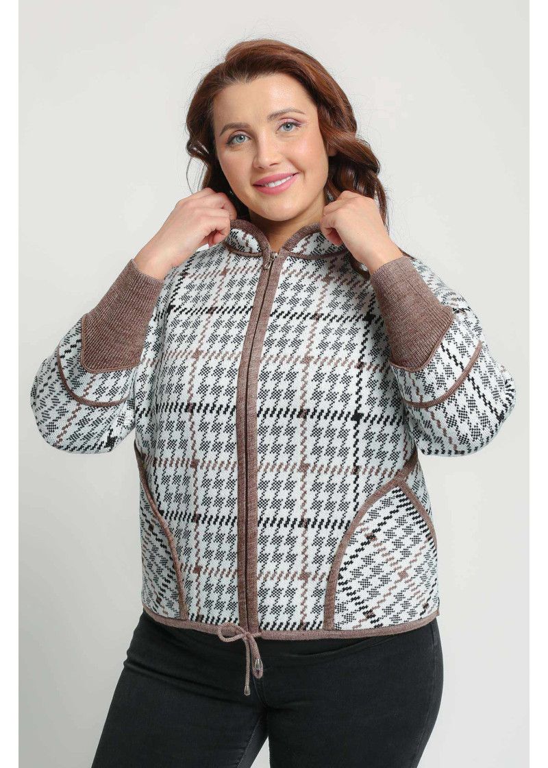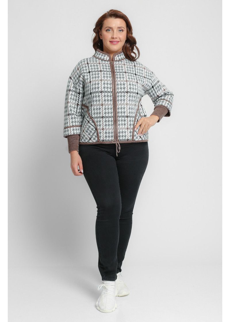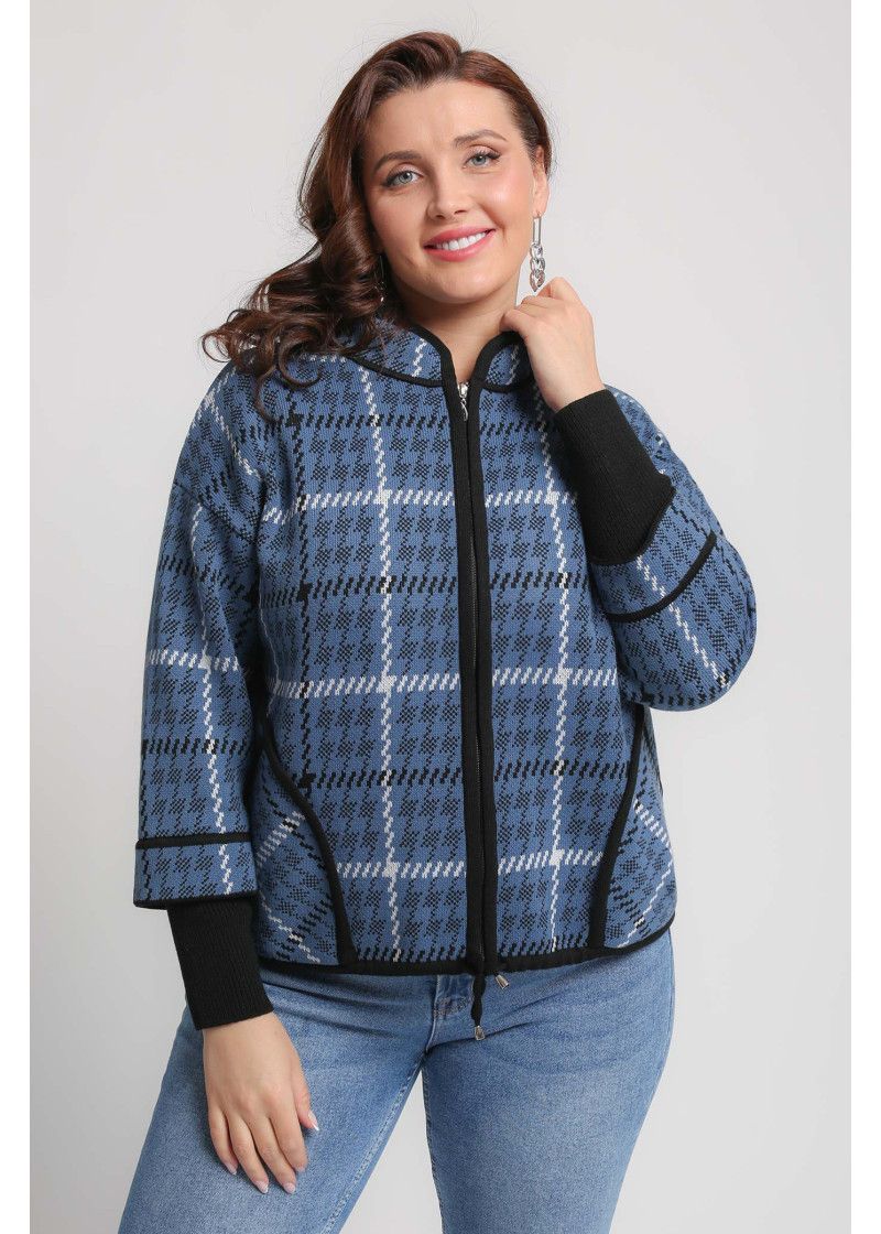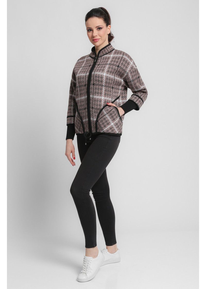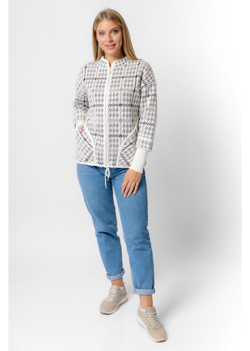 Жакет женский вязаный полушерстяной, свободного силуэта, в спортивном стиле. Плечо спущенное, рукава 3/4 с удлиненными эластичными манжетами. Воротник-стойка со скругленным краем. По бокам вязаного жакета два накладных кармана. По низу изделия проложен шнурок. Жаккардовый рисунок образует клетку.