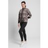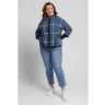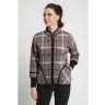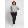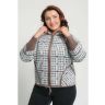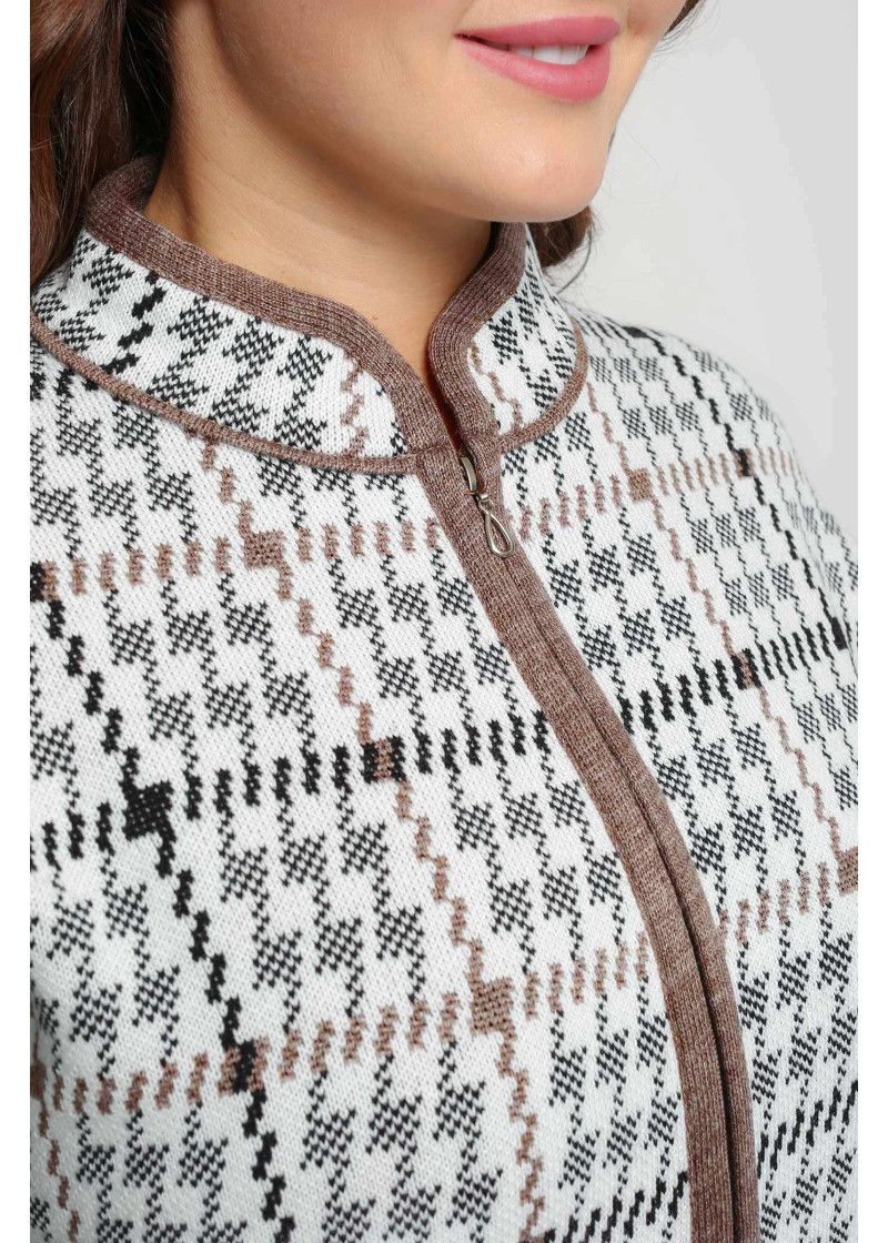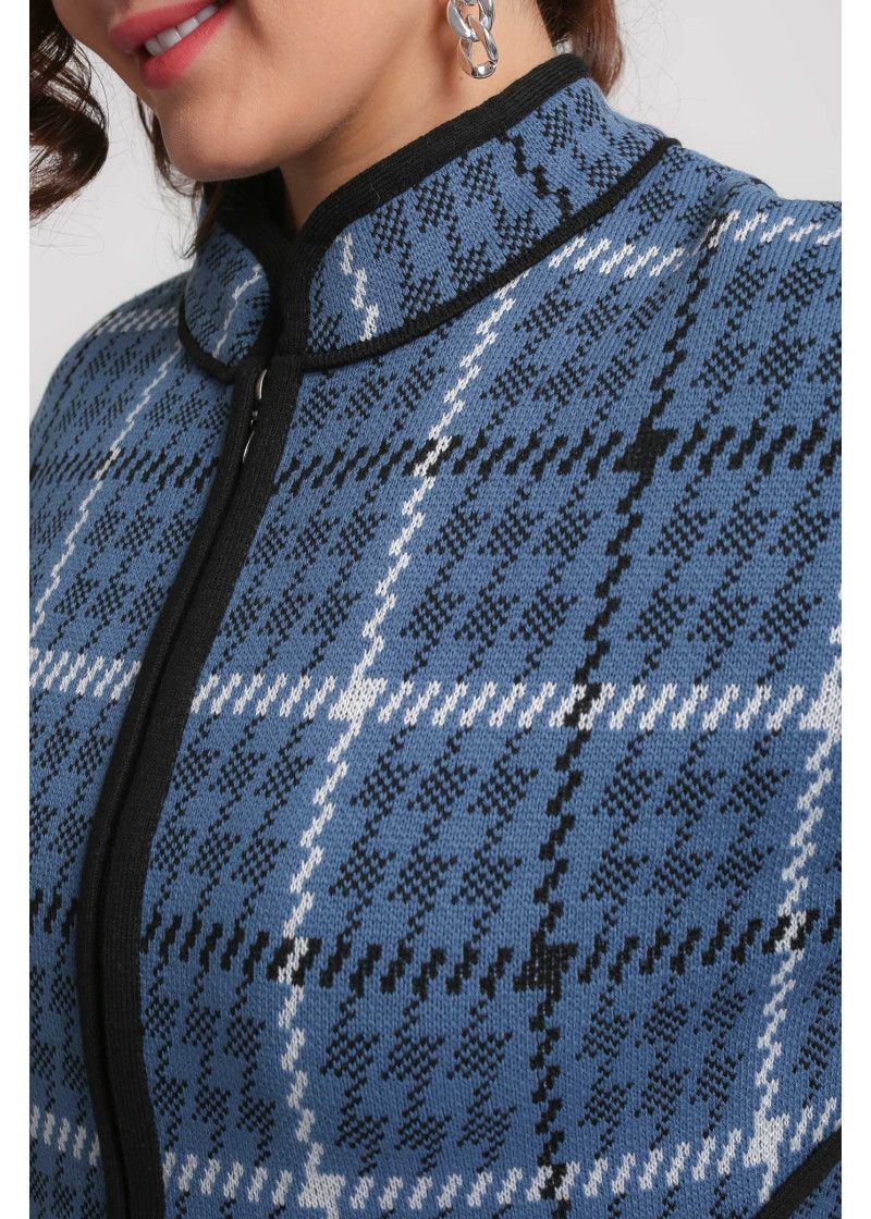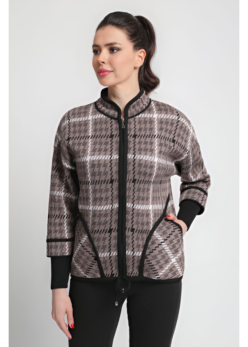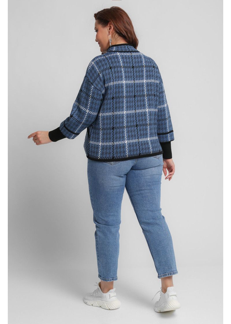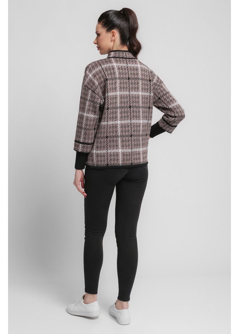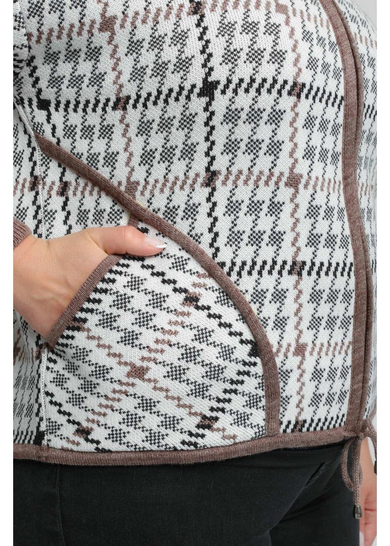 Жакет женский вязаный полушерстяной, свободного силуэта, в спортивном стиле. Плечо спущенное, рукава 3/4 с удлиненными эластичными манжетами. Воротник-стойка со скругленным краем. По бокам вязаного жакета два накладных кармана. По низу изделия проложен шнурок. Жаккардовый рисунок образует клетку.