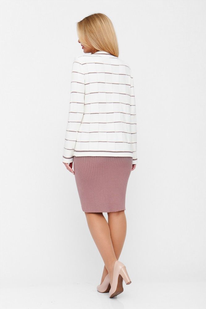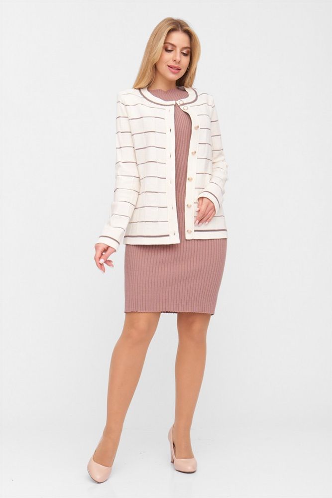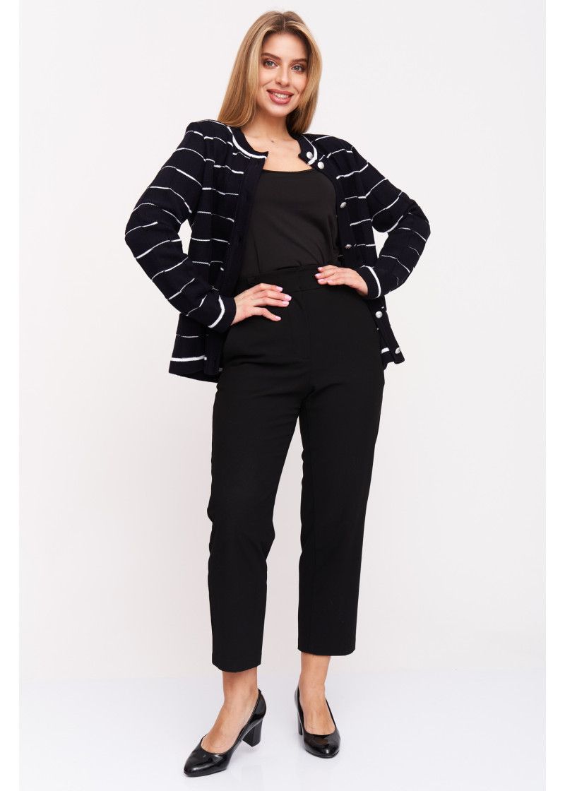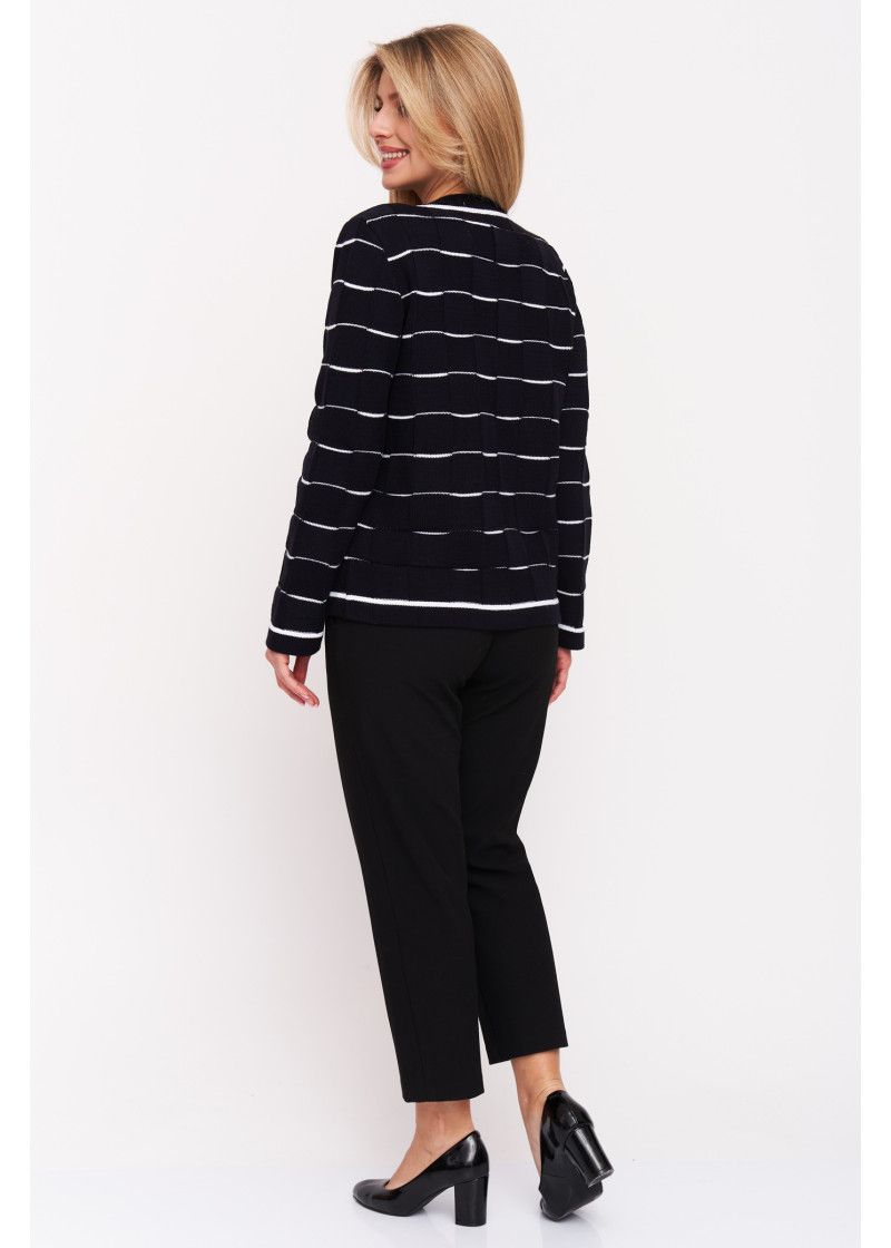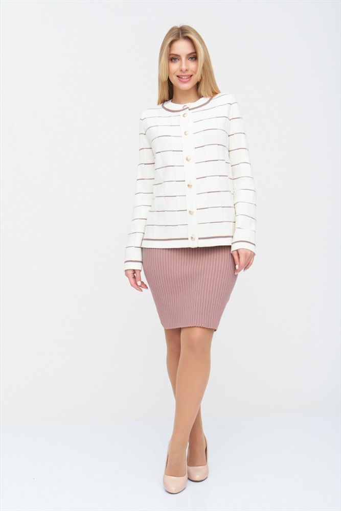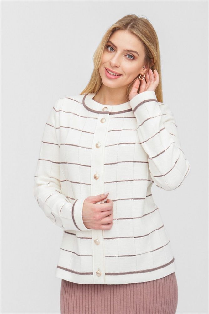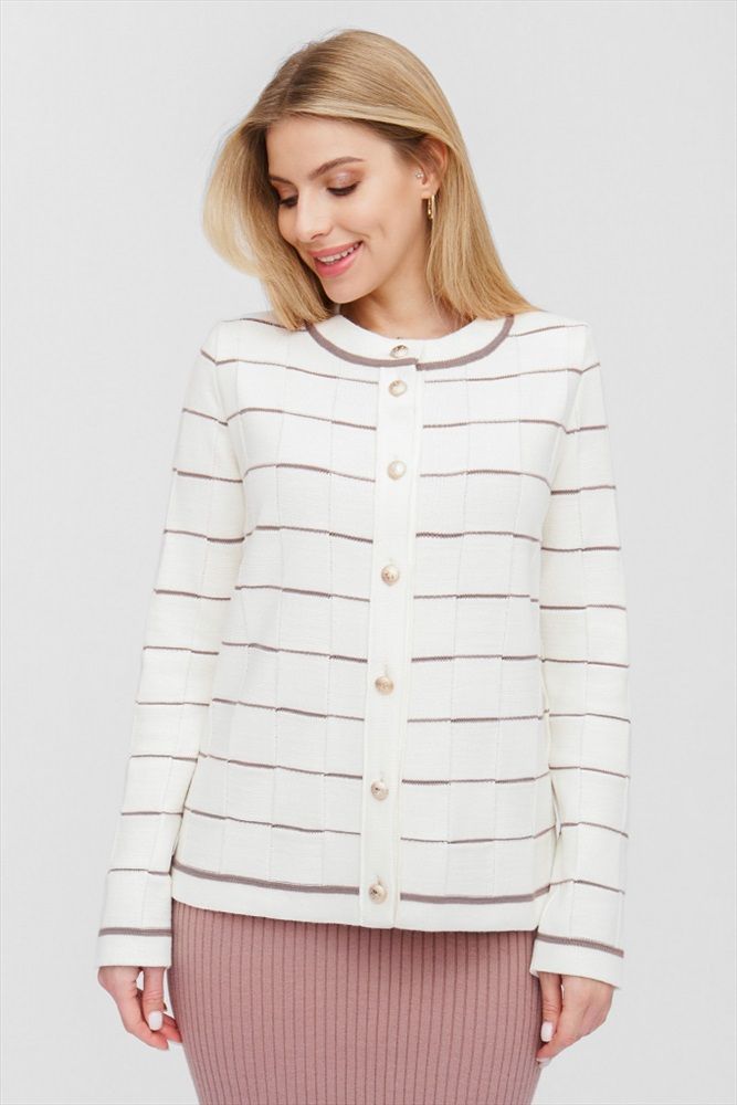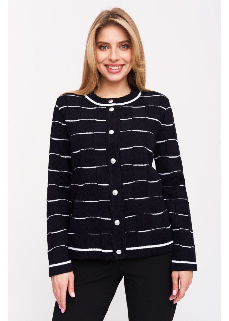 Нарядный женский жакет из трикотажного полотна полуприлегающего силуэта с круглой горловиной, на пуговицах. Рукава втачные длинные. Жакет выполнен переплетением, образующим шахматное переплетение. Контрастная эффектная отделка и металлические пуговиы.
