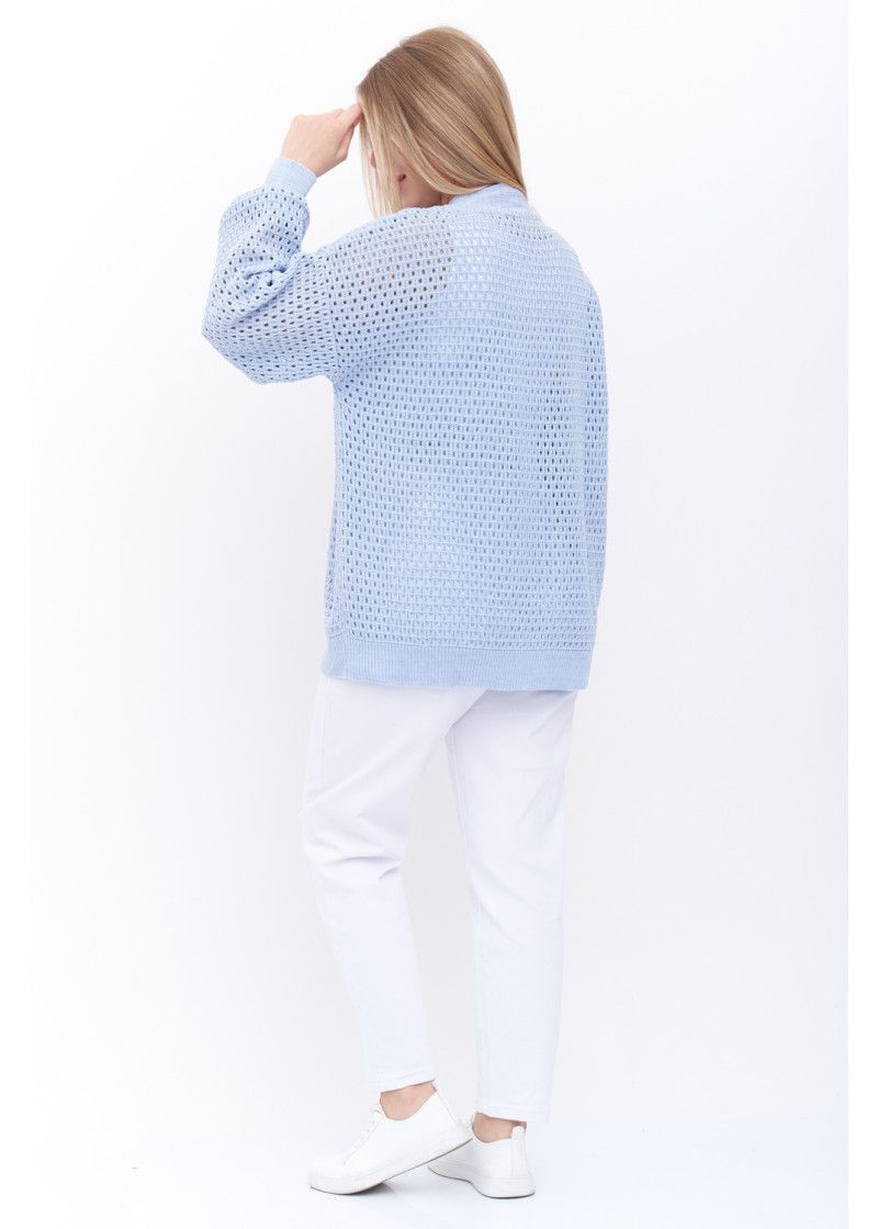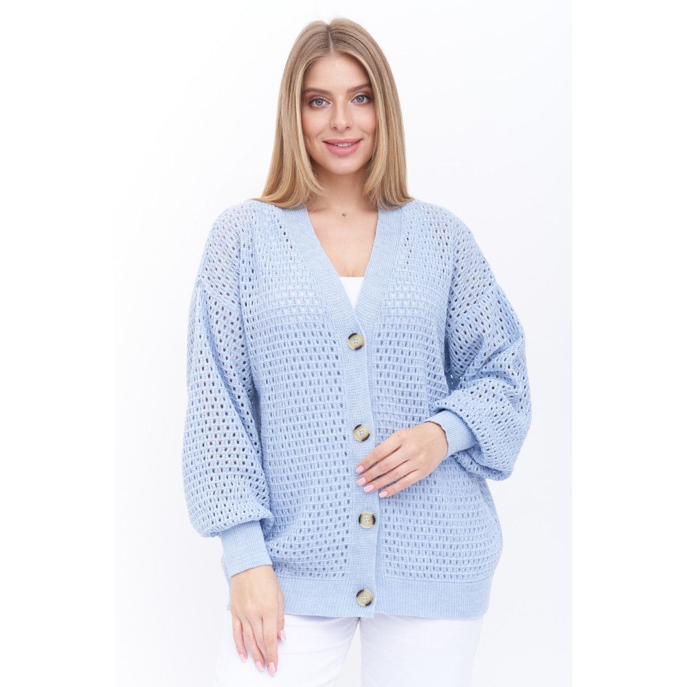 Плечо спущенное, рукава втачные длинные на манжете. Жакет застегивается на пуговицы, образуя V-образный вырез горловины. Выполнен ажурным переплетением, создающим воздушную легкость Вашему образу.