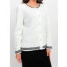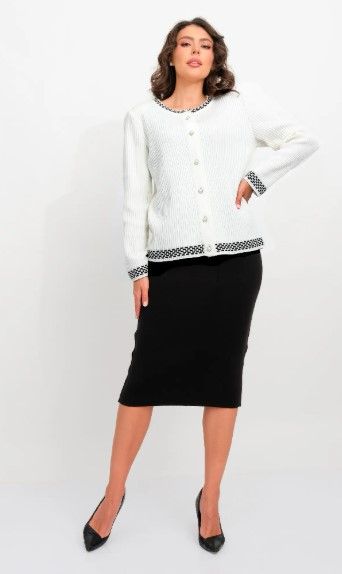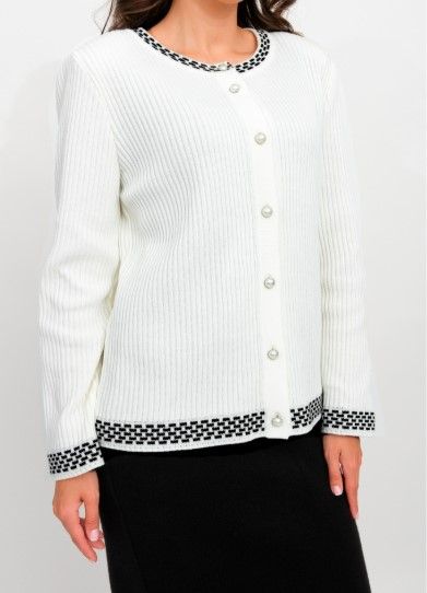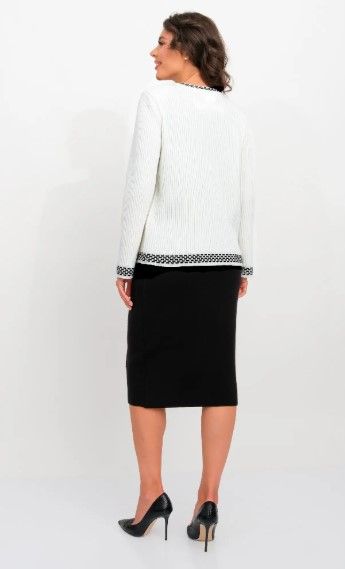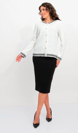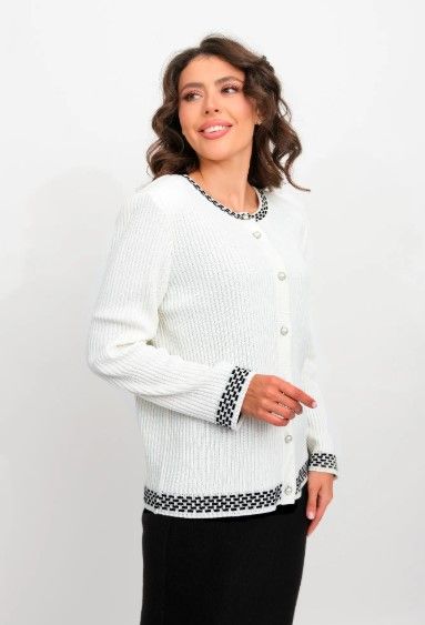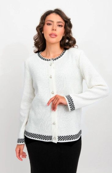 Нарядный женский жакет из трикотажного полотна полуприлегающего силуэта с круглой горловиной, на пуговицах. Рукава втачные длинные. Жакет выполнен структурным переплетением в рубчик. Эффектная контрастная отделка придаёт жакету нарядный вид..