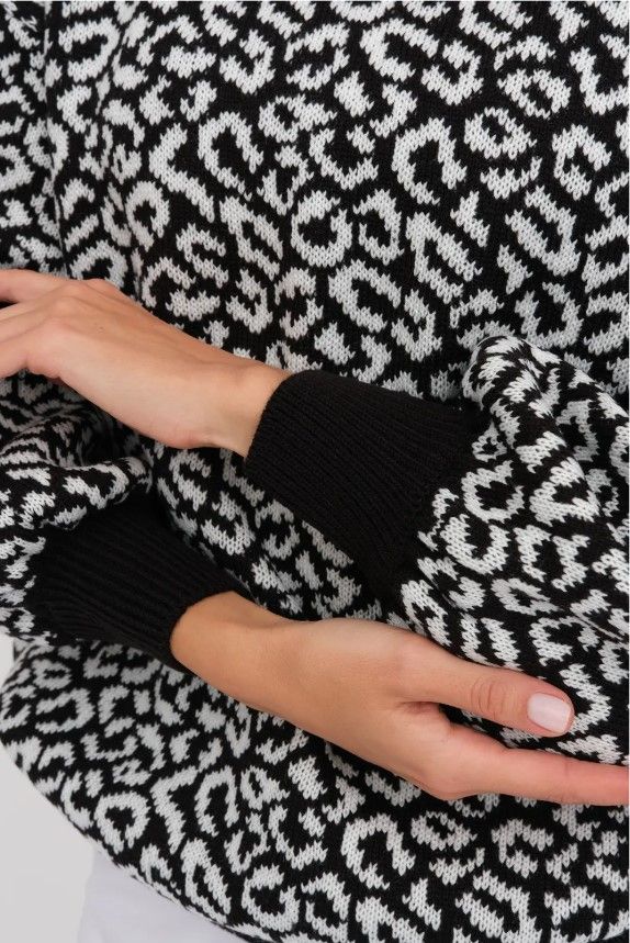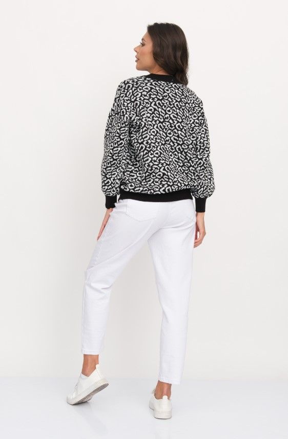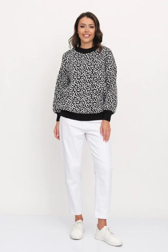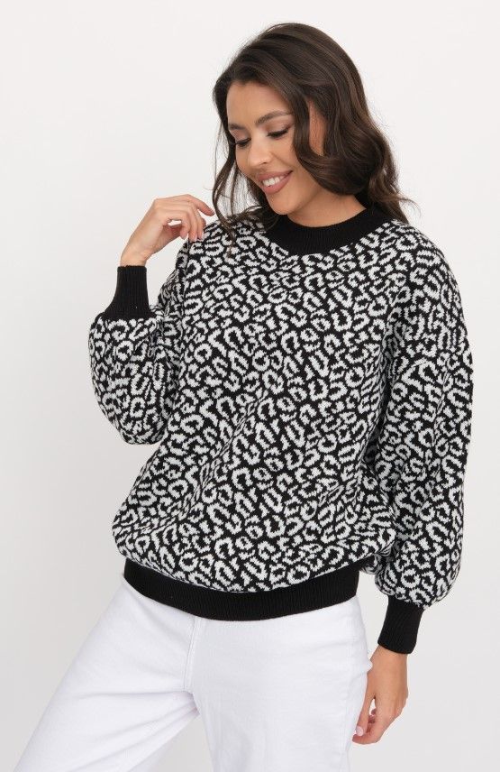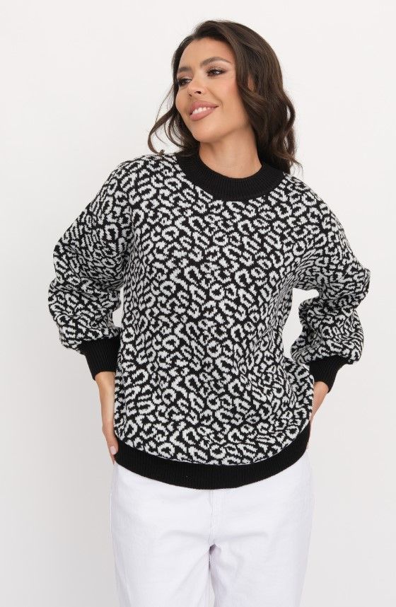 Женский вязаный джемпер свободного силуэта. Плечо спущенное, рукава втачные длинные. Горловина круглая обработанная эластичным переплетением. Джемпер выполнен жаккардовым переплетением, образующим анималистический принт "леопард". Горловина, манжеты и низ изделия выполнены эластичным переплетением.