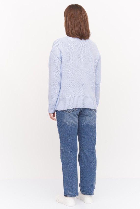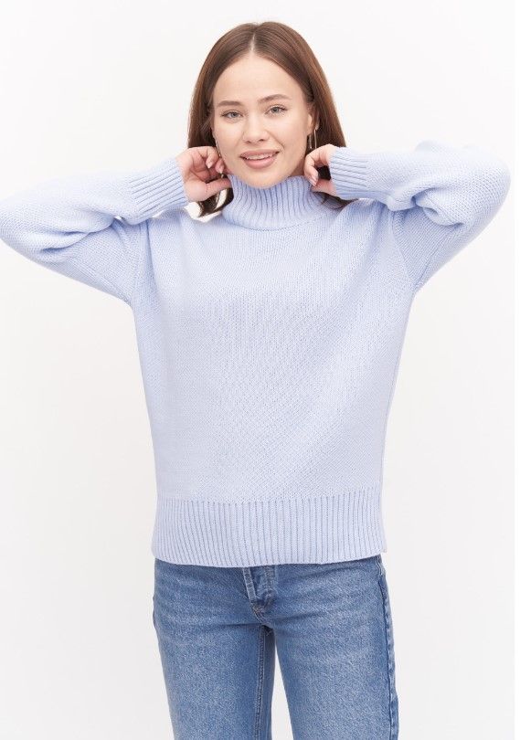Женский джемпер свободного прямого кроя с воротником - стойкой. Спущенная линия плеча и длинный рукав. По низу изделия и рукавов мягкие резинки.Незаменимая модель для создания модных и комфортных образов в прхладную погоду.