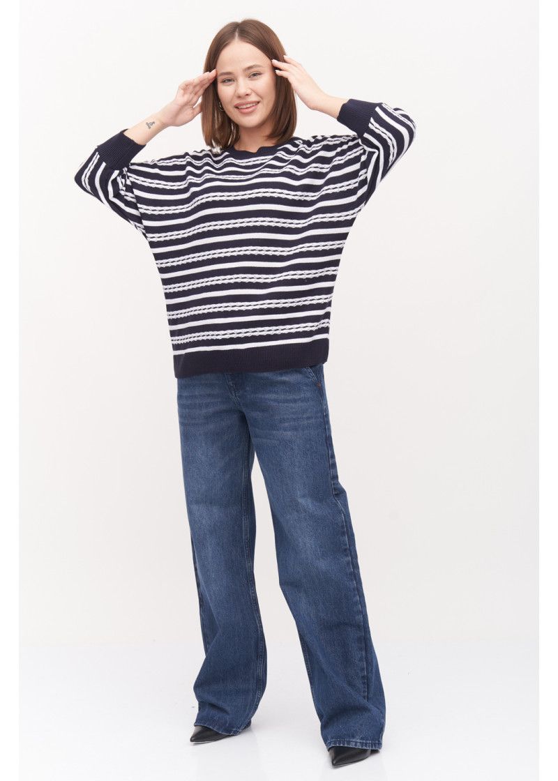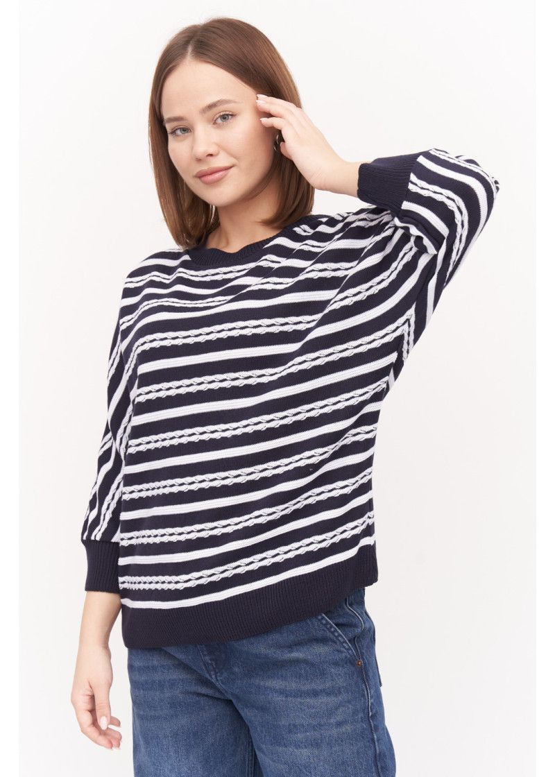 Стильный женский джемпер фактурной вязки. Выполнен из пряжи, в которой 30% хлопка, что позволяет носить его как летом, так и весной и осенью. Круглая горловина и рукав 3/4 делают наш джемпер легким и легко сочетаемым с брюками, юбками, джинсами.