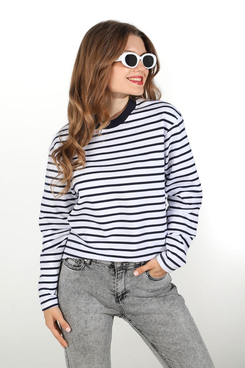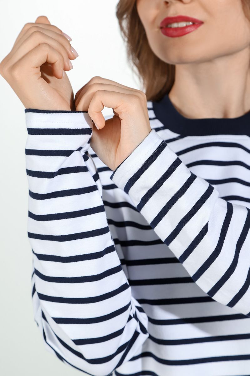 Свитшот молодежный из трикотажного полотна «футер» с рисунком в полоску, длинными втачными рукавами и горловиной овальной формы, обработанной втачной планкой из эластичного полотна «Кашкорсе».