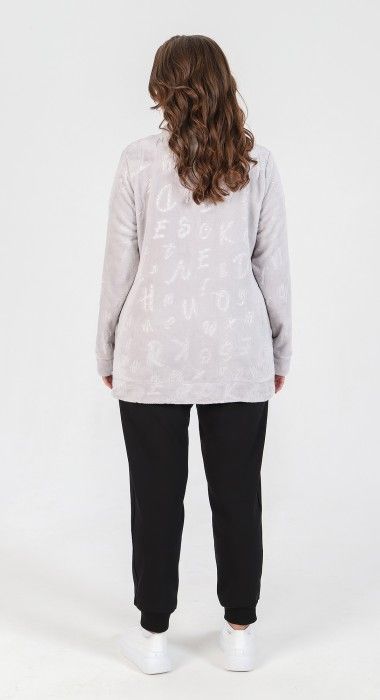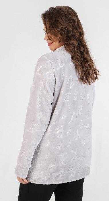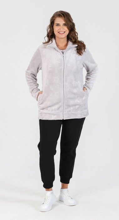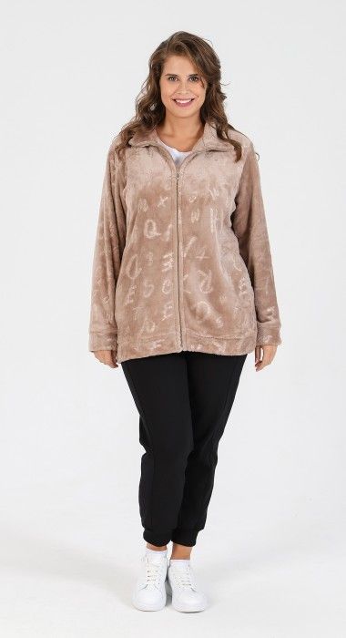 Куртка – из полотна «велсофт», прямого силуэта, с длинными втачными рукавами, воротником «стойка», карманами в боковых швах, центральной бортовой застежкой на тесьму «молния» и вышивкой в верхней части левой полочки. Нижние срезы рукавов обработаны притачными манжетами. Низ изделия – с притачным поясом.
