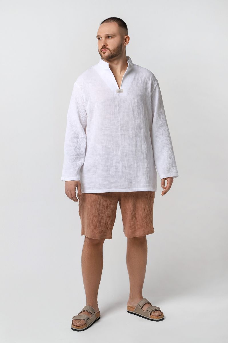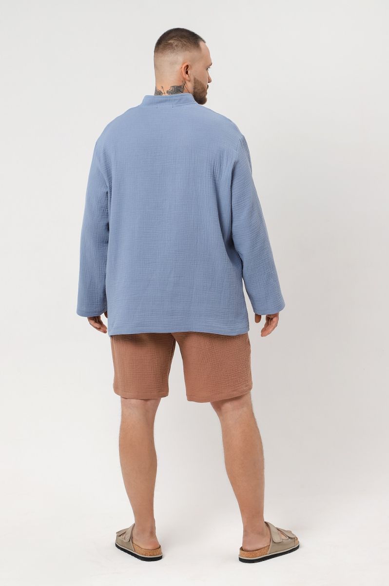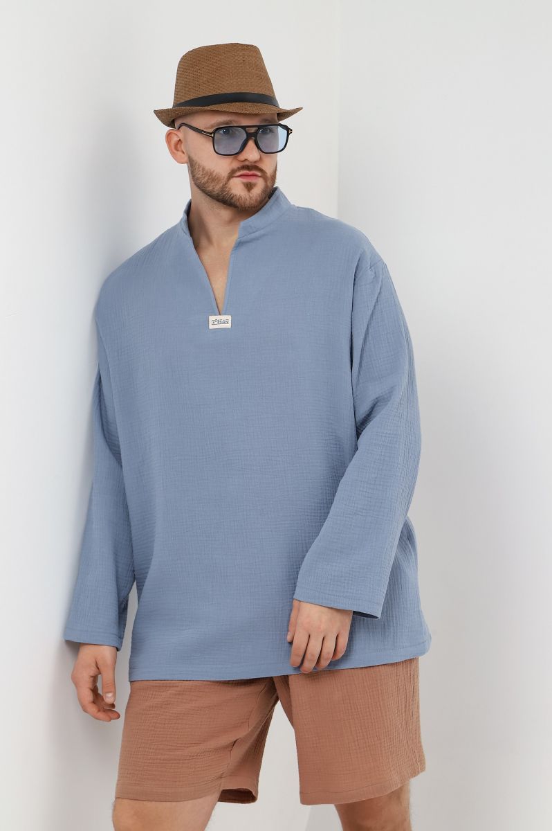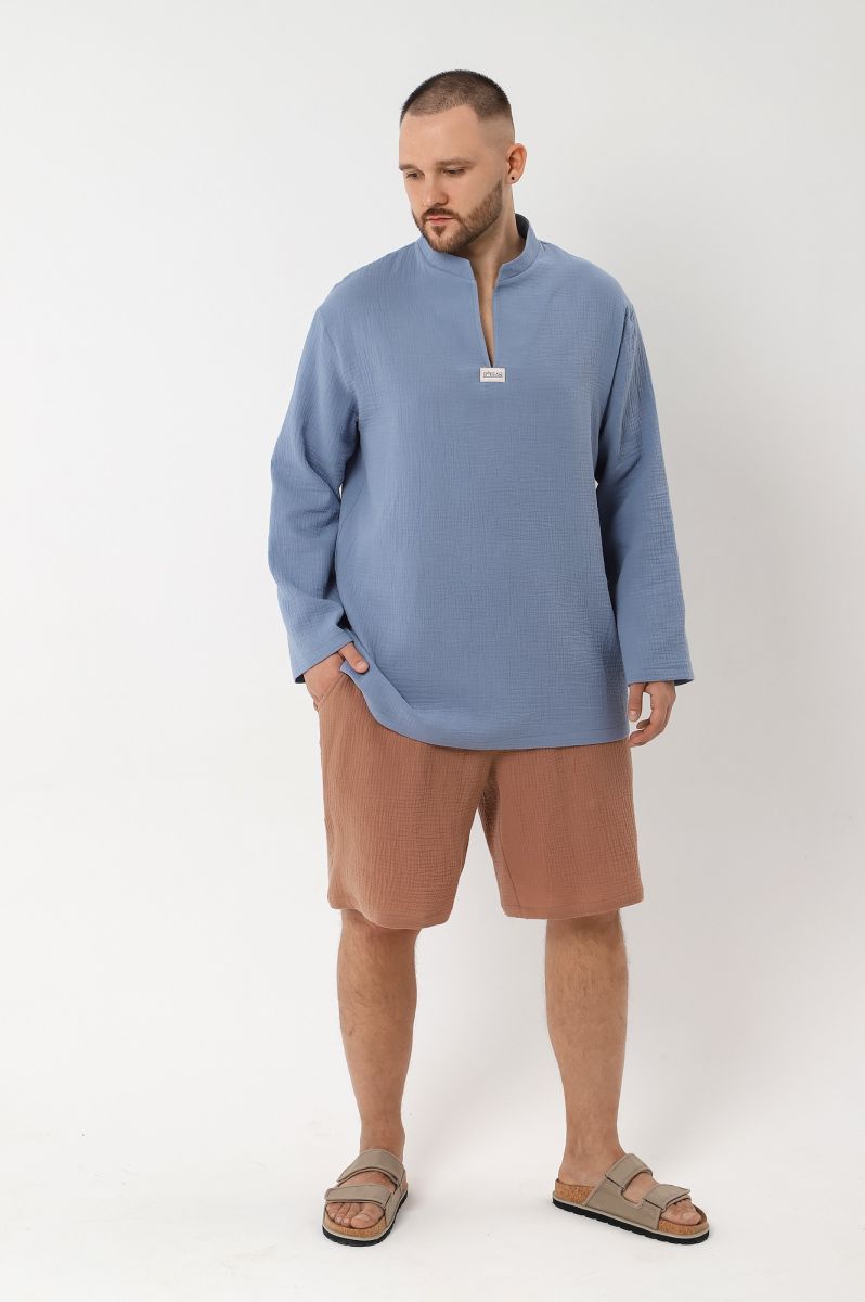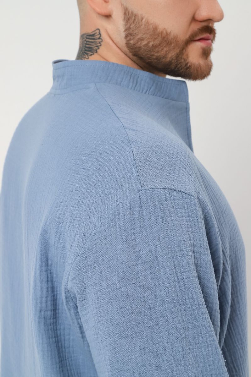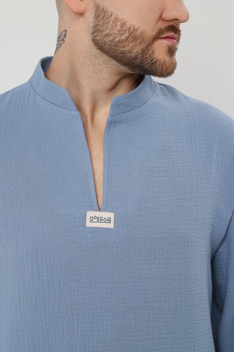 Рубашка мужская из гладкокрашеного тканого полотна "муслин" свободного покроя, со спущенным плечом и рукавами 3/4 длины, с воротником-стойкой, с разрезом v-образной формы , выходящим из горловины и декоративным элементом прямоугольной формы, настроченным ниже разреза.