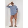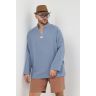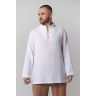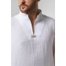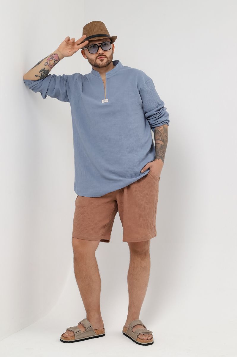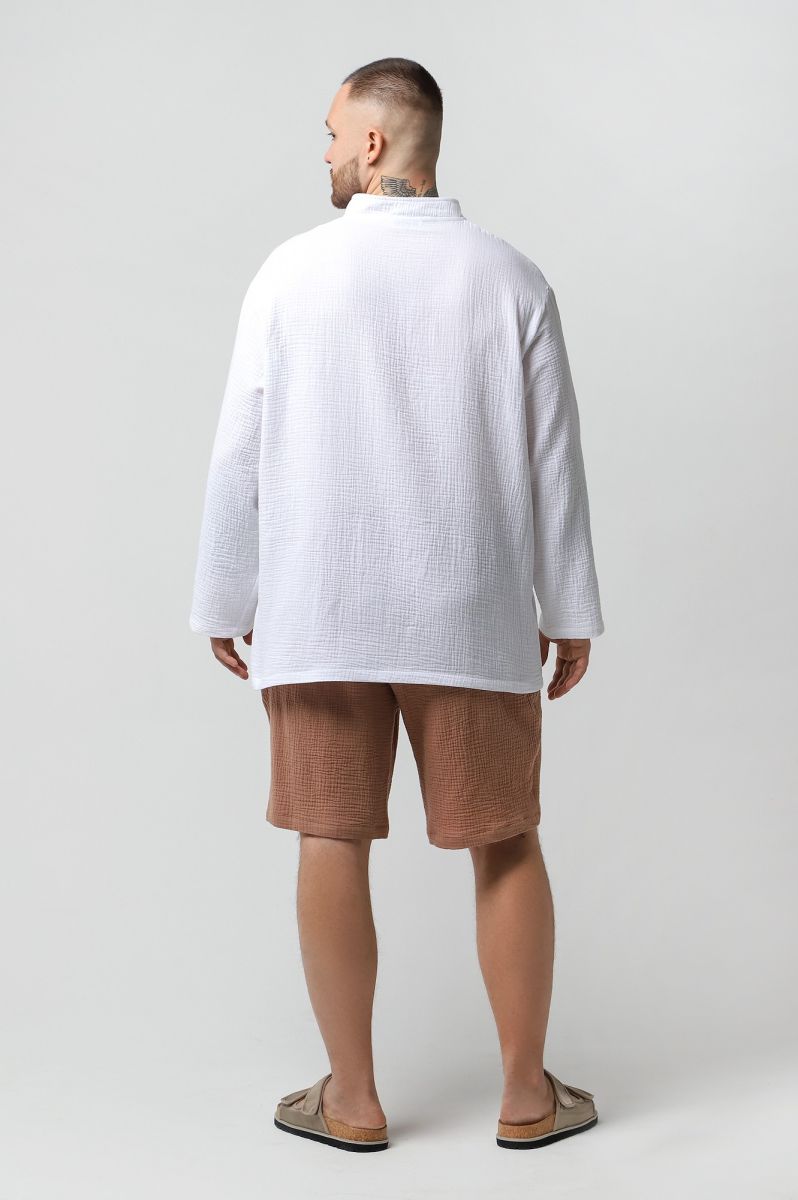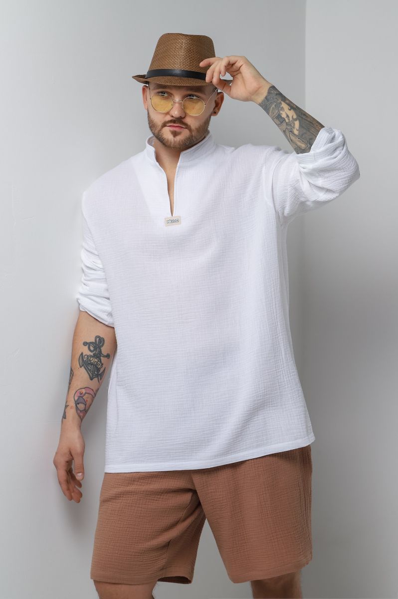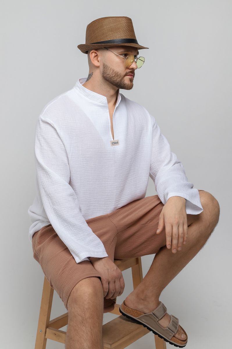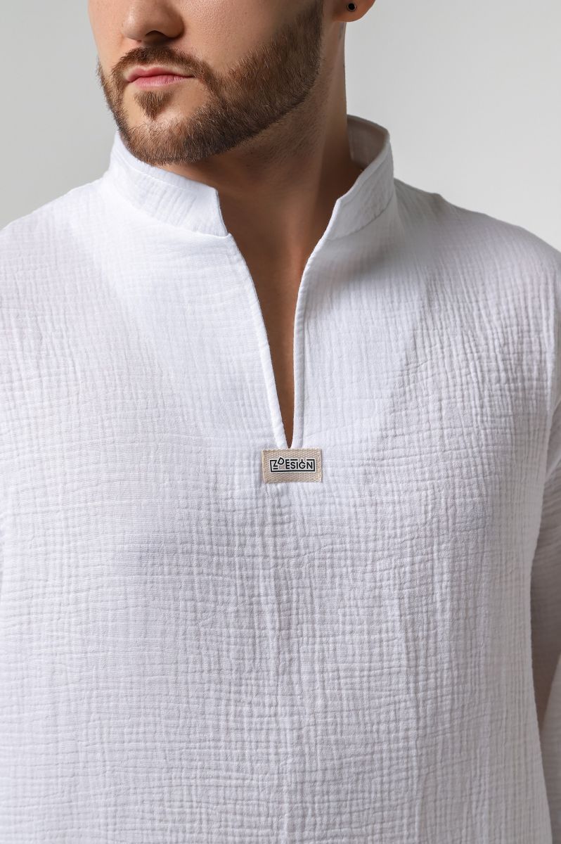 Рубашка мужская из гладкокрашеного тканого полотна "муслин" свободного покроя, со спущенным плечом и рукавами 3/4 длины, с воротником-стойкой, с разрезом v-образной формы , выходящим из горловины и декоративным элементом прямоугольной формы, настроченным ниже разреза.