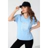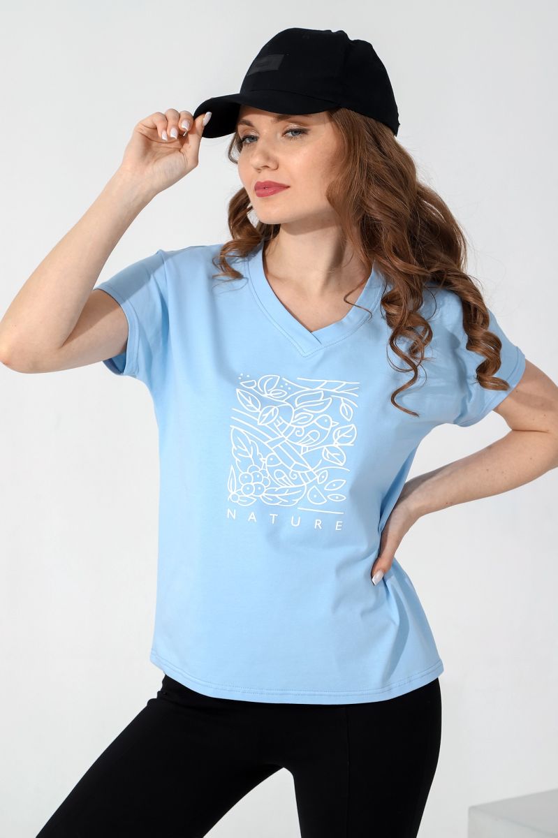Футболка – с короткими цельнокроеными рукавами, V-образным вырезом горловины, обработанным втачными планками, заходящими друг на друга спереди, и принтом на полочке.