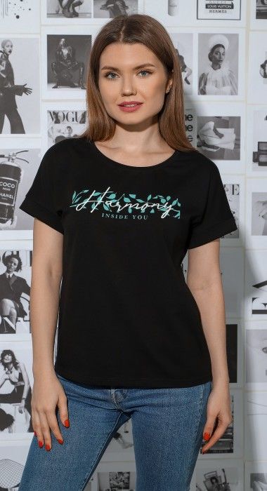 Футболка из гладкокрашеного трикотажного полотна «кулирка с лайкрой», классического покроя, с короткими цельнокроеными рукавами, горловиной овальной формы, обработанной втачной планкой и принтом на полочке, выполненным методом шелкографии. Рукава – с притачными манжетами-отворотами.