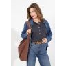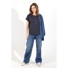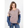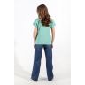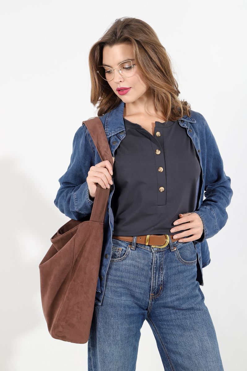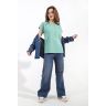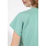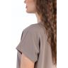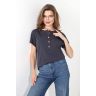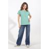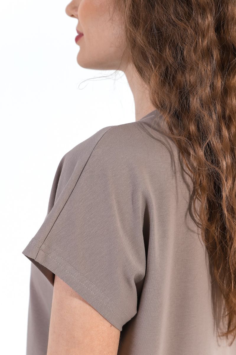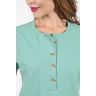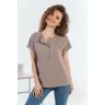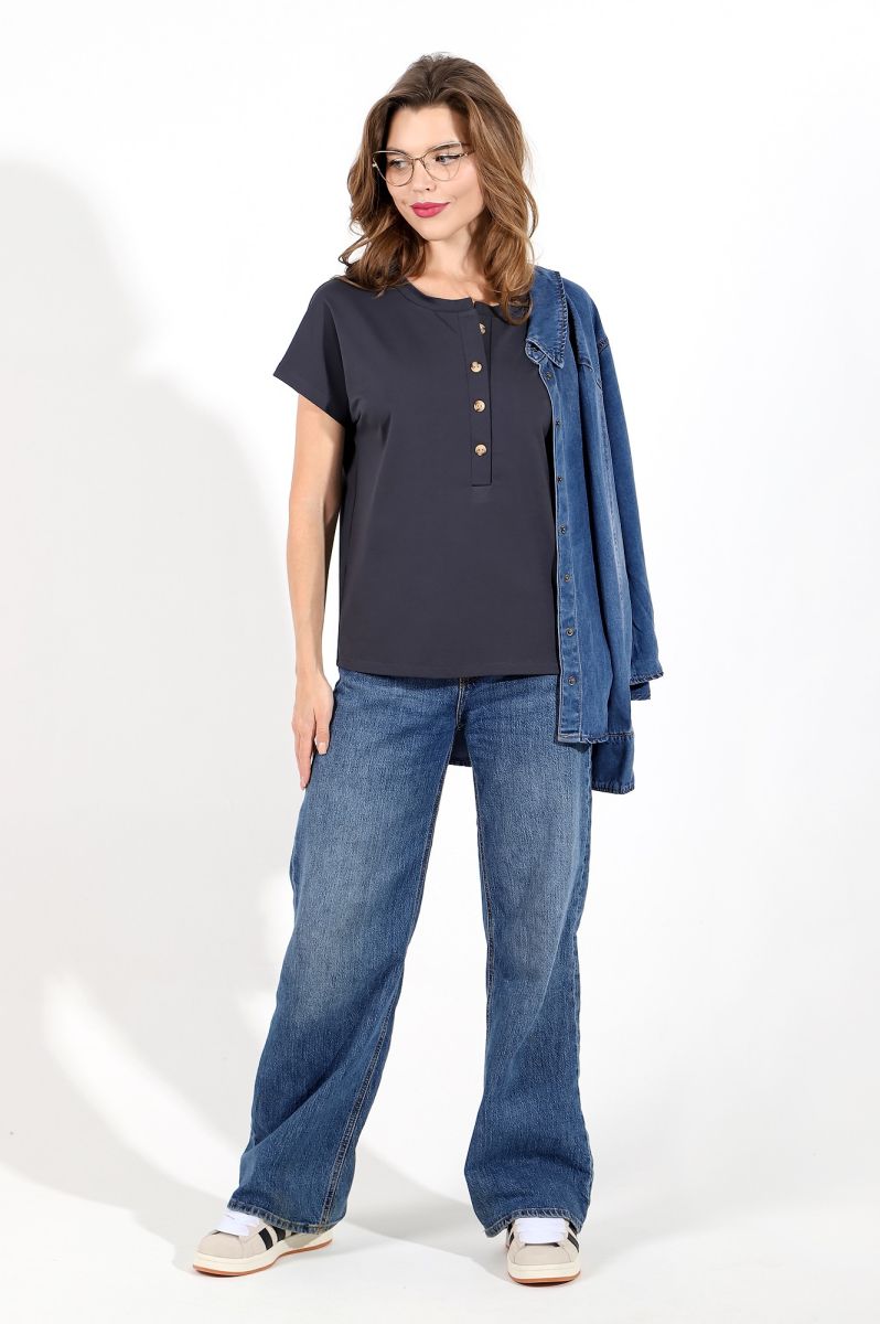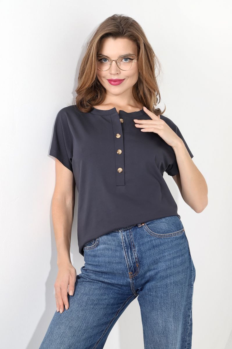 Футболка женская из гладкокрашенного полотна «кулирка» с лайкрой, с цельнокроеными рукавами, свободного силуэта, с горловиной овальной формы, обработанной притачной планкой, с имитацией застежки на петли и пуговицы.