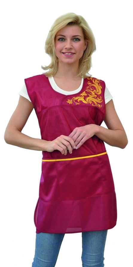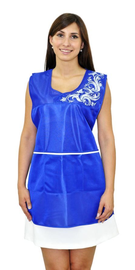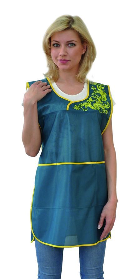 Фартук средней длины, перекидной, имеющий спинку без отделки и полочку с отрезными симметричными кокетками, одна из которых выполнена из материала контрастного цвета с рисунком, нанесенным методом шелкографии. В нижней части полочки расположен вместительный карман с расстрочкой. Объем фартука регулируется завязками-поясами, все срезы фартука обработаны износостойким нейлоновым кантом. Фартук предназначен для защиты от общепроизводственных загрязнений.