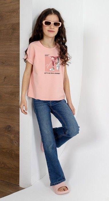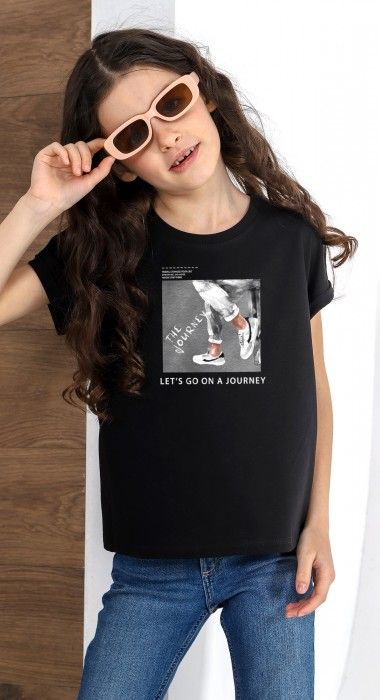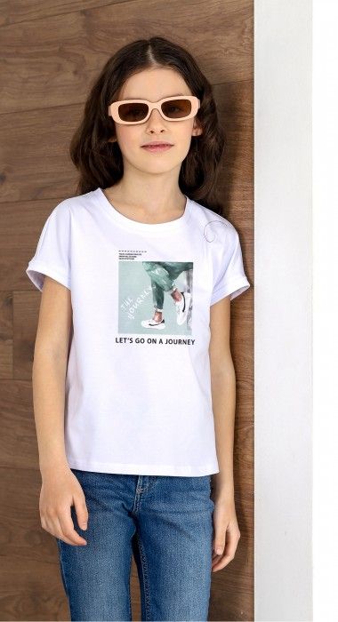 Футболка для девочки, из хлопкового трикотажного полотна с добавлением лайкры. Модель с О-образным вырезом горловины, цельнокроенными короткими рукавами с притачными манжетами с отворотами. Модель дополнена принтом.