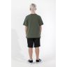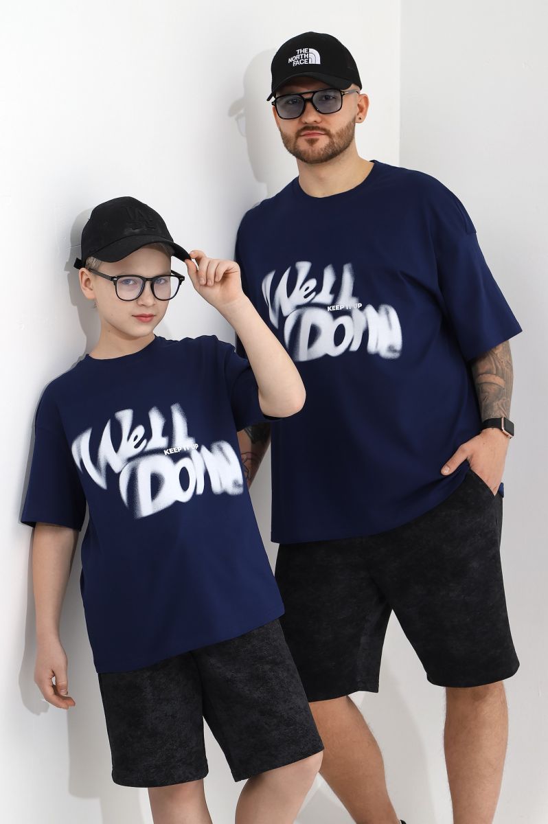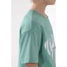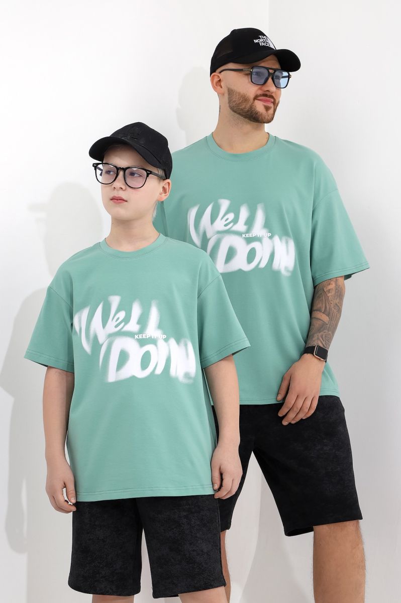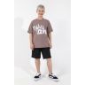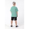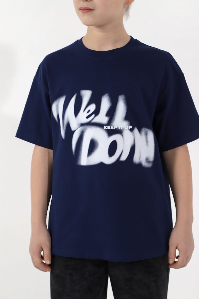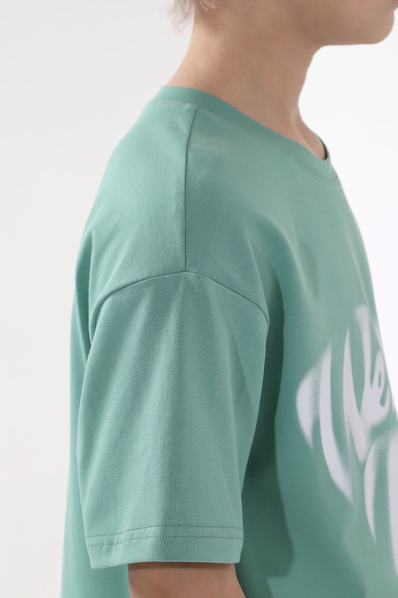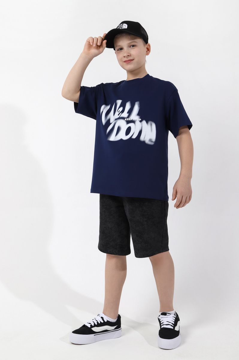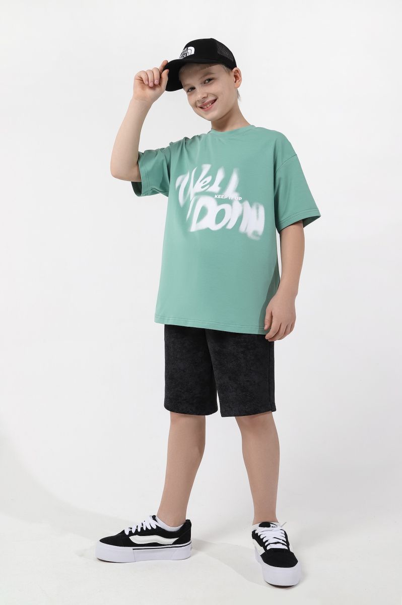 Футболка оверсайз для мальчика из трикотажного полотна: хлопкового с добавлением лайкры. Модель с принтом на переде, спущенной линией плеч, рукавами длиной до локтя.