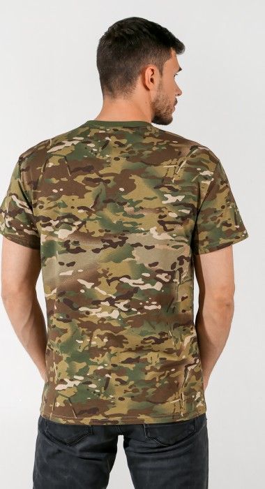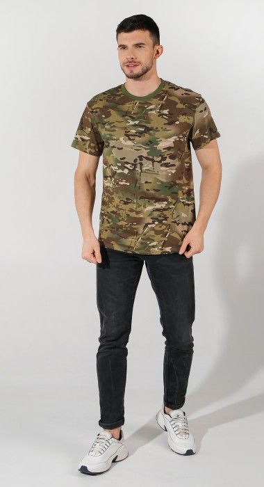 Базовая мужская футболка из "кулирки" с набивным рисунком защитного цвета. Модель со слегка спущенной линией плеч, округлым вырезом горловины, обработаным деталью из рибаны.