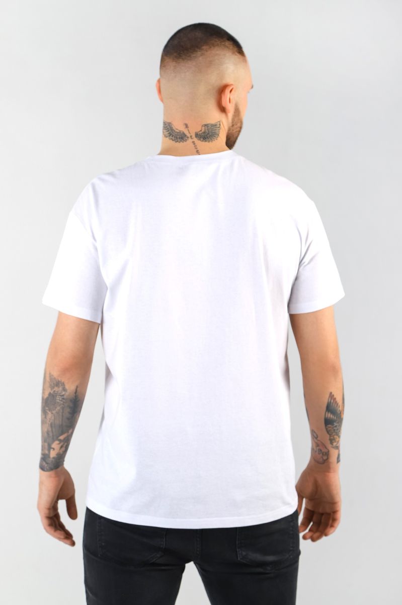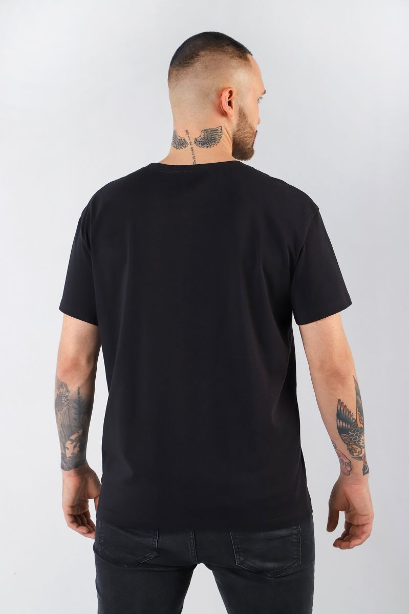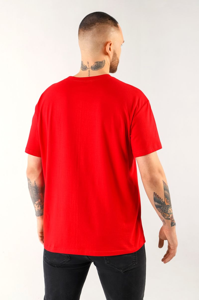 Футболка мужская с короткими рукавами, удлиненными плечевыми швами, горловиной овальной формы, обработанной втачной планкой и принтом на детали переда, выполненным в технике шелкографии. По шву втачивания планки в горловину настрочена отделочная строчка. Нижние срезы руквов и изделия обработаны швом вподгибку.