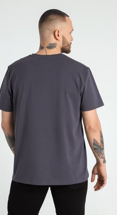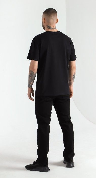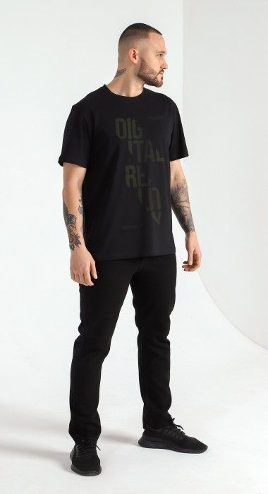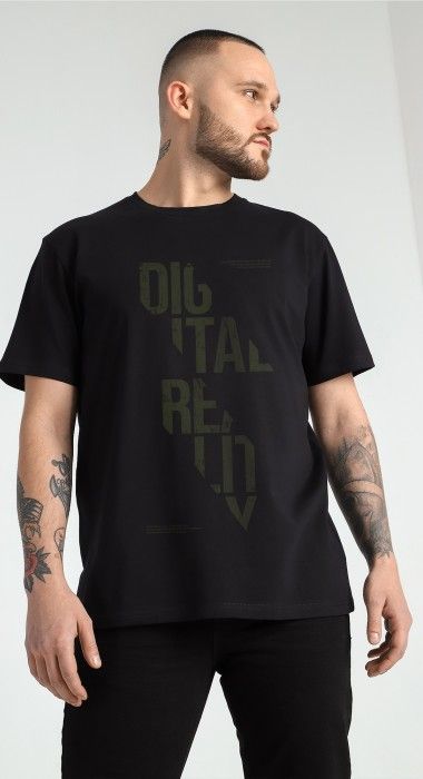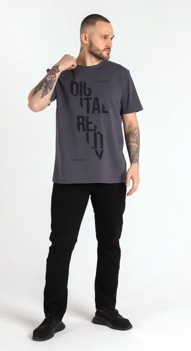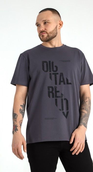 Футболка мужская из гладкокрашеного трикотажного полотна "кулирка" с лайкрой, классическогоь покроя, с коротким втачными рукавами, горловиной овальной формы, обработанной втачной планкой и принтом на полочке, выполненным в технике шелкографии.