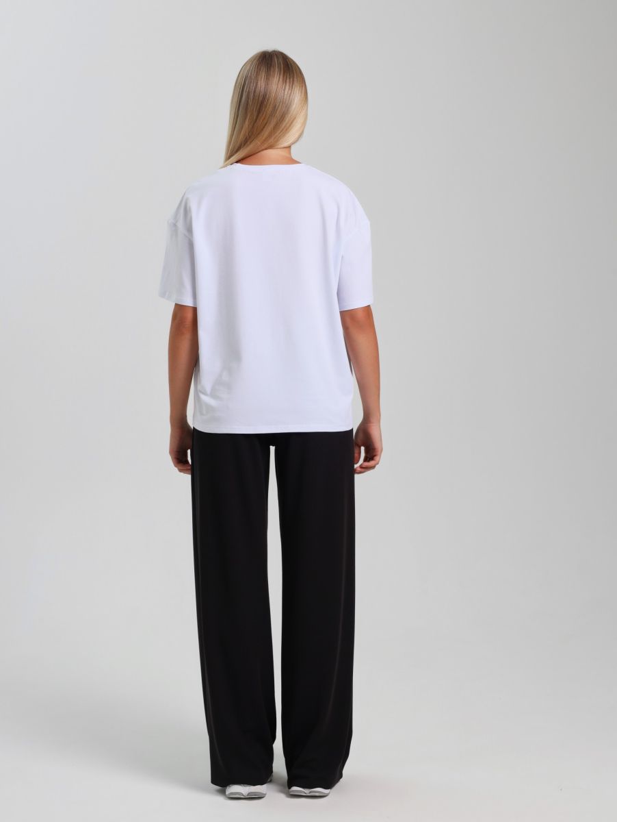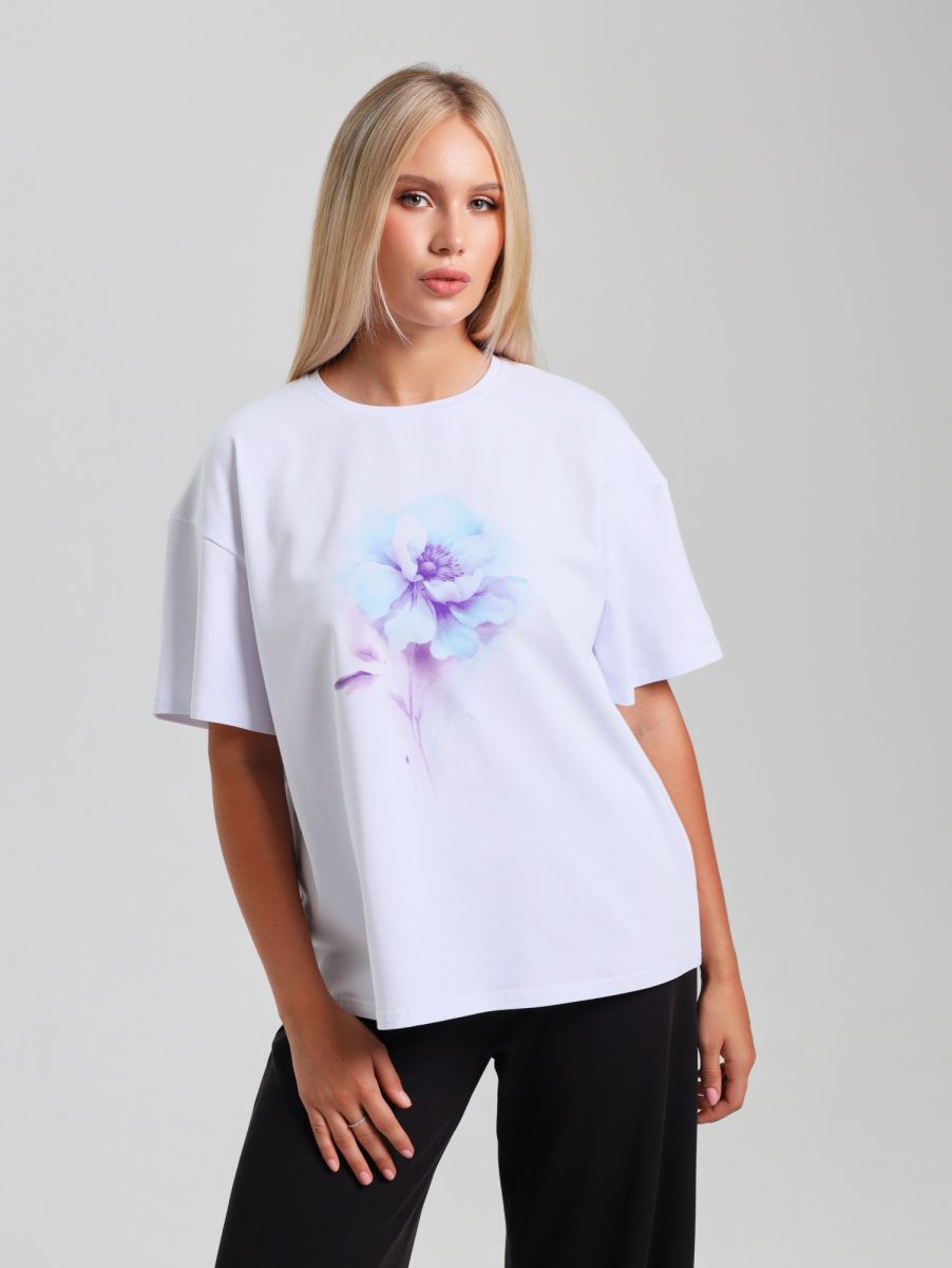 Футболка женская из гладкокрашеного трикотажного полотна «кулирка с лайкрой», классического покроя, с втачными короткими рукавами и печатью на полочке, выполненной в технике «шелкографии». Горловина овальной формы обработана втачной планкой с отделочной строчкой по шву притачивания.