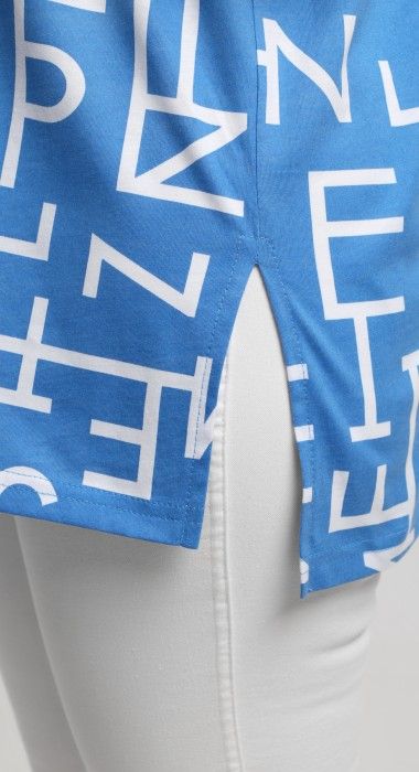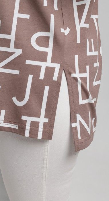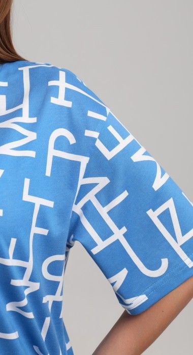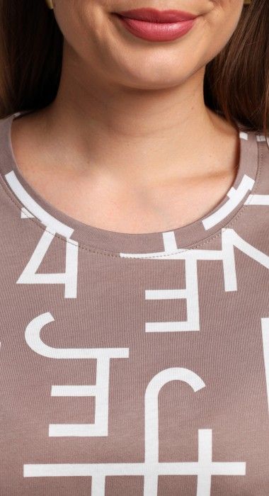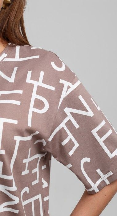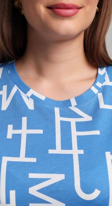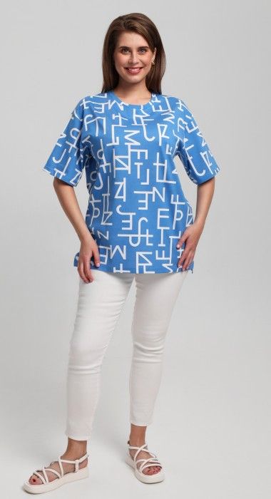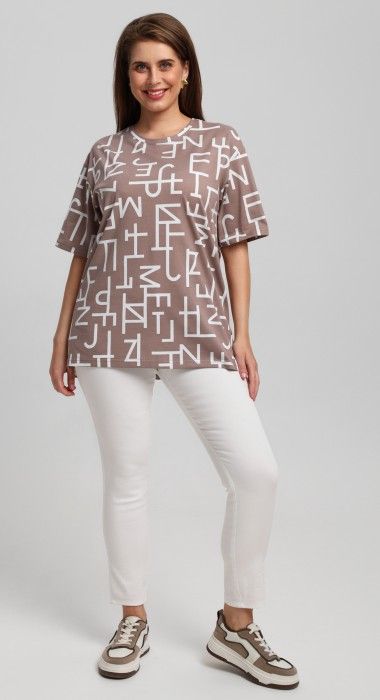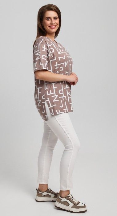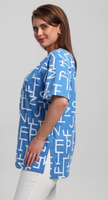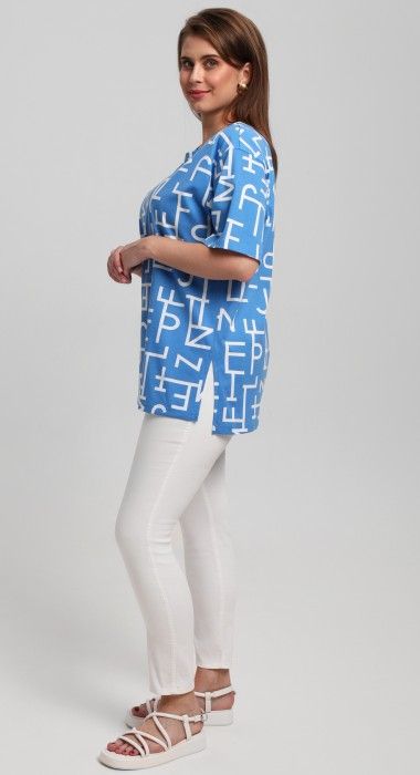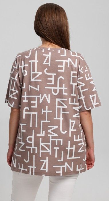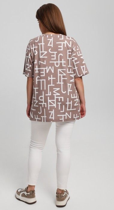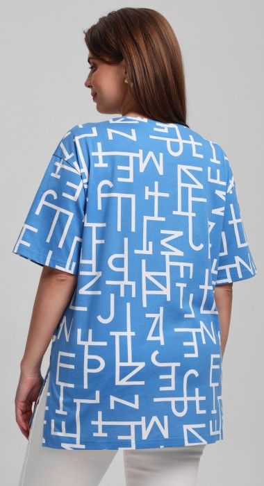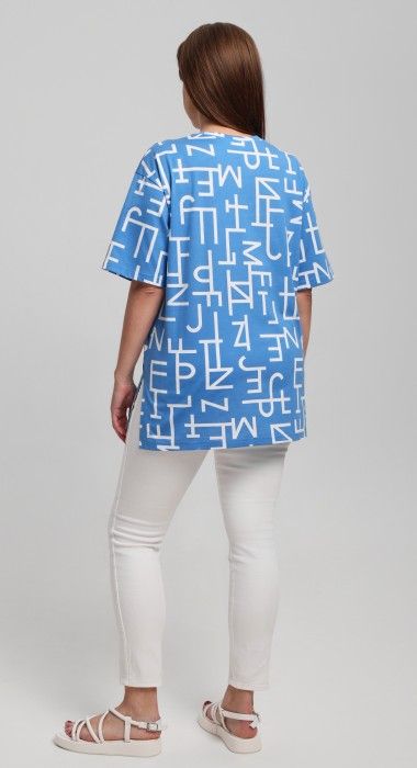 Футболка женская из трикотажного полотна «кулирка» с набивным рисунком, свободного покроя, со спущенным плечом и втачными рукавами длиной до локтя, горловиной овальной формы, обработанной притачной бейкой, в нижней части боковых швов – разрезы.