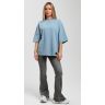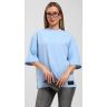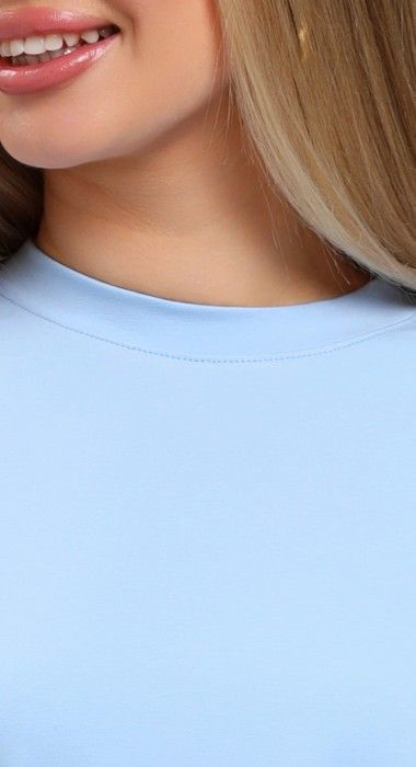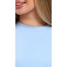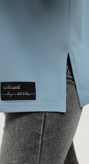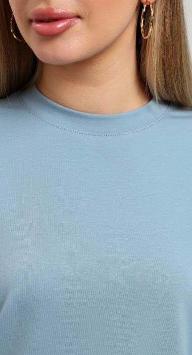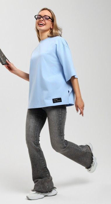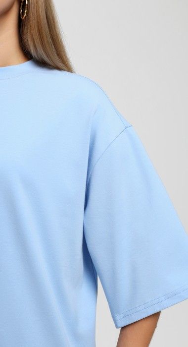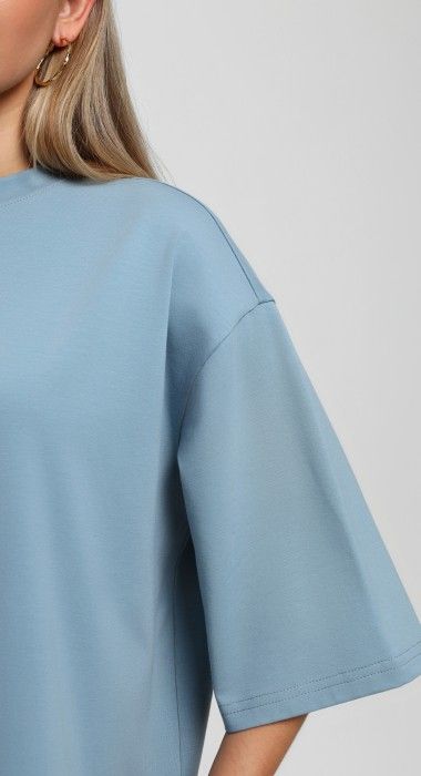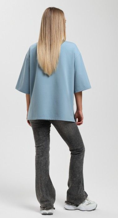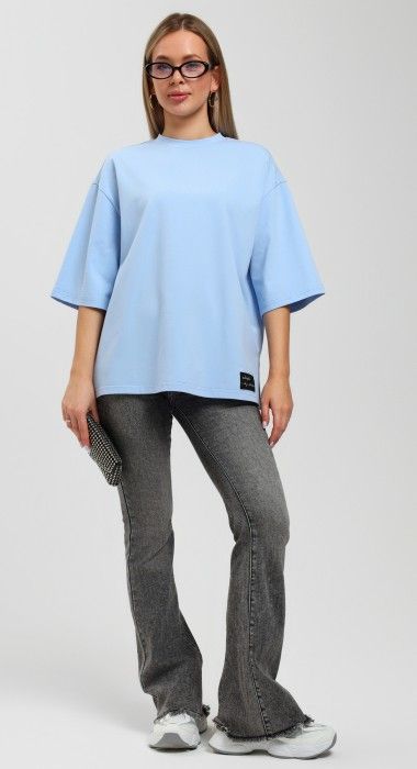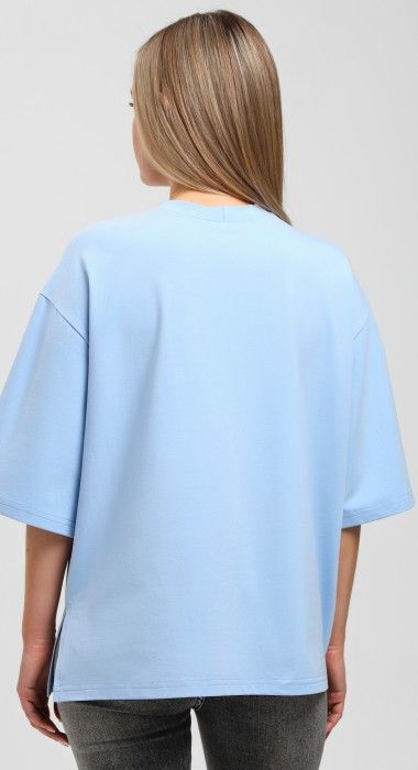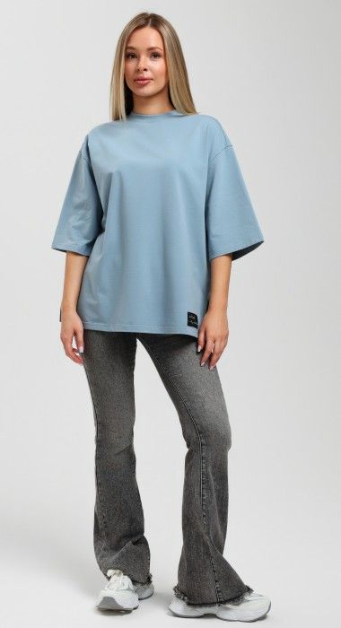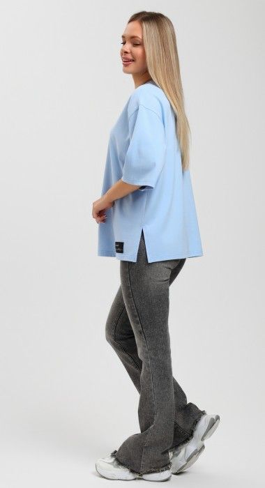 Футболка молодежная из гладкокрашенного полотна «кулирка с лайкрой», свободного покроя, со спущенной линией плеча, втачными рукавами длиной до локтя, горловиной овальной формы, обработанной втачной планкой. Изделие дополнено декоративной нашивкой, в боковых швах выполнены разрезы.